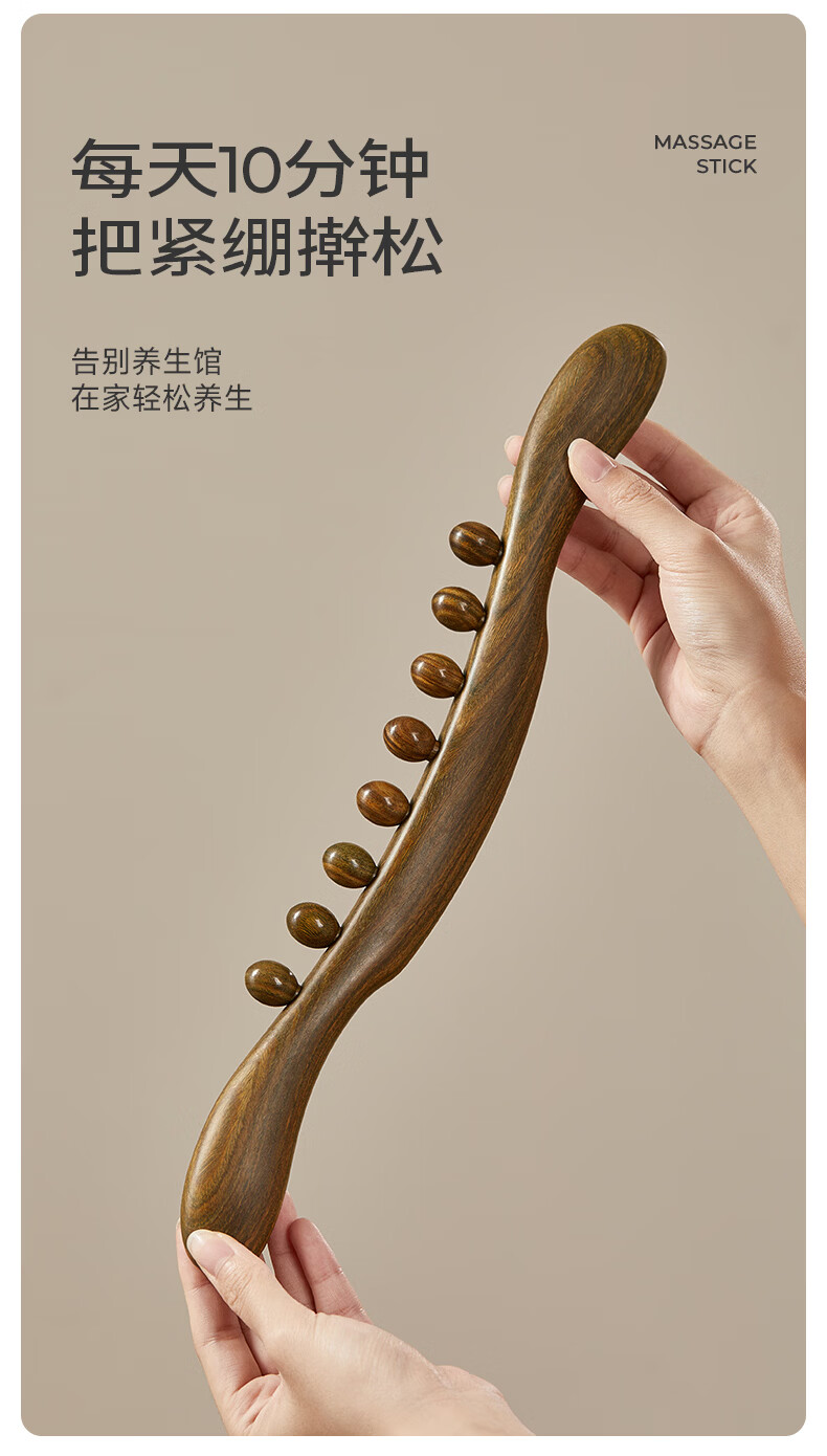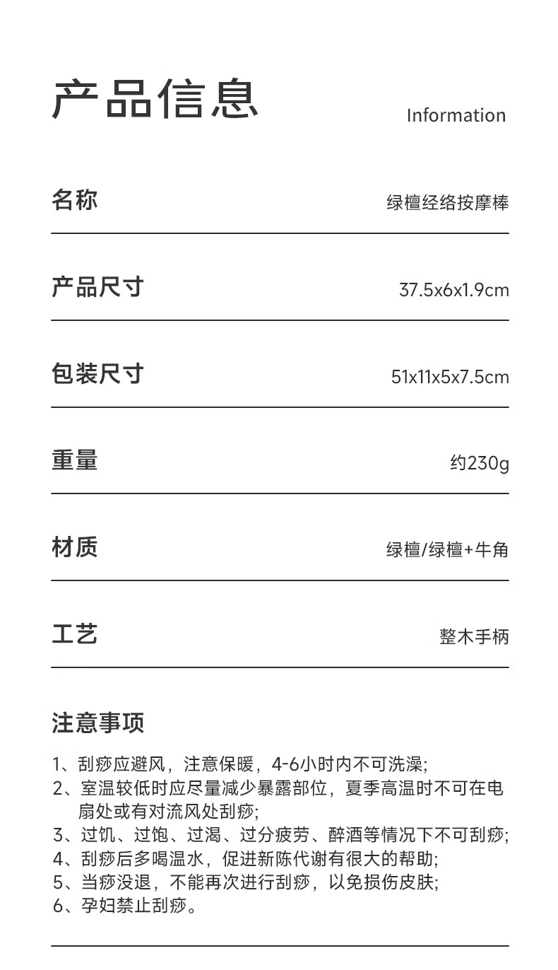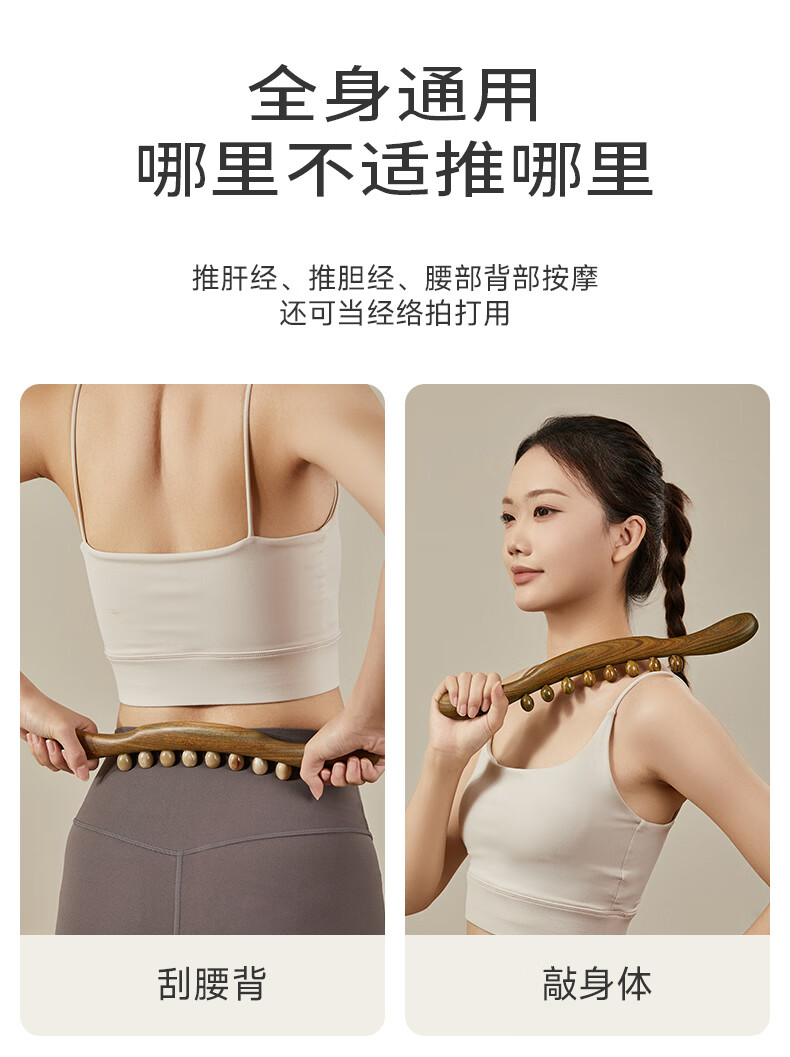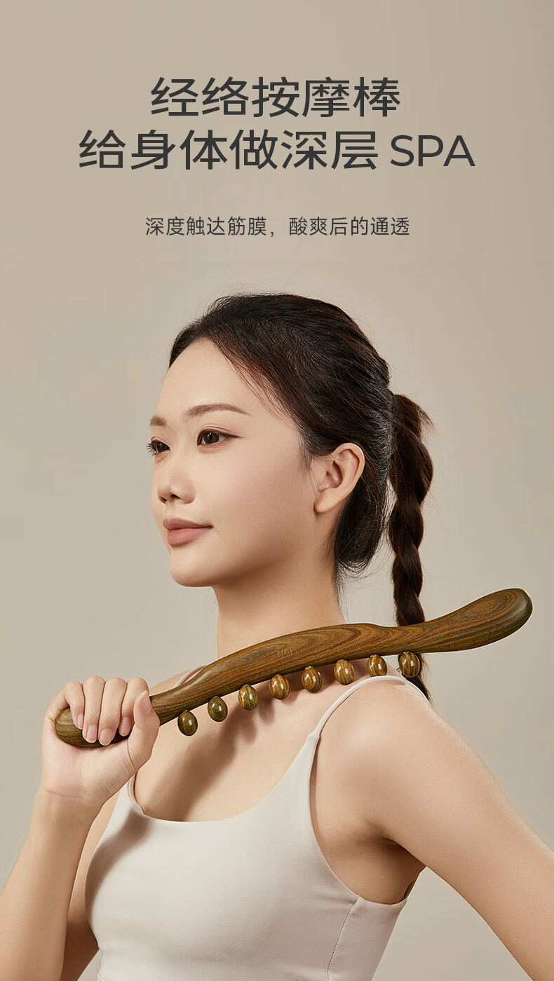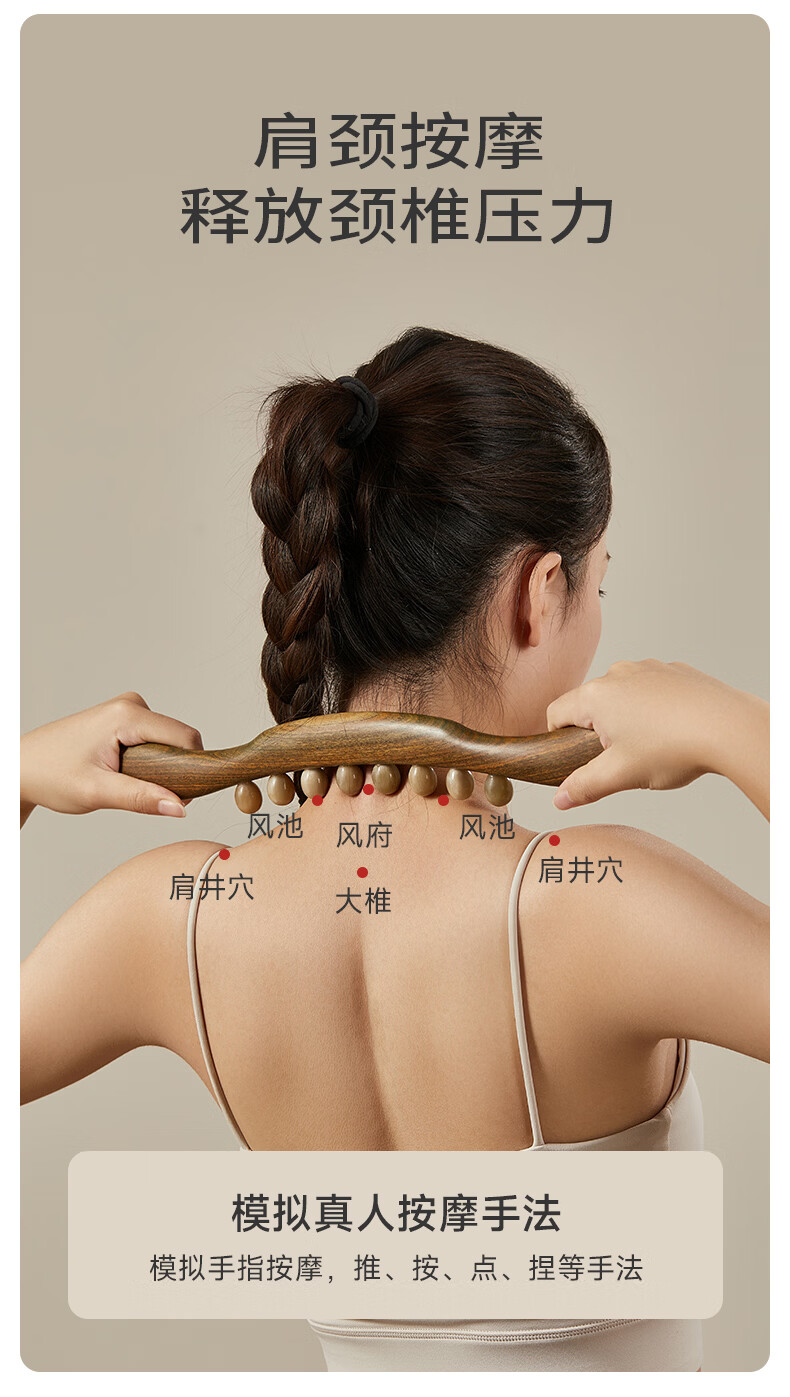 初心绿檀木擀筋棒按摩刮痧肩颈腹部经络疏通推背开背 经络按摩棒-绿檀+牛角齿
