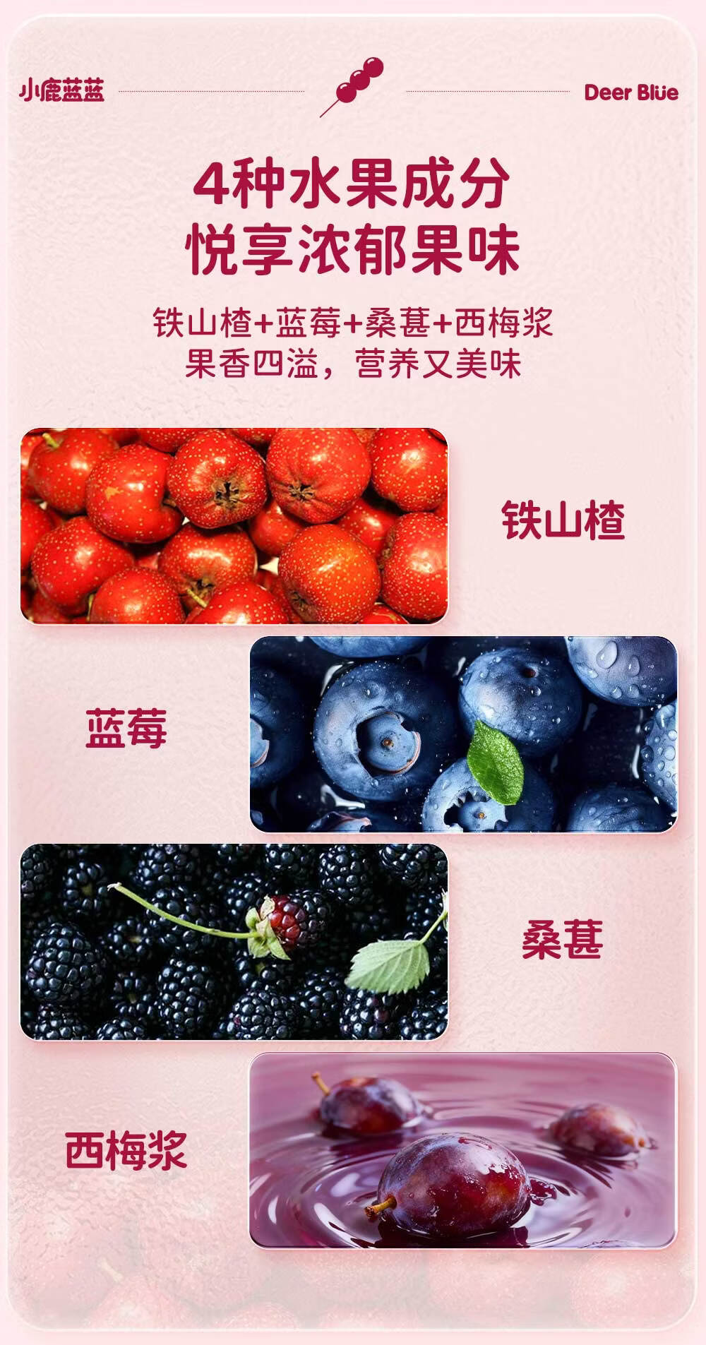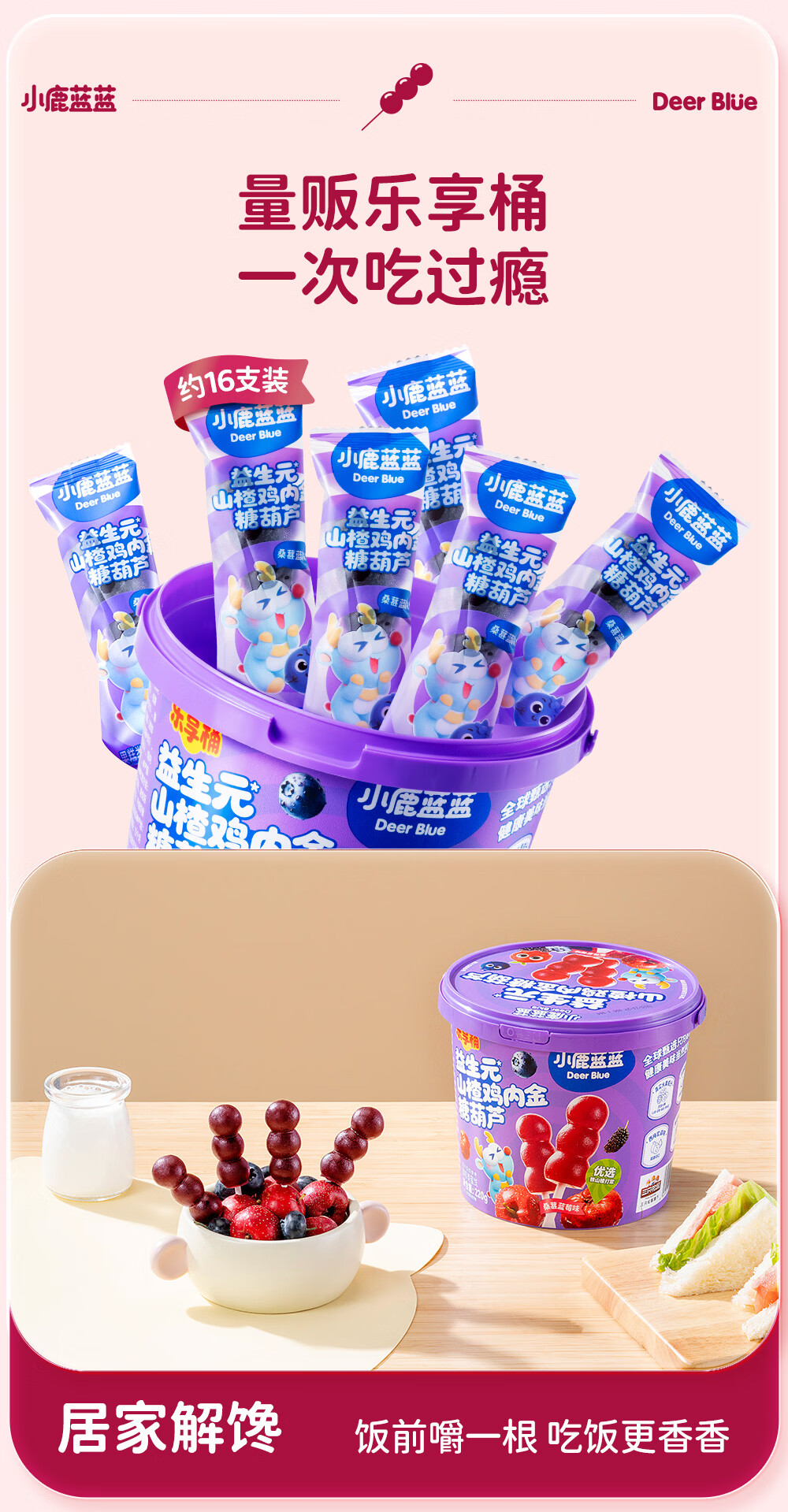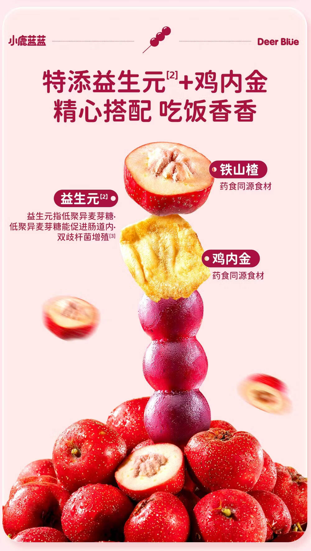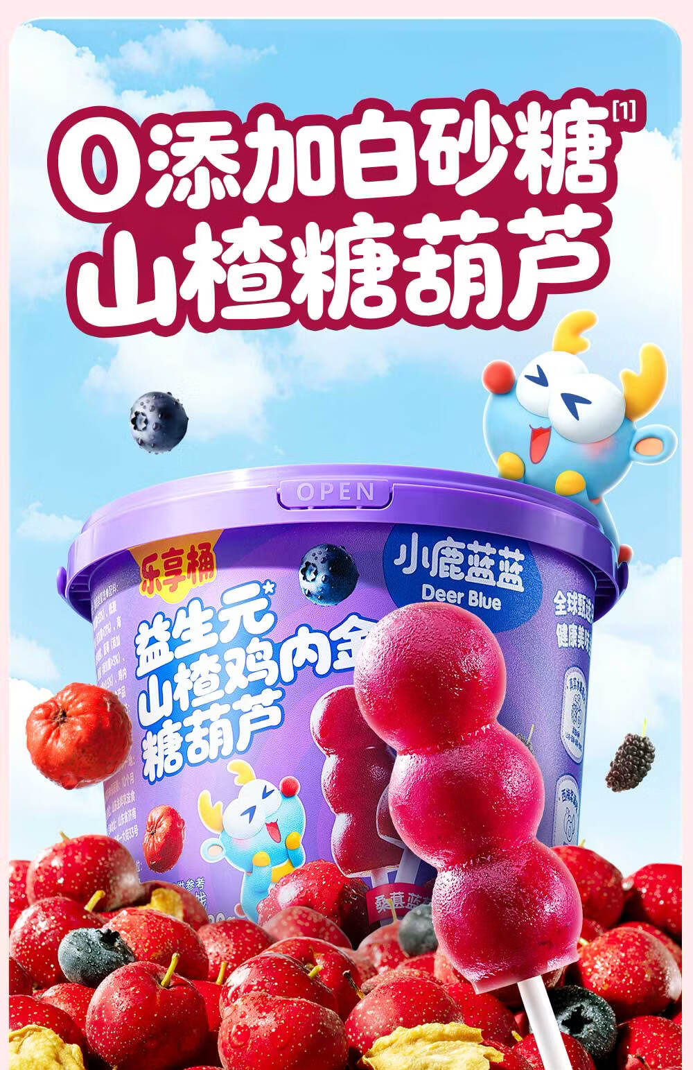 小鹿蓝蓝0添加蔗糖 益生元山楂鸡内金糖葫芦宝宝儿童山楂棒桑葚蓝莓味220g