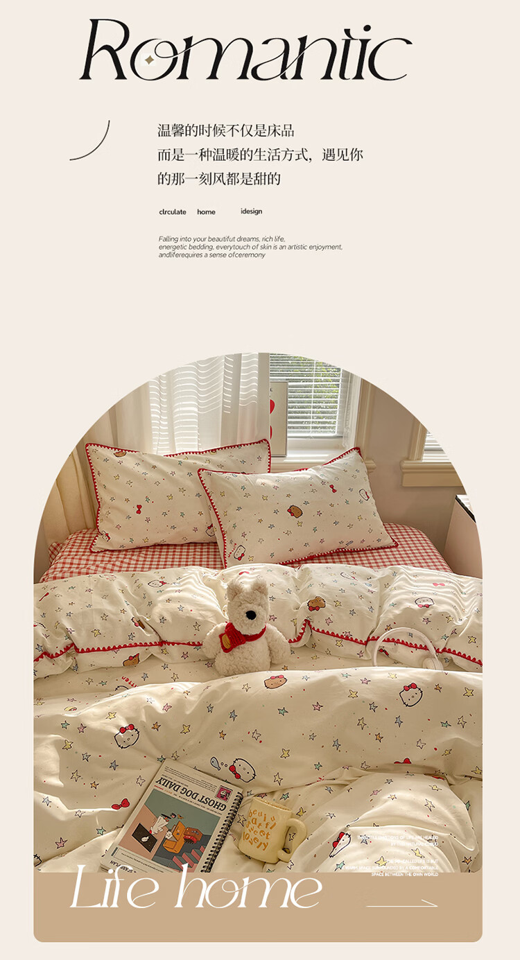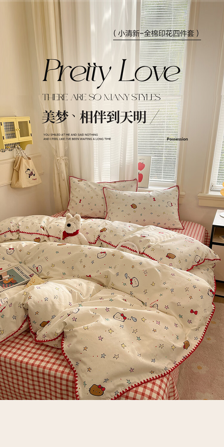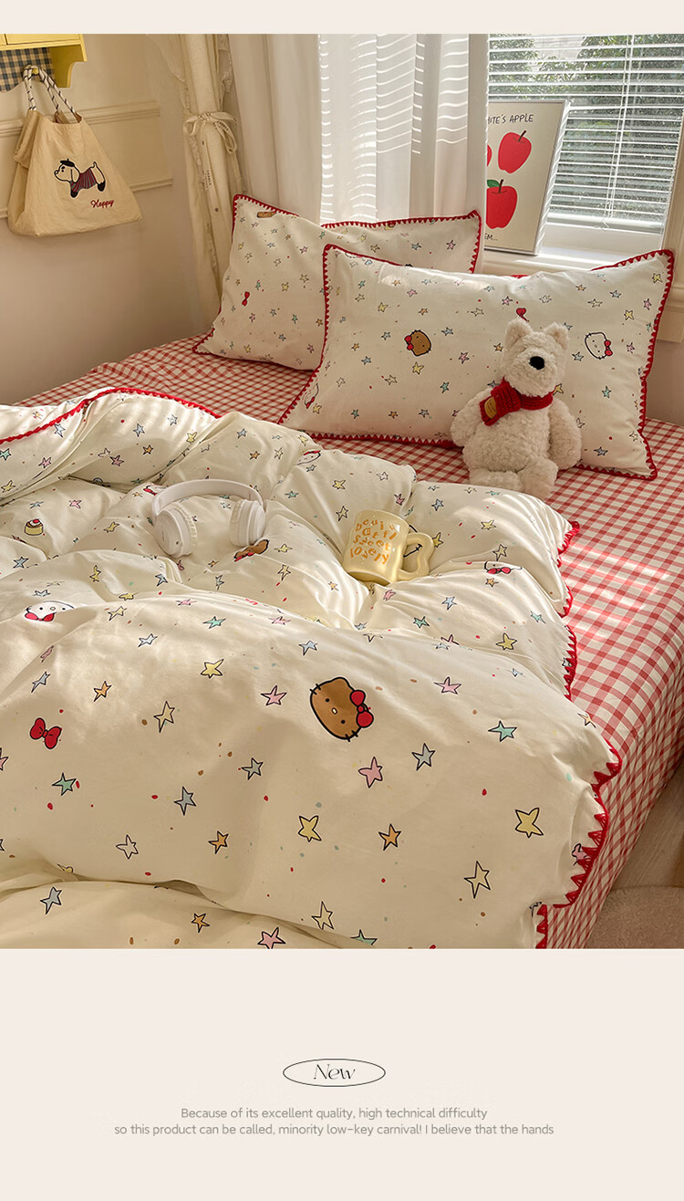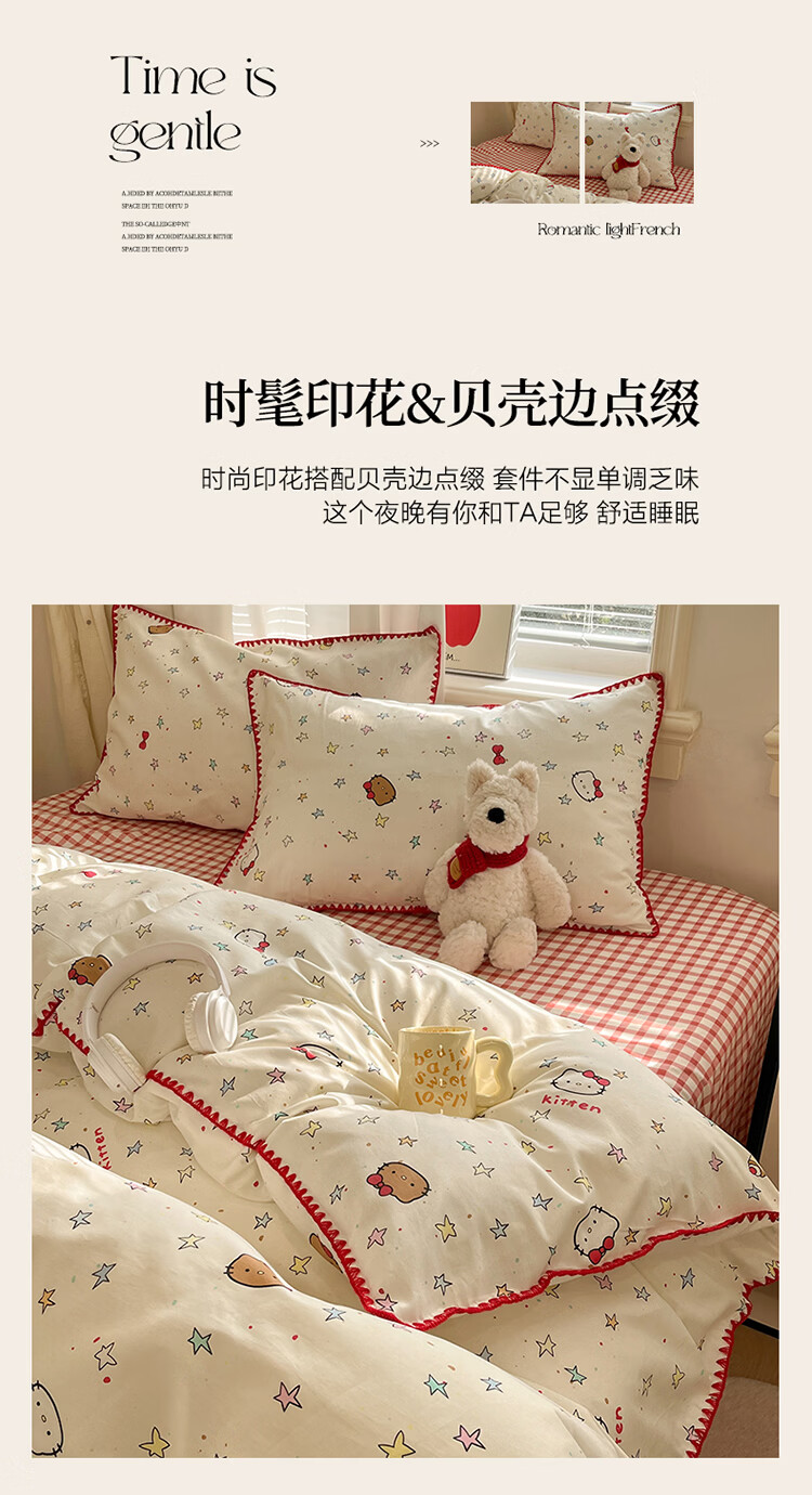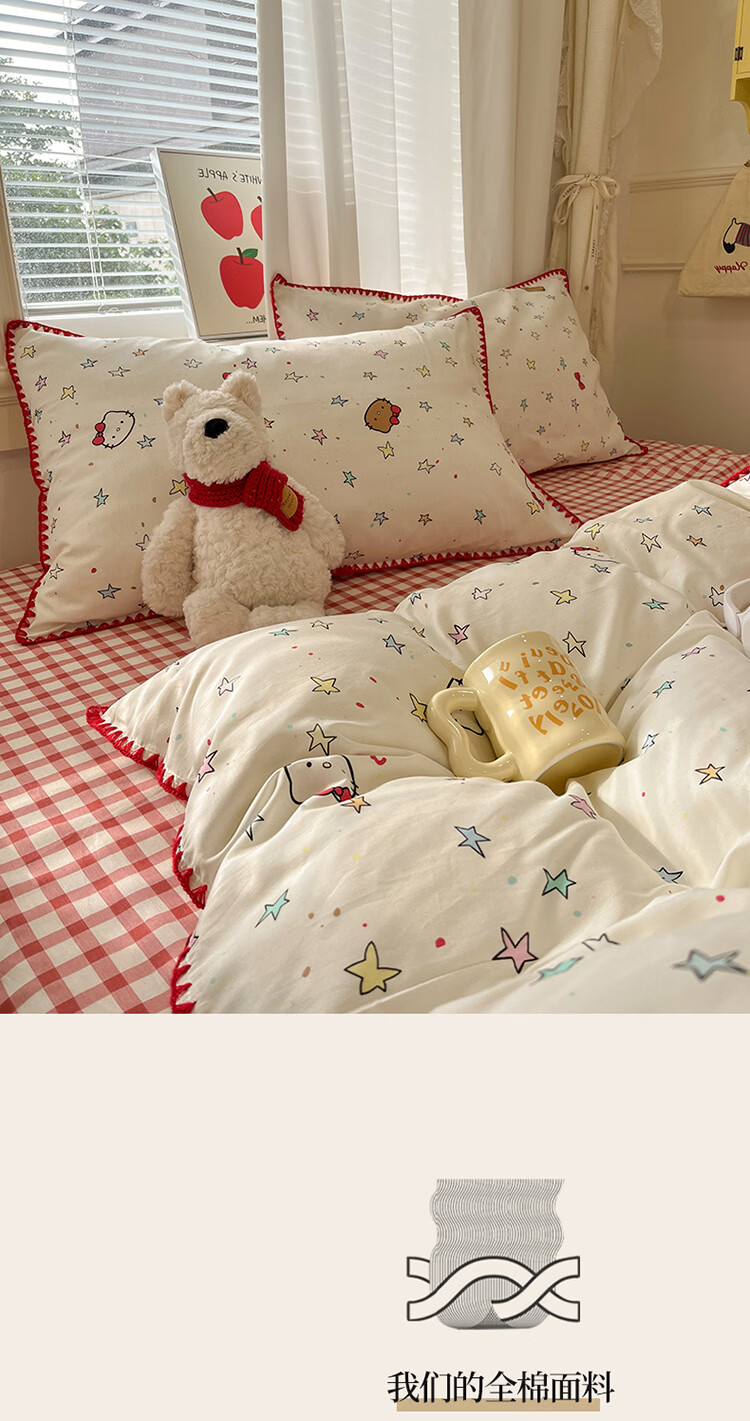 无印良品卡通风纯棉床单四件套全棉裸睡床上用品被套床笠款四季通用三件套 星星猫【全棉贝壳边 亲肤柔软】 1.8m 床笠款 四件套-被套200*230cm
