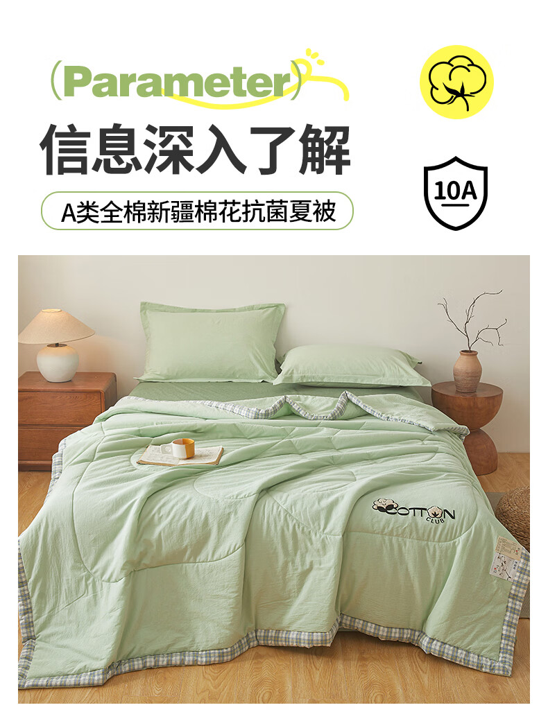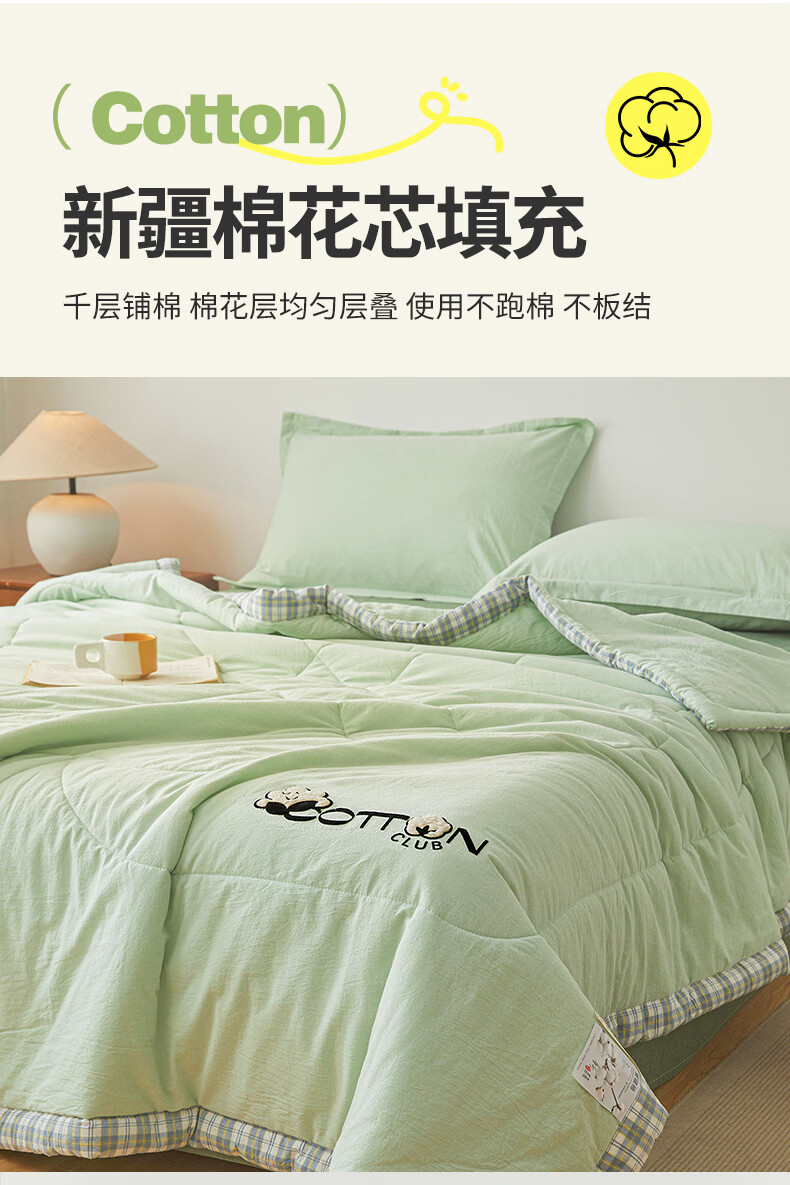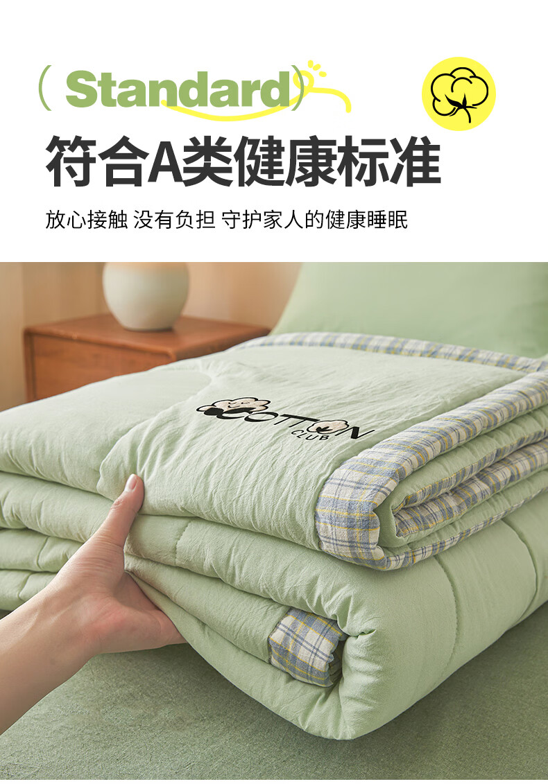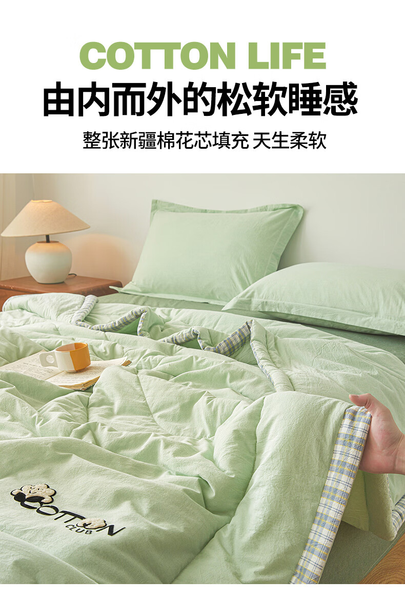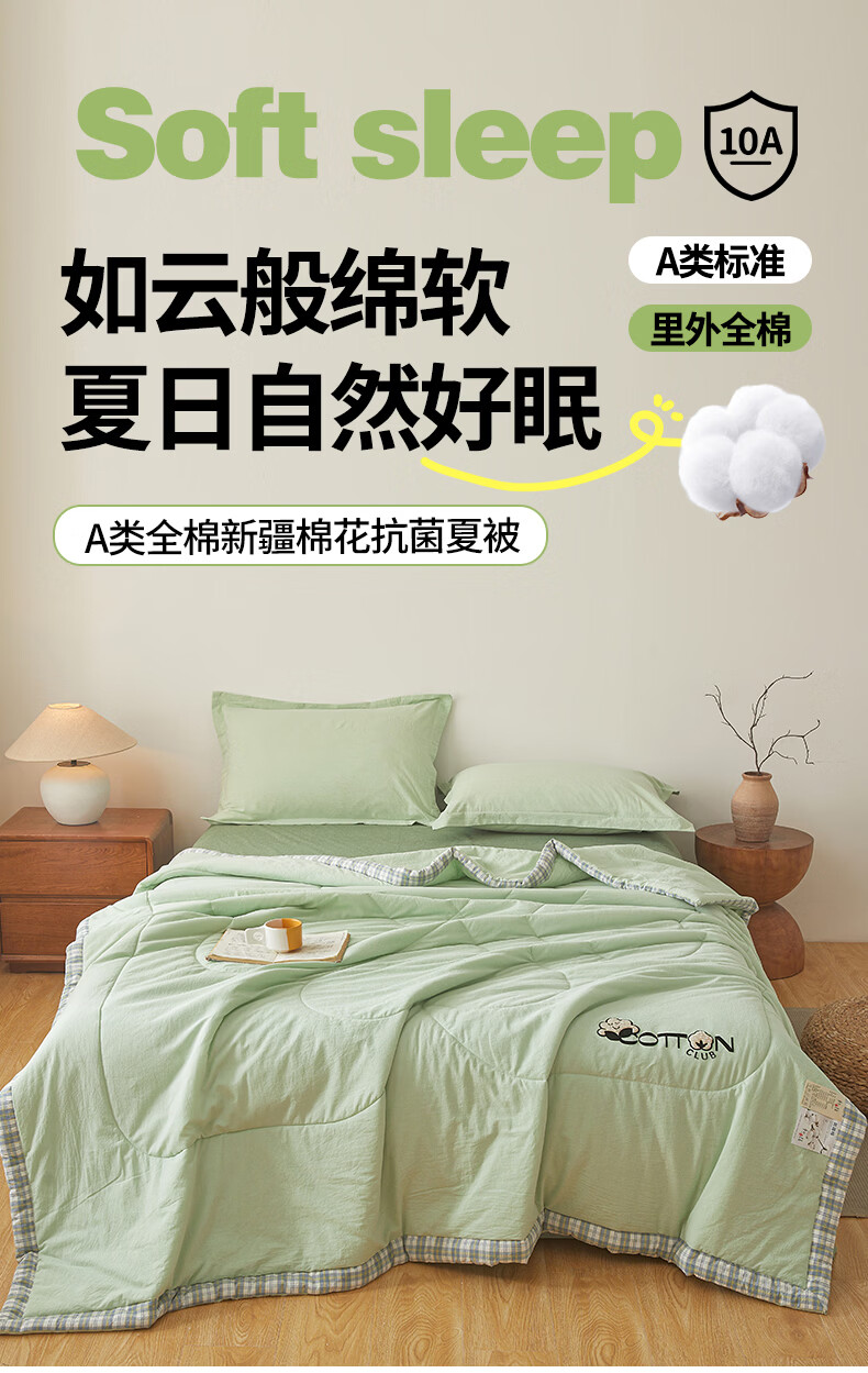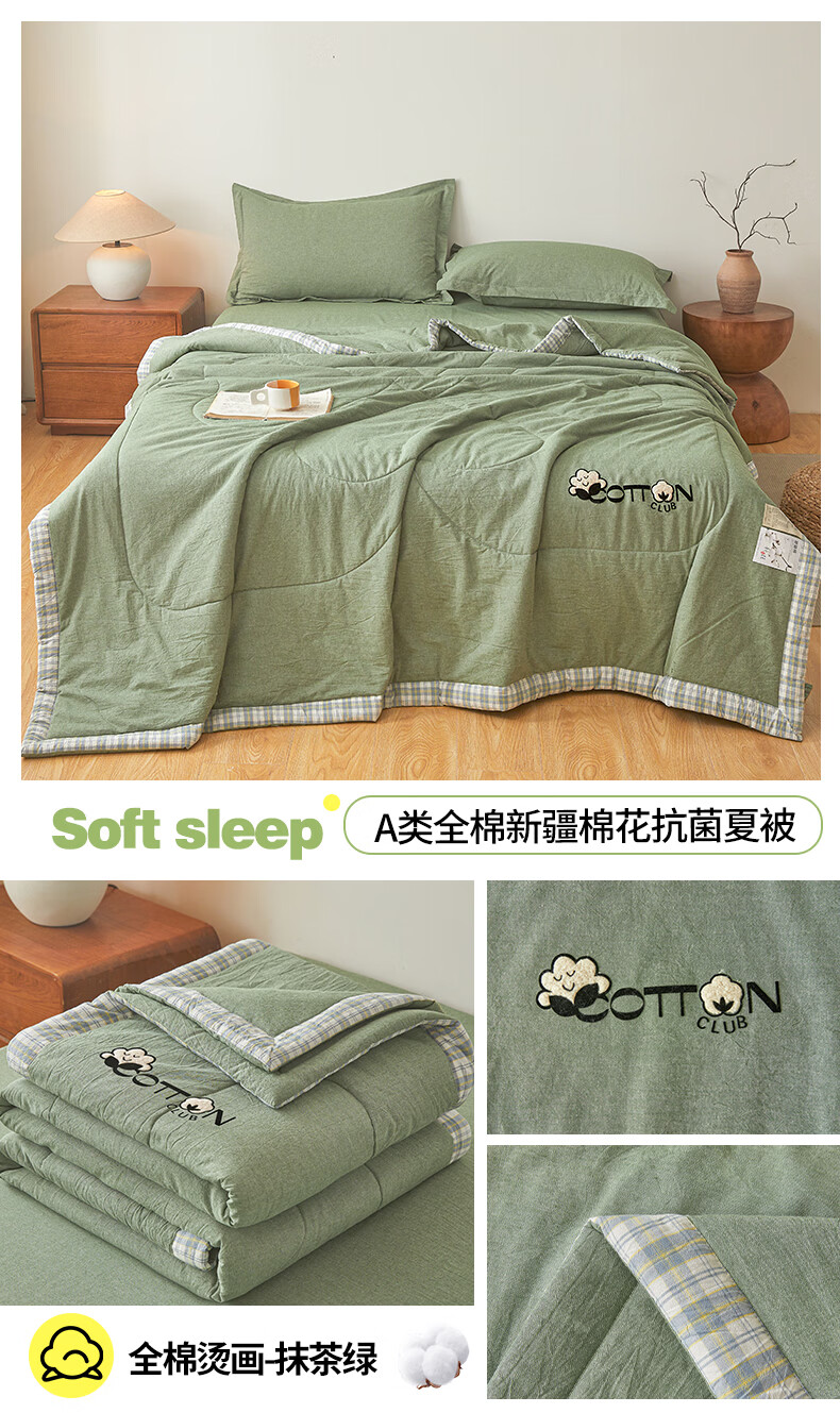 一默棉花被纯棉新疆棉花抗菌夏被2026春夏薄被子A类全棉空调被夏凉被 全棉烫画-清新绿 150x200cm