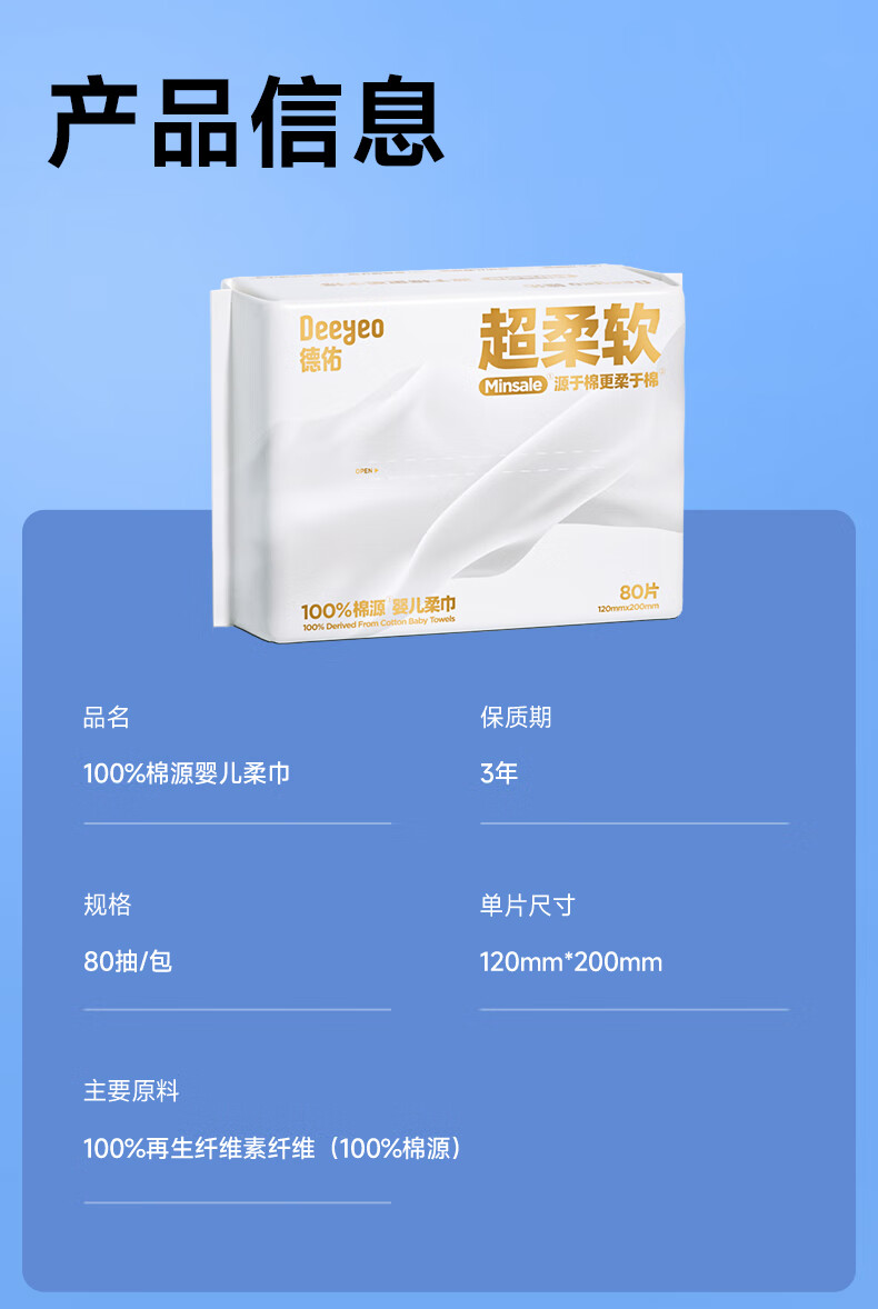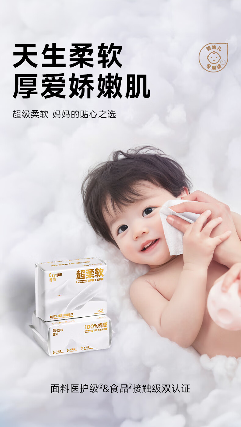 德佑超柔软100%新疆棉源柔巾婴儿洗脸巾干湿两用新生儿专用80抽1包