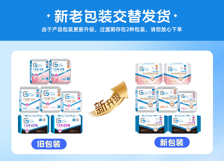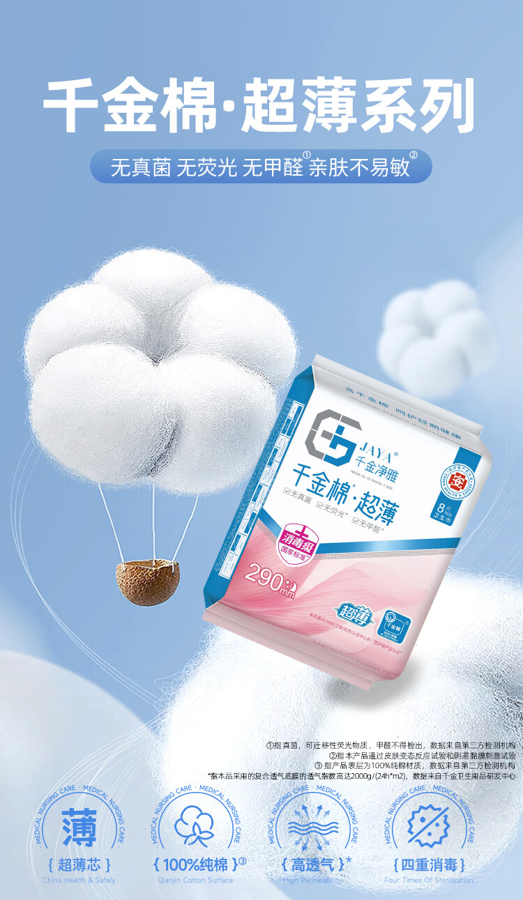 千金净雅超薄纯棉透气夜用组合卫生巾290mm*8片*1包京东自营姨妈巾消毒级