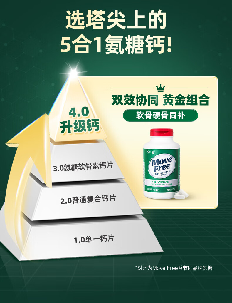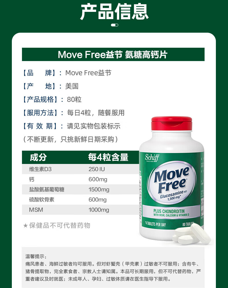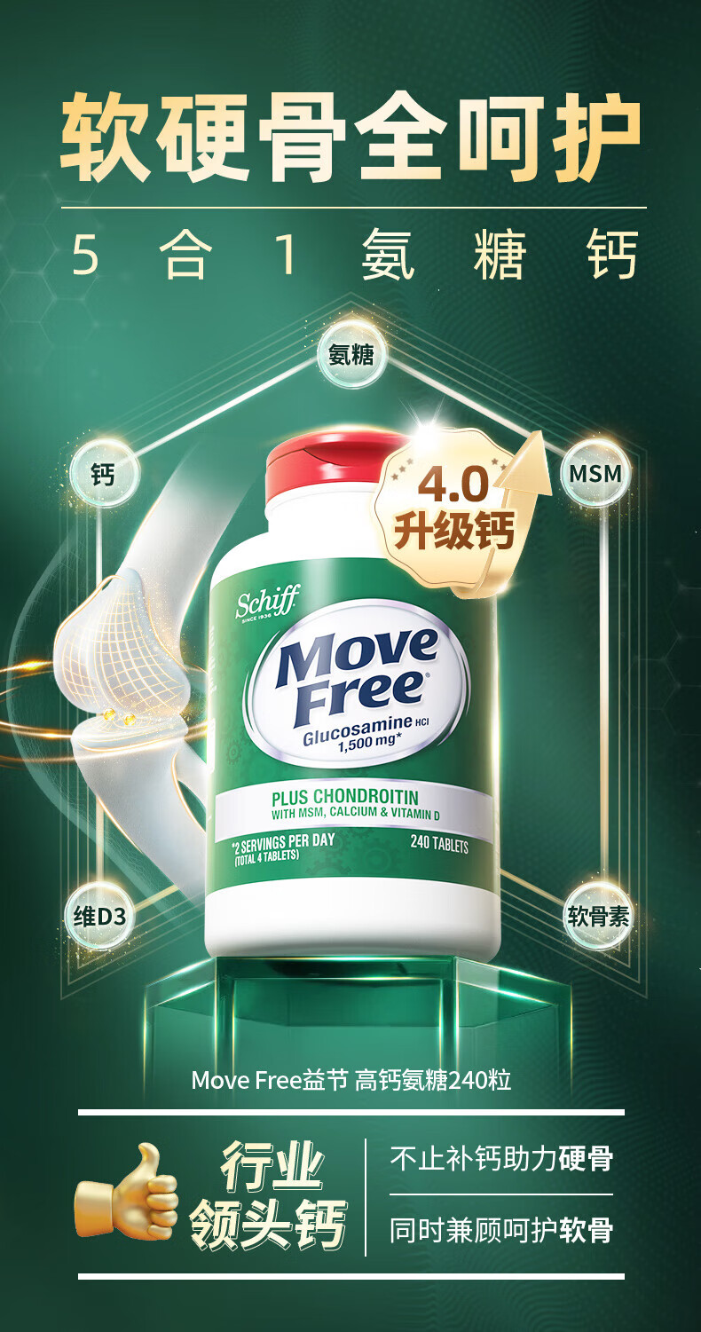 益节(Move Free)氨糖软骨素钙片 美国原装进口 维骨力中老年人 【会员福利】高钙氨糖 80粒*2瓶
