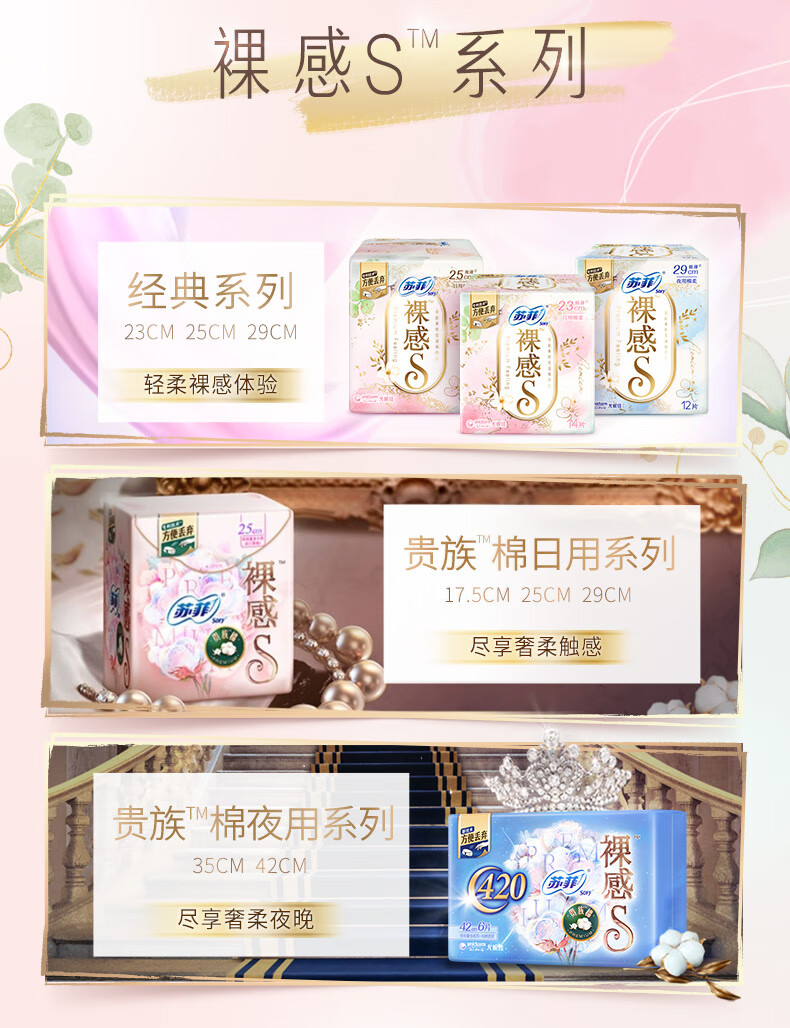 苏菲卫生巾 裸感S贵族棉超薄230/250日用夜用组合量多姨妈巾整箱组合 【36片】贵族棉250mm36片