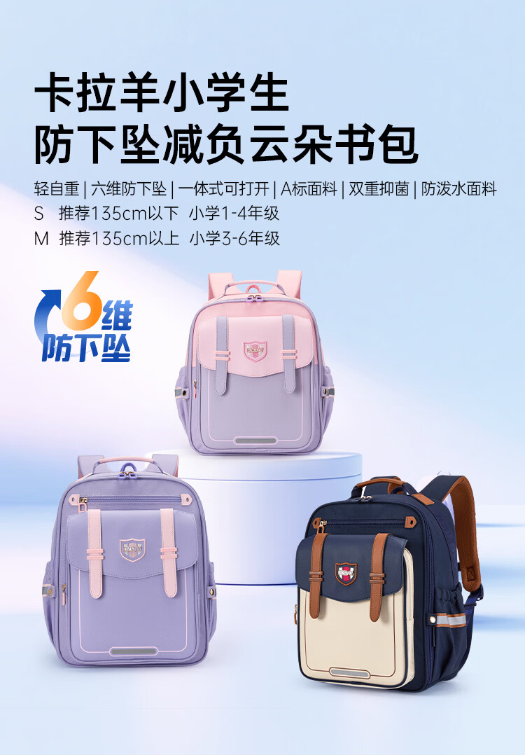 卡拉羊书包小学生1-3-6年级6维减负防下坠云朵书包护脊儿童背包 【薰衣草紫】精美礼盒包装 【大号】3-6年级推荐,身高135cm以上