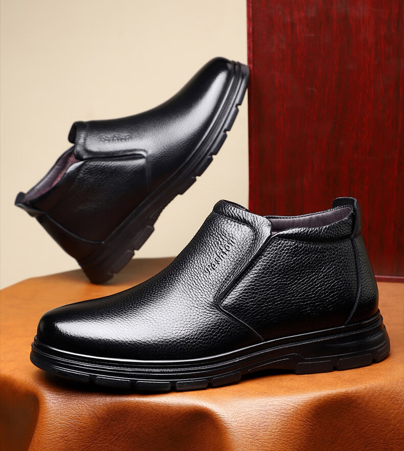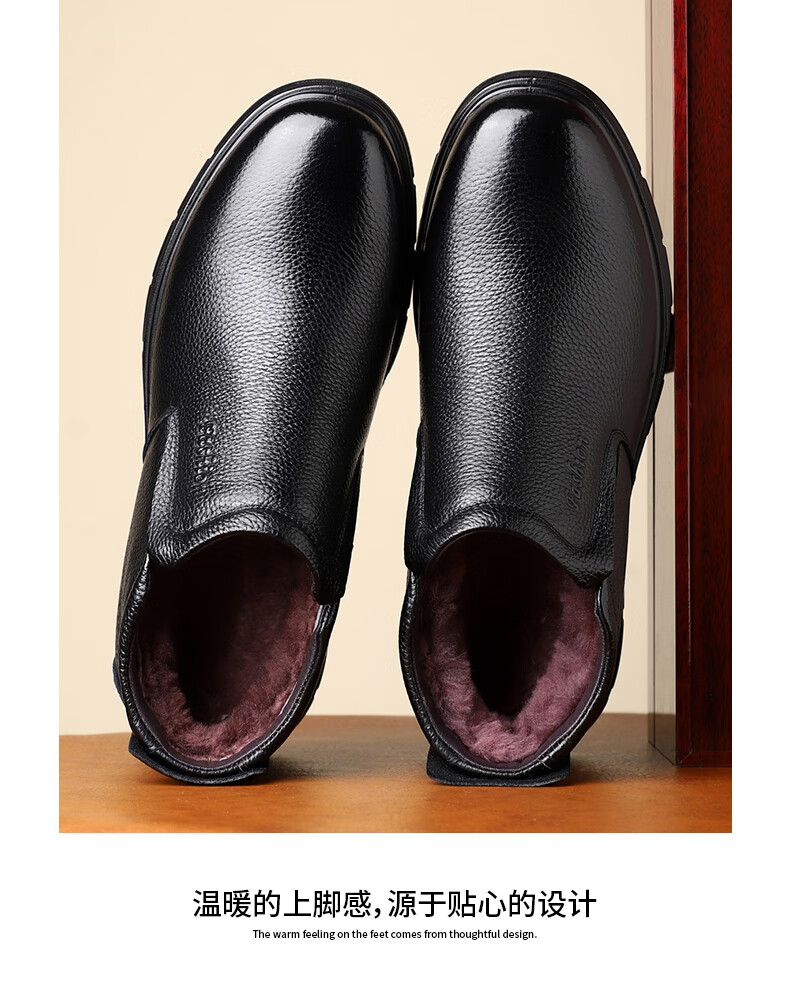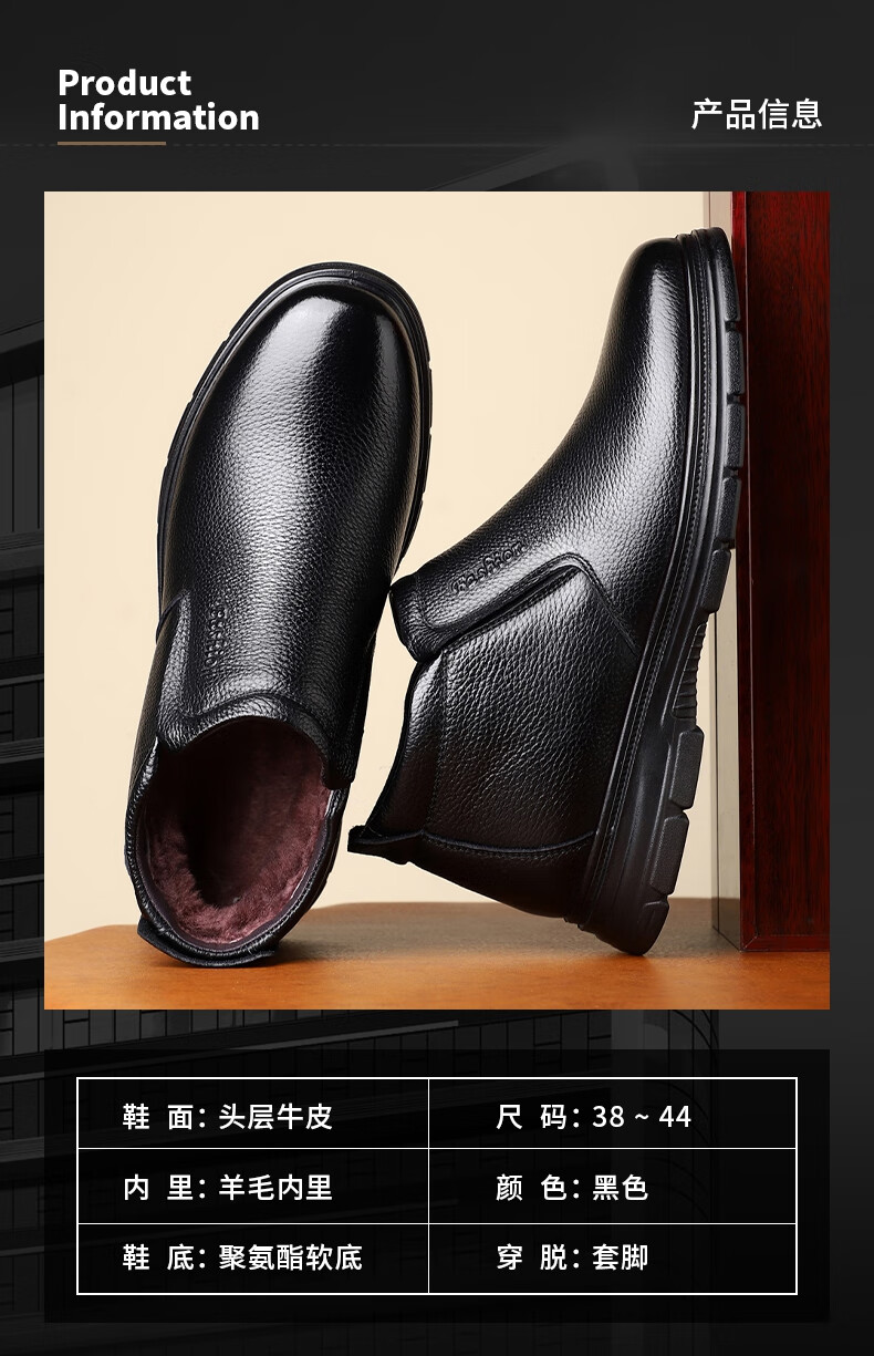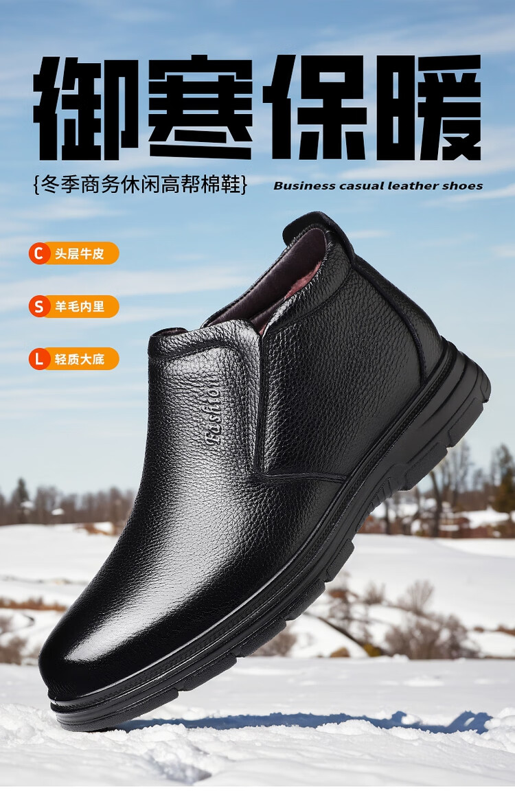 稻草人(MEXICAN)纯羊毛雪地棉鞋一脚蹬男鞋冬季加绒高帮皮鞋保暖爸爸加厚冬鞋真皮 黑色 38
