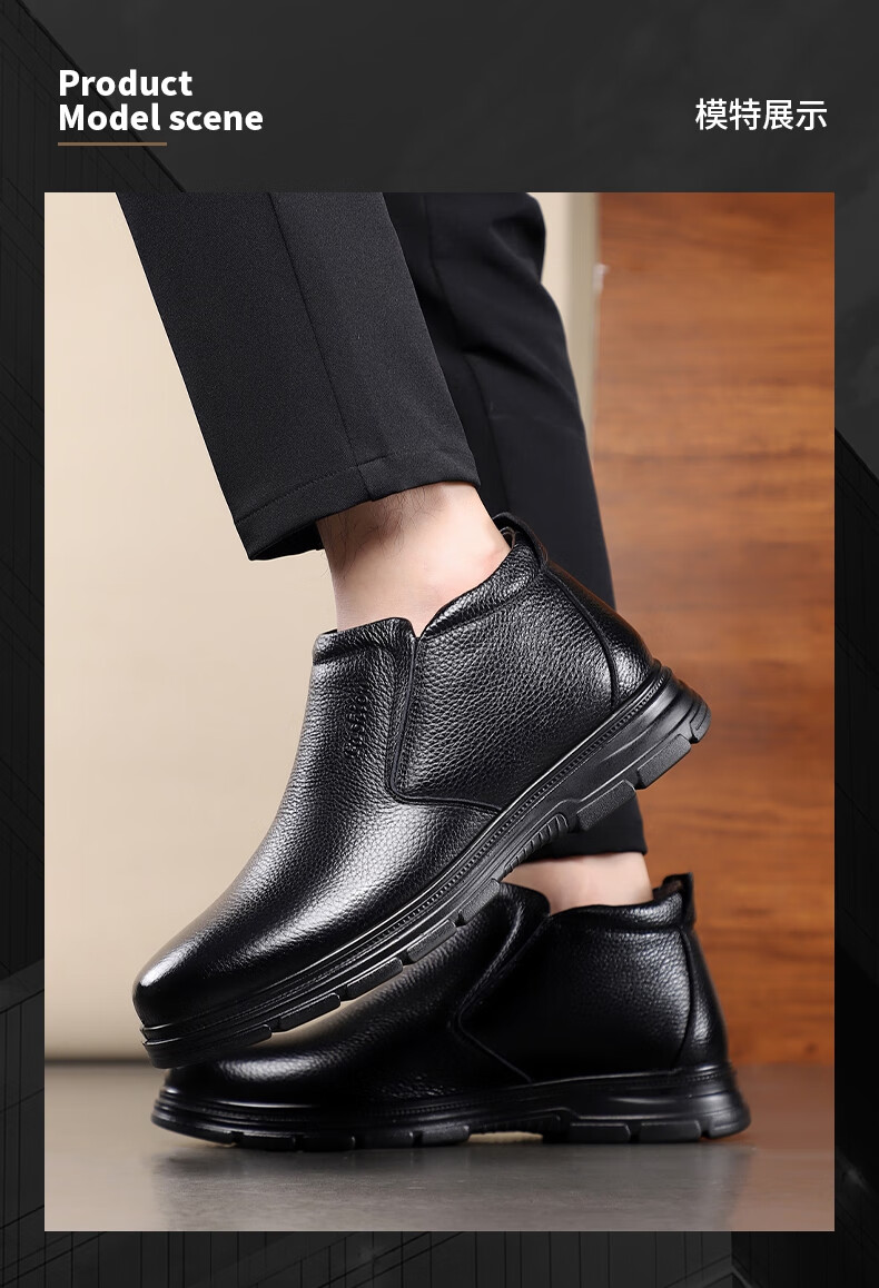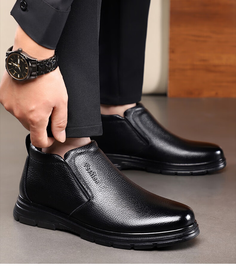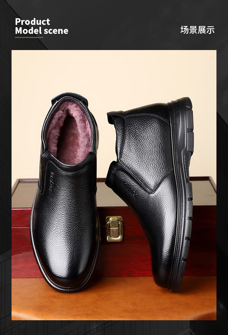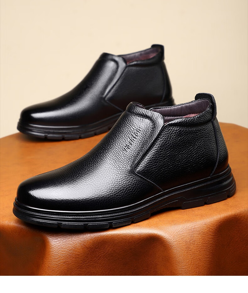 稻草人(MEXICAN)纯羊毛雪地棉鞋一脚蹬男鞋冬季加绒高帮皮鞋保暖爸爸加厚冬鞋真皮 黑色 38