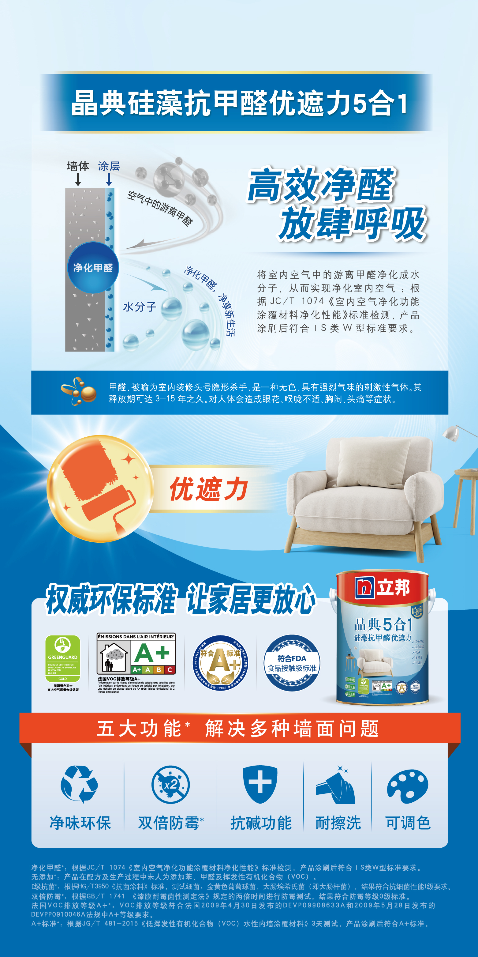 立邦【同城购】晶典硅藻抗甲醛优遮力5合1内墙乳胶漆 5L【单桶装】