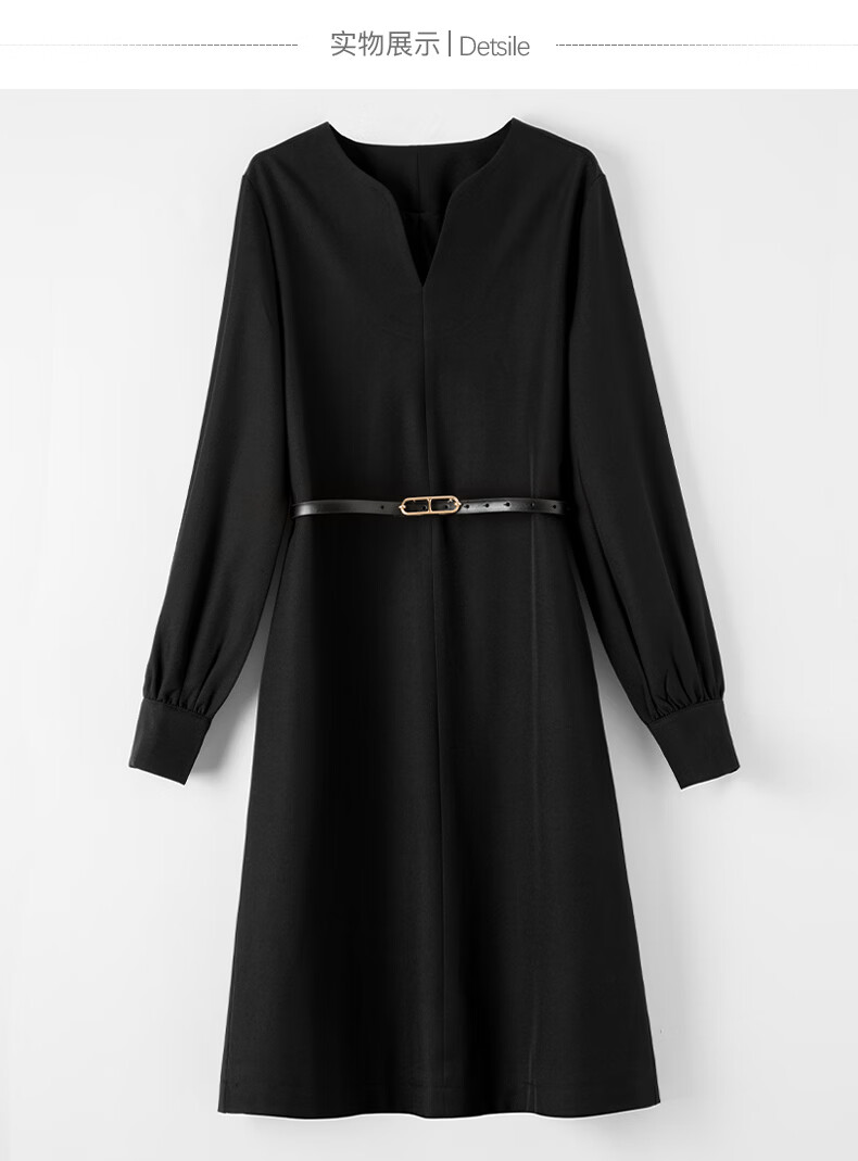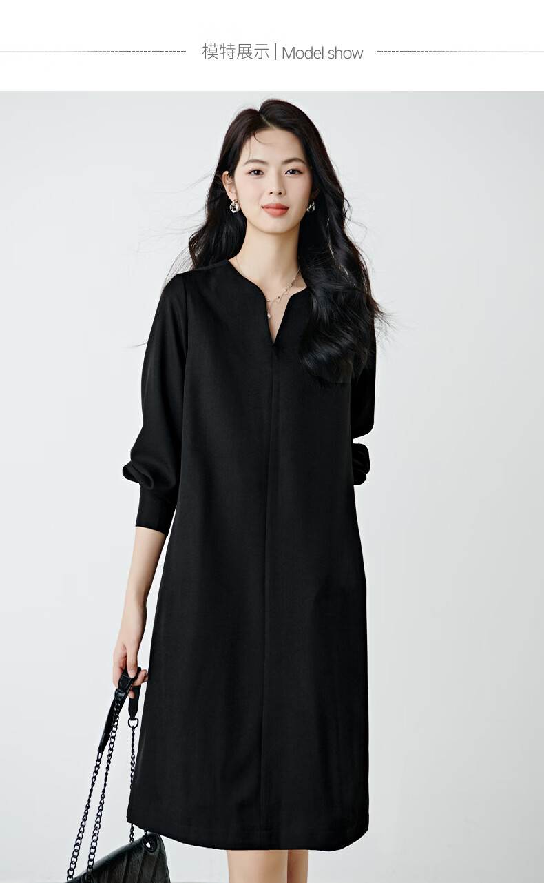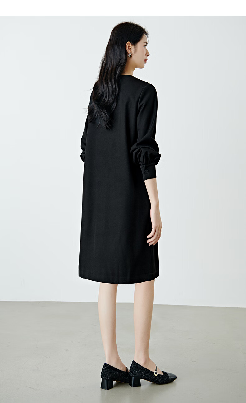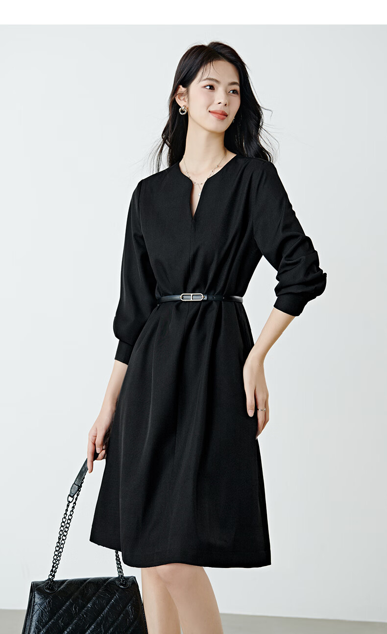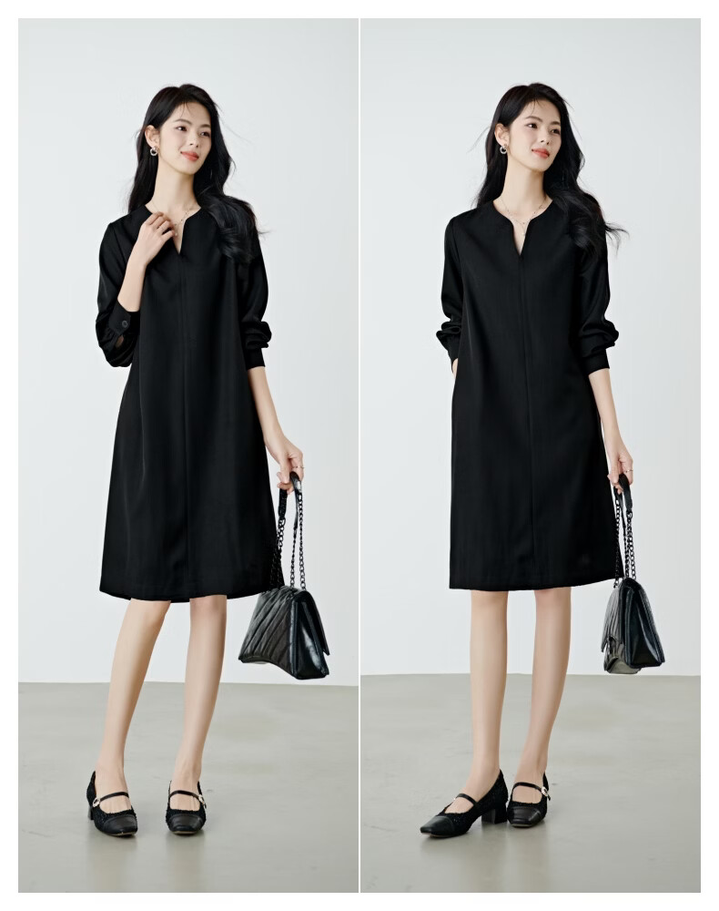 晚白【高包容度大码系列】2026春款经典圆领直筒裙系带收腰长袖连衣裙 黑色 XL