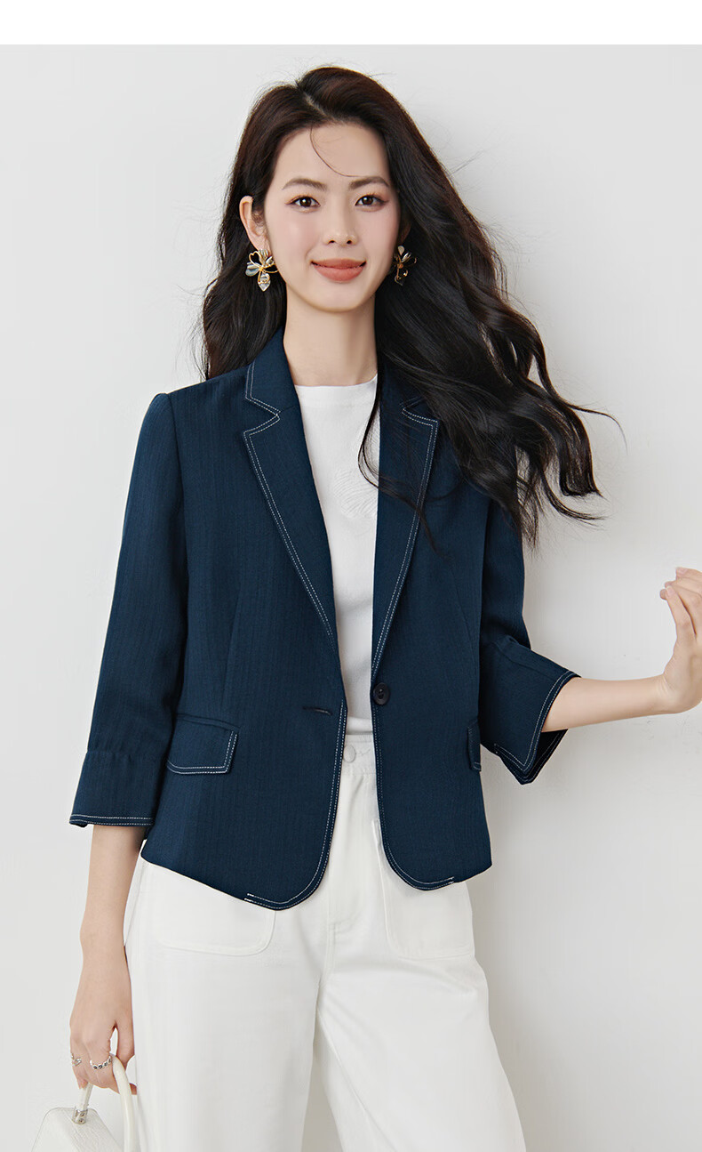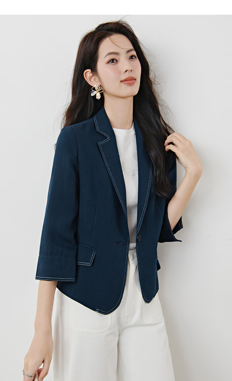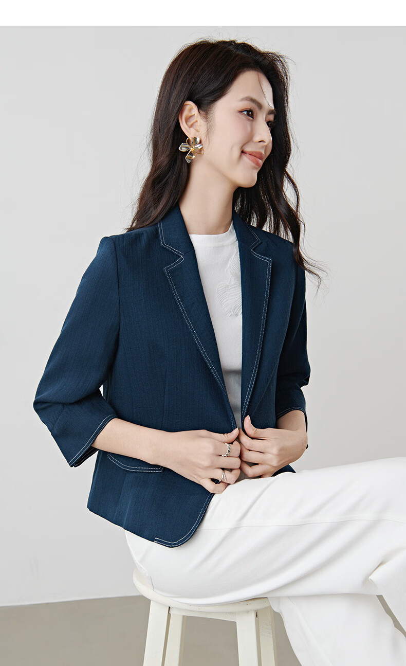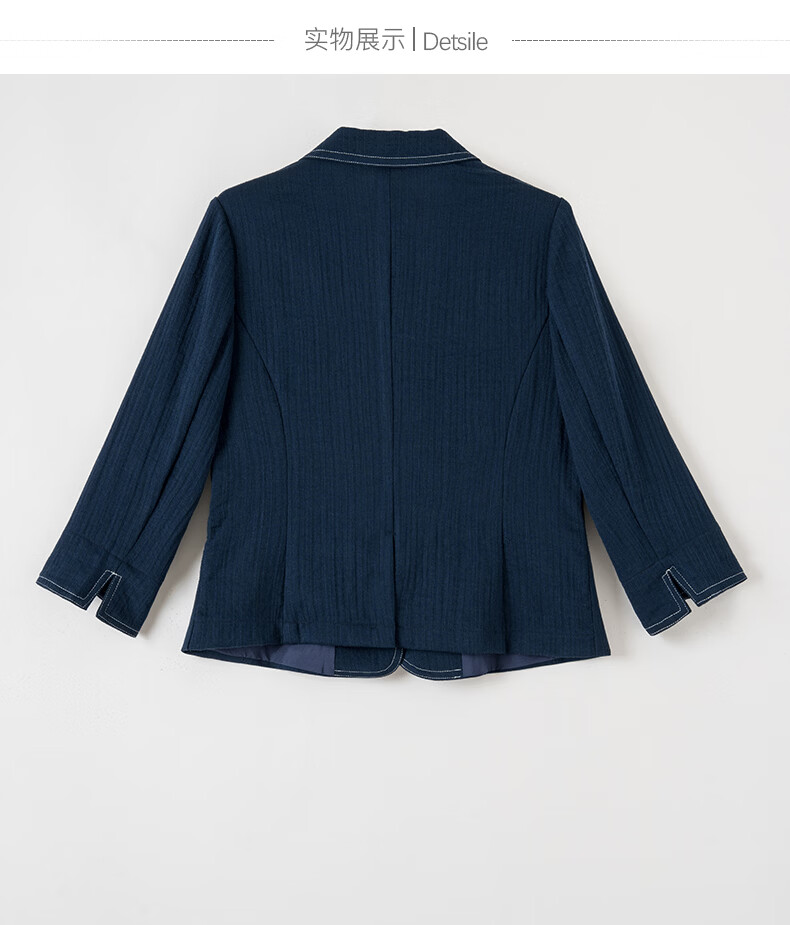 晚白【新品】2026春撞色平驳领棉麻感西装精简通勤小个子显高短外套女 深蓝色 S