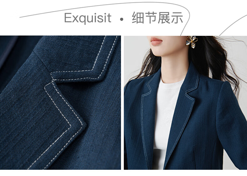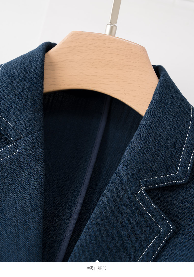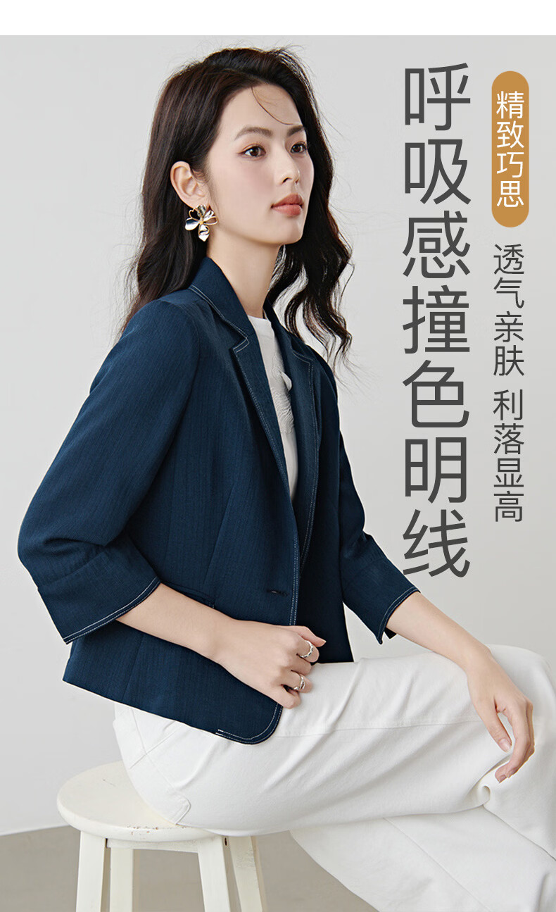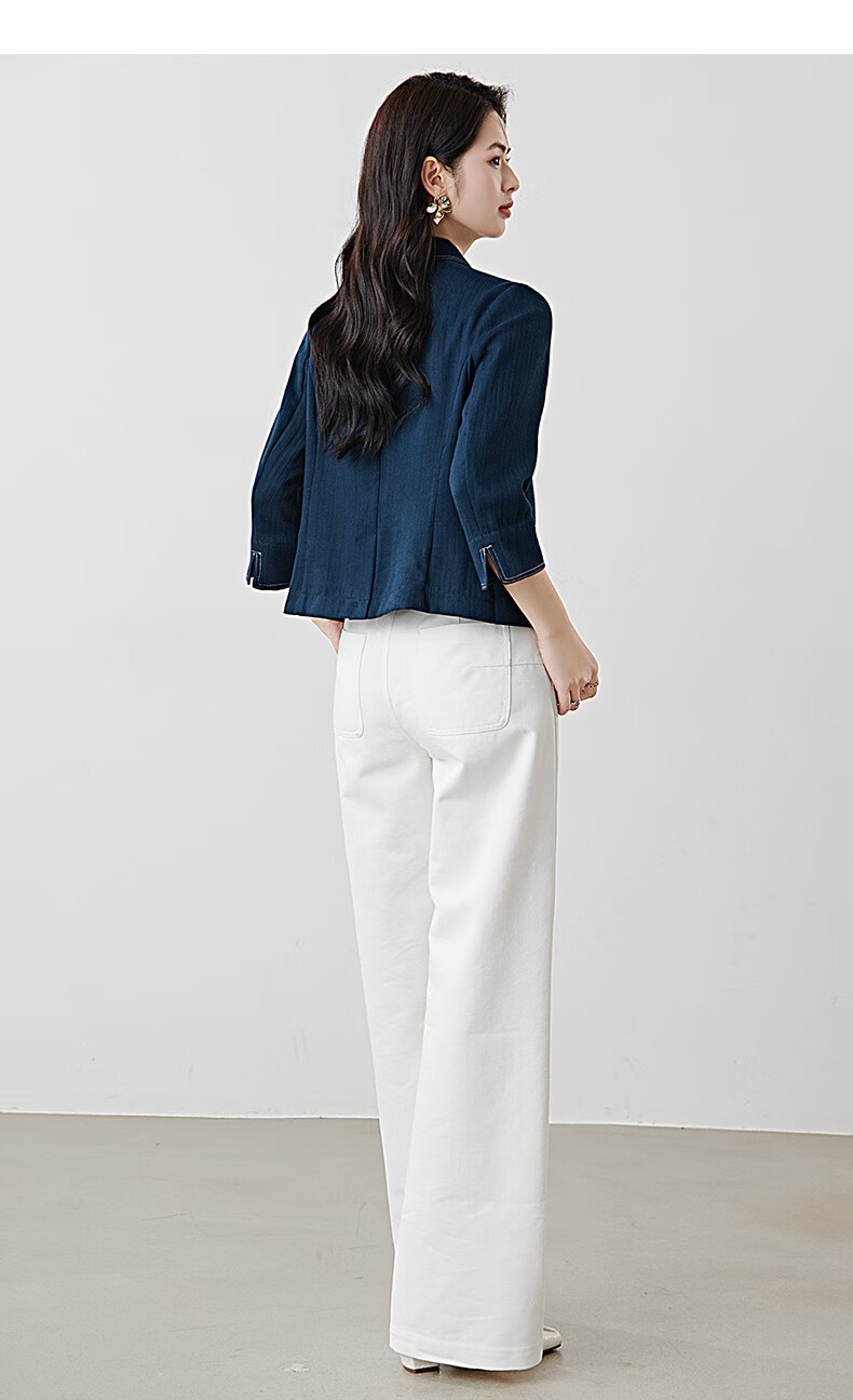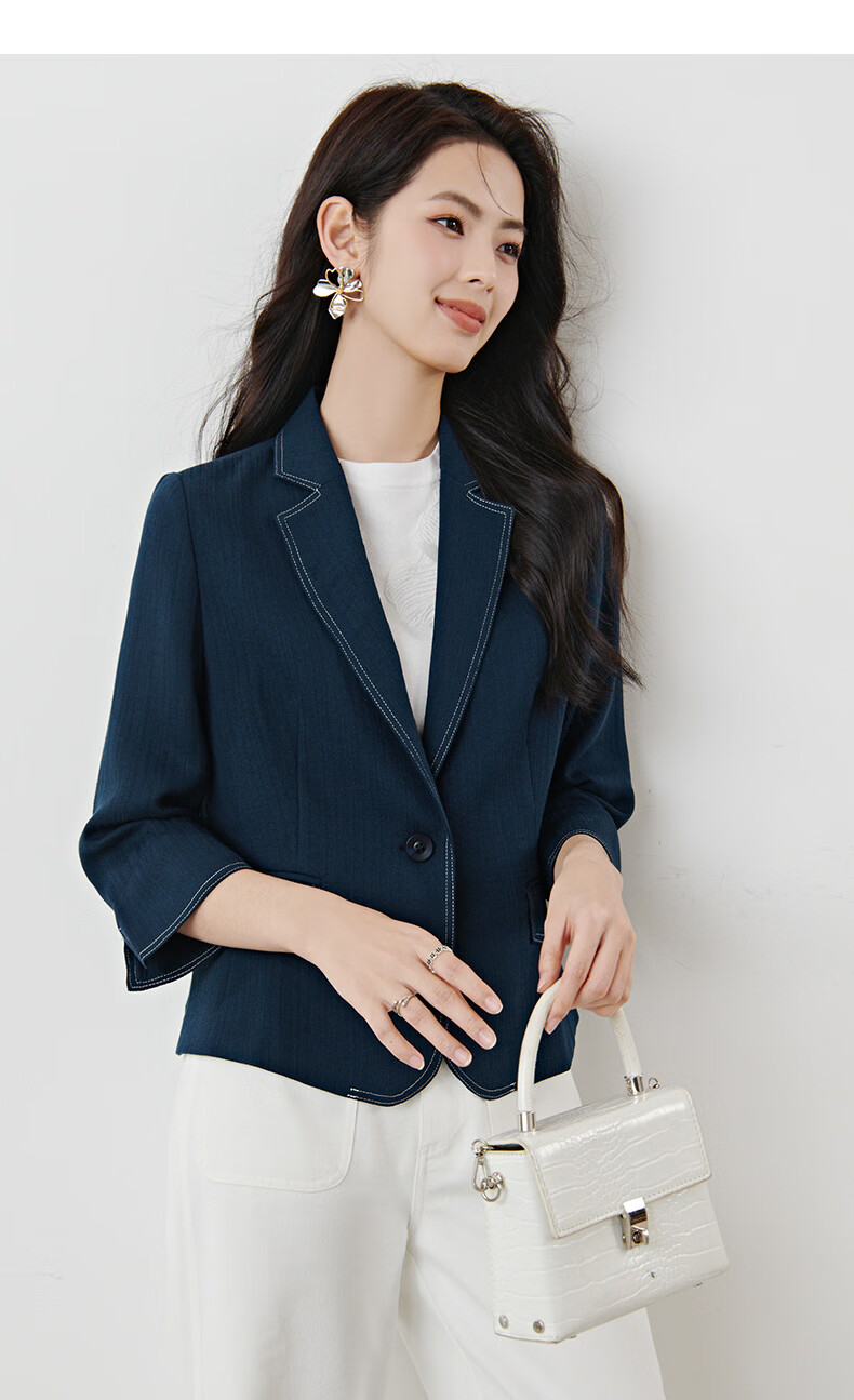 晚白【新品】2026春撞色平驳领棉麻感西装精简通勤小个子显高短外套女 深蓝色 S