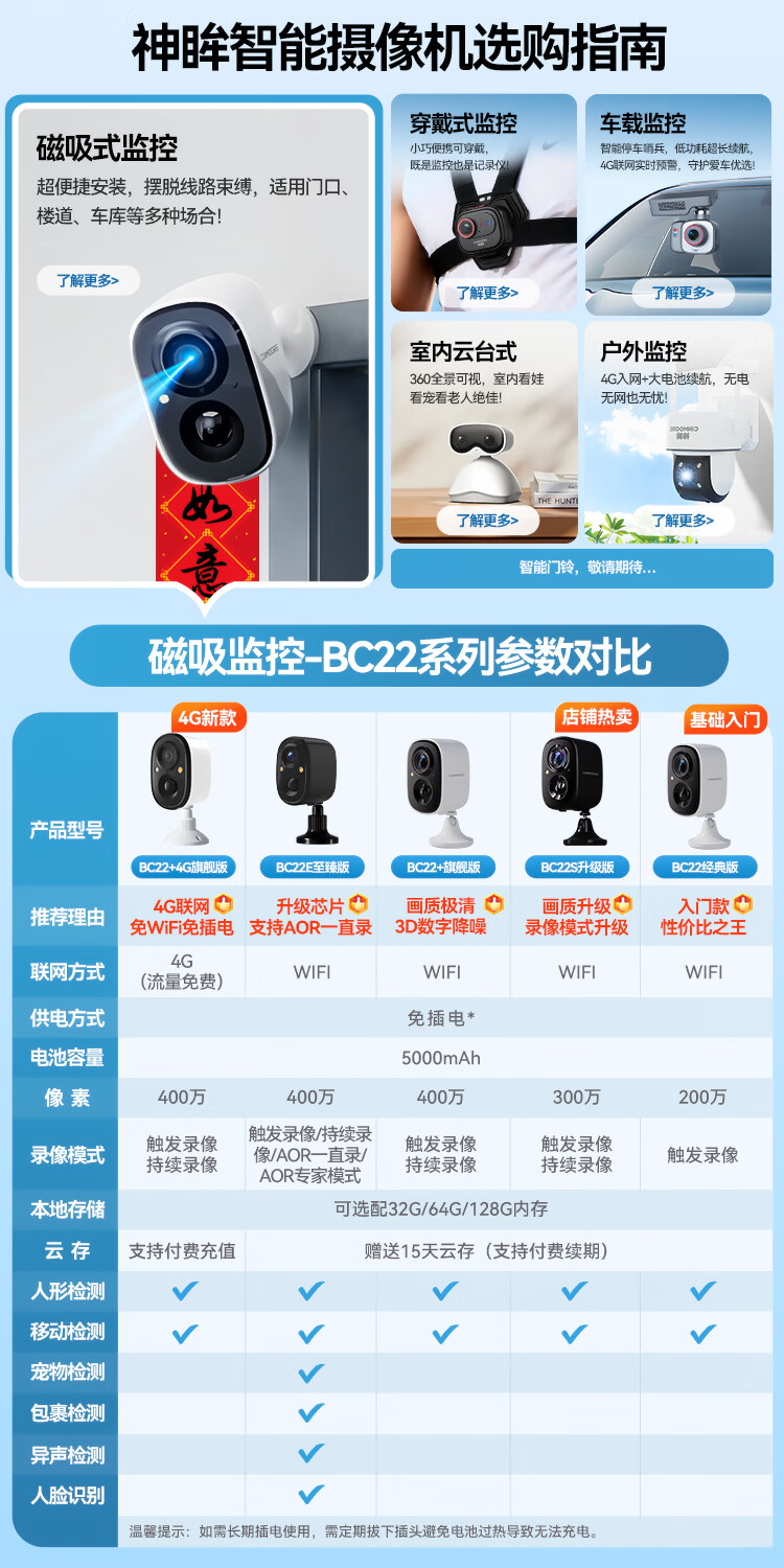 神眸家门口楼道摄像头 免插电监控器 无线wifi家用室内电池充电户外太阳能高清夜视手机远程磁吸免打孔 【4G旗舰款】BC22+4G版(终身免流) 64G