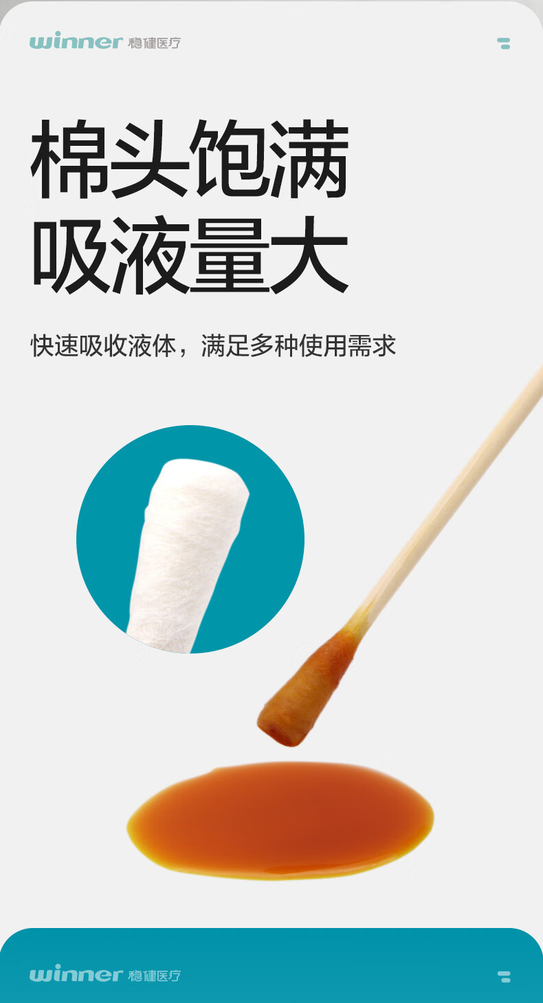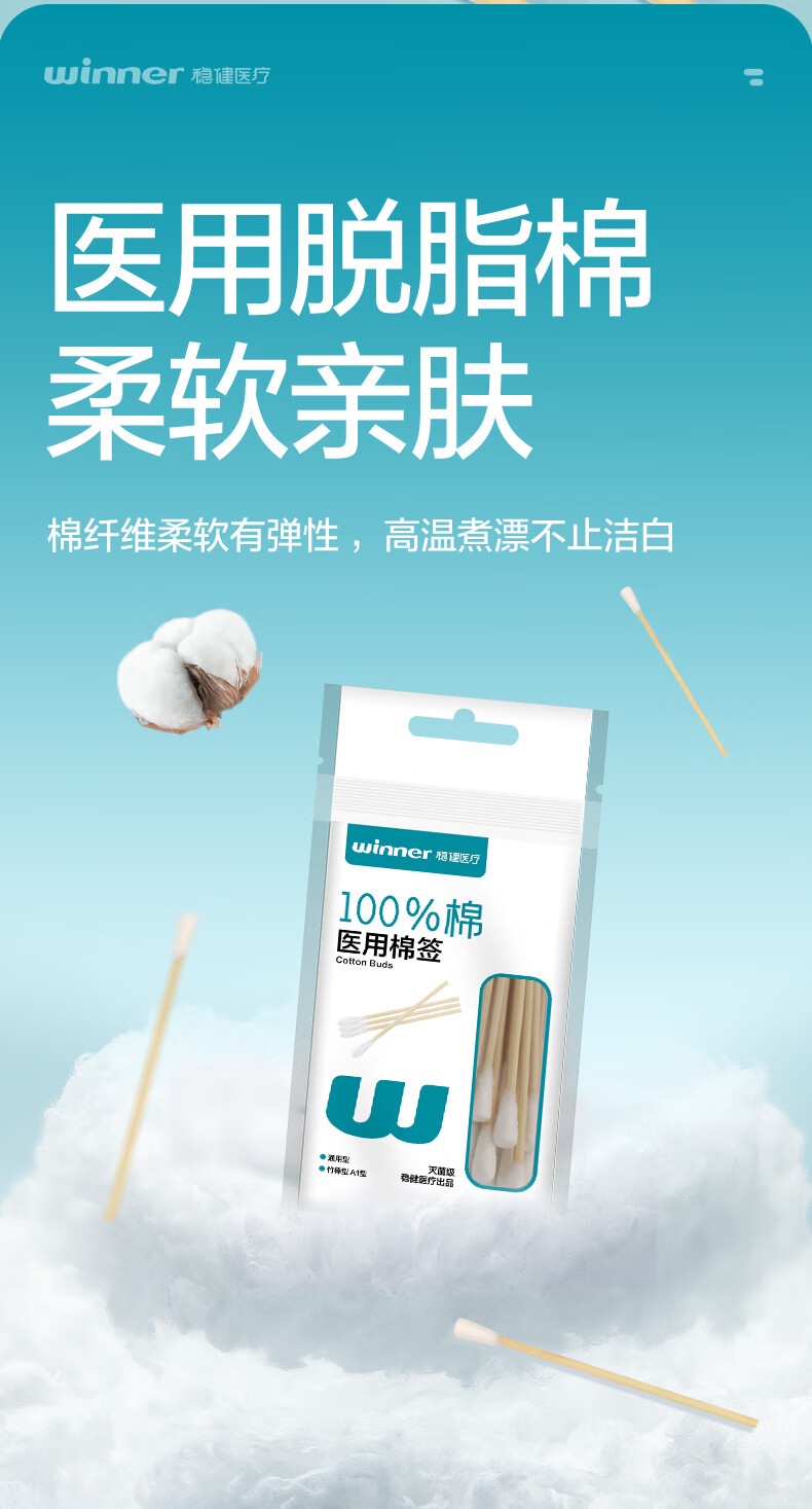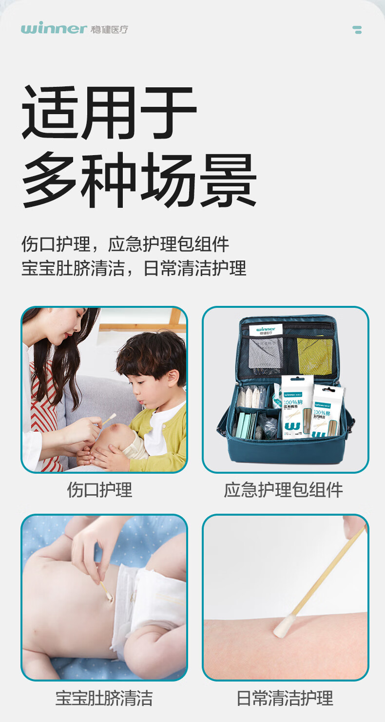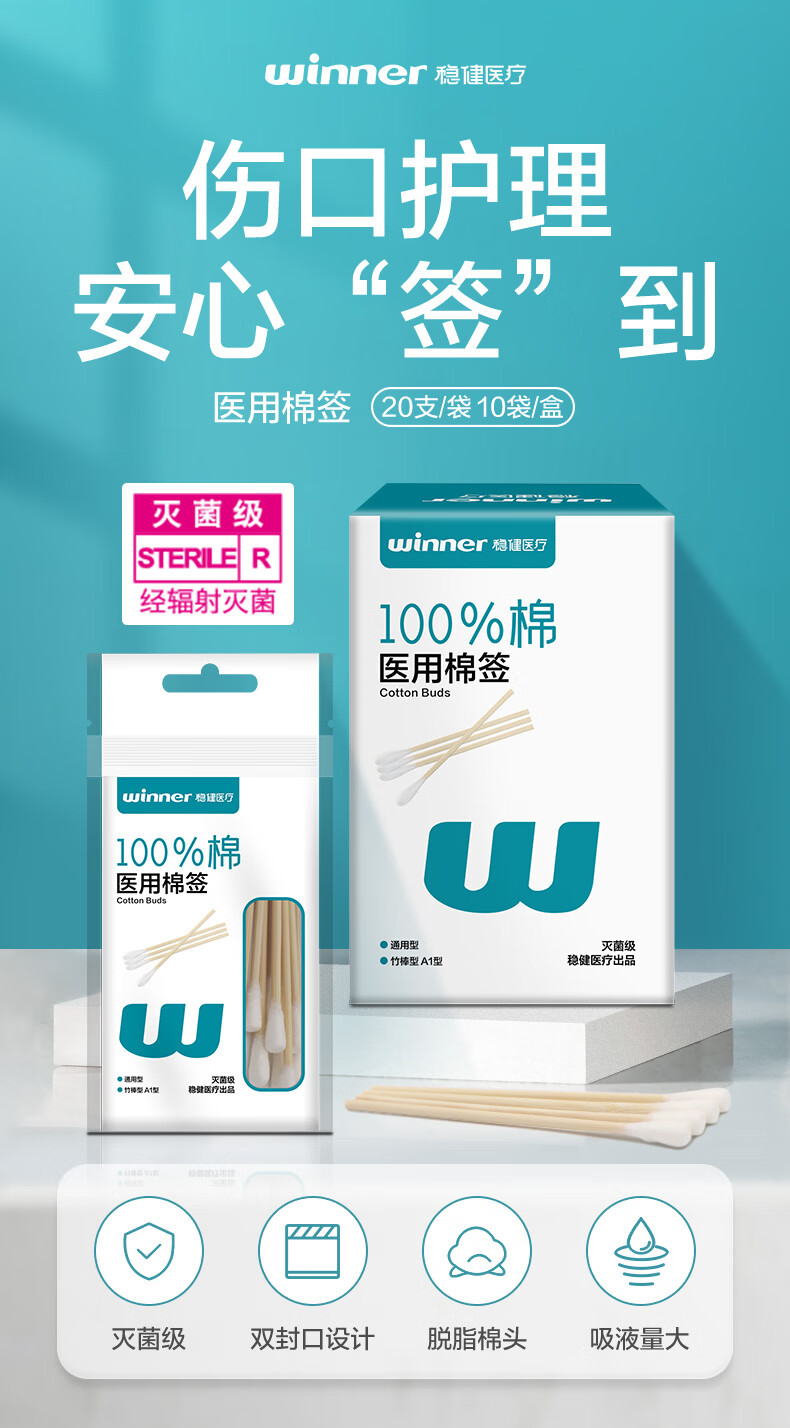 稳健医用灭菌消毒棉签棒平头20支*10袋(200支) 便携装清洁消毒伤口