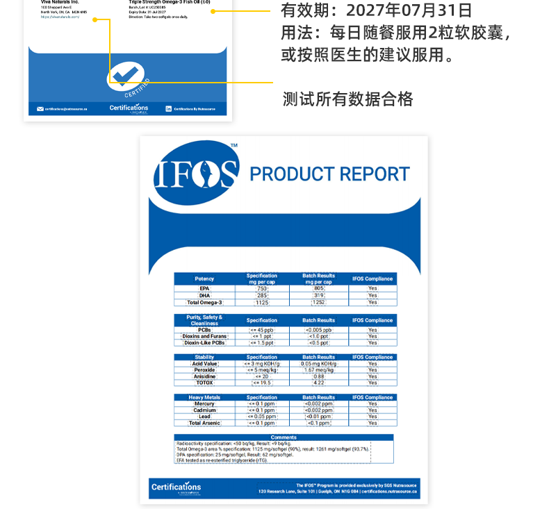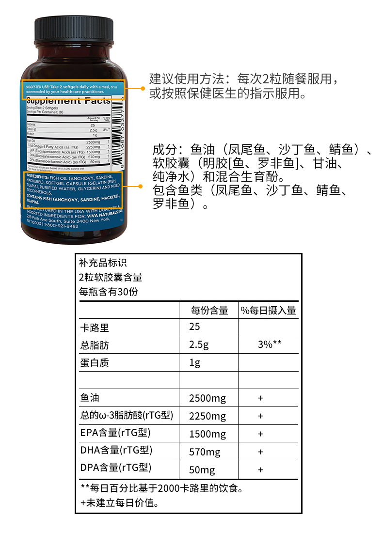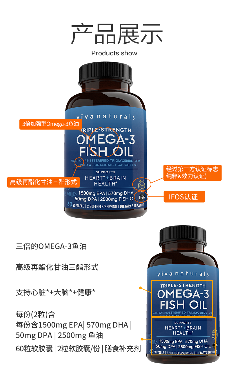 Viva Naturals美国进口高纯度rTG结构深海鱼油DPA天然omega3欧米伽3软胶囊60粒
