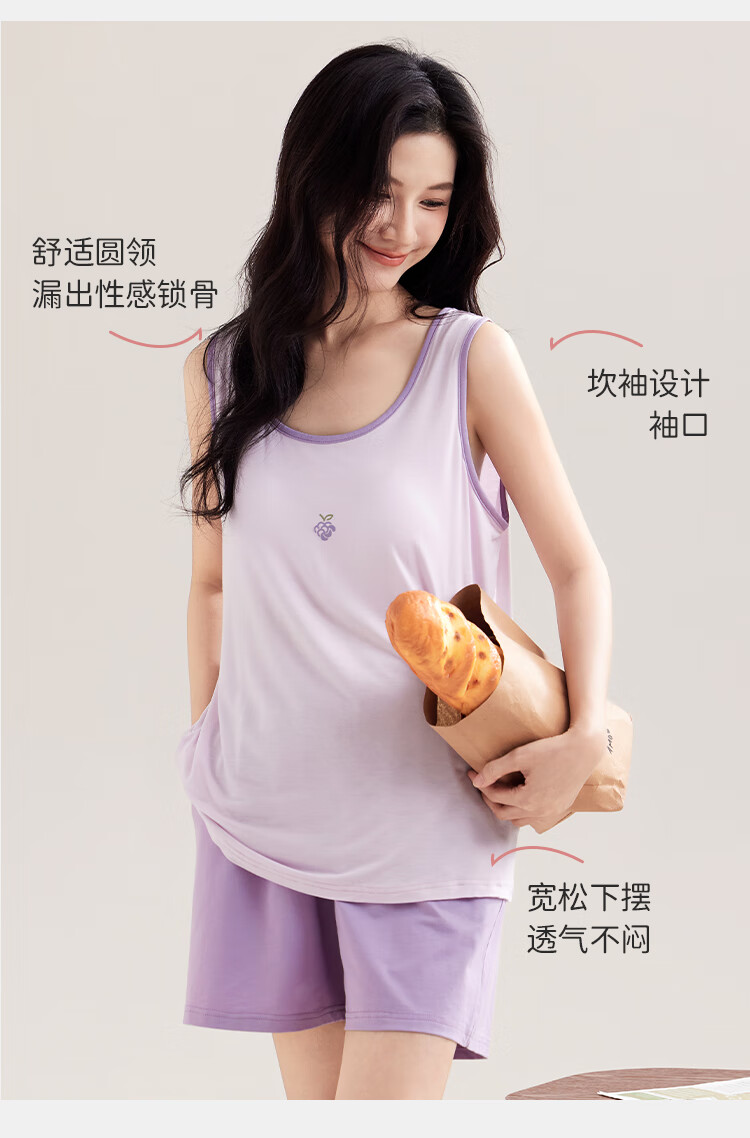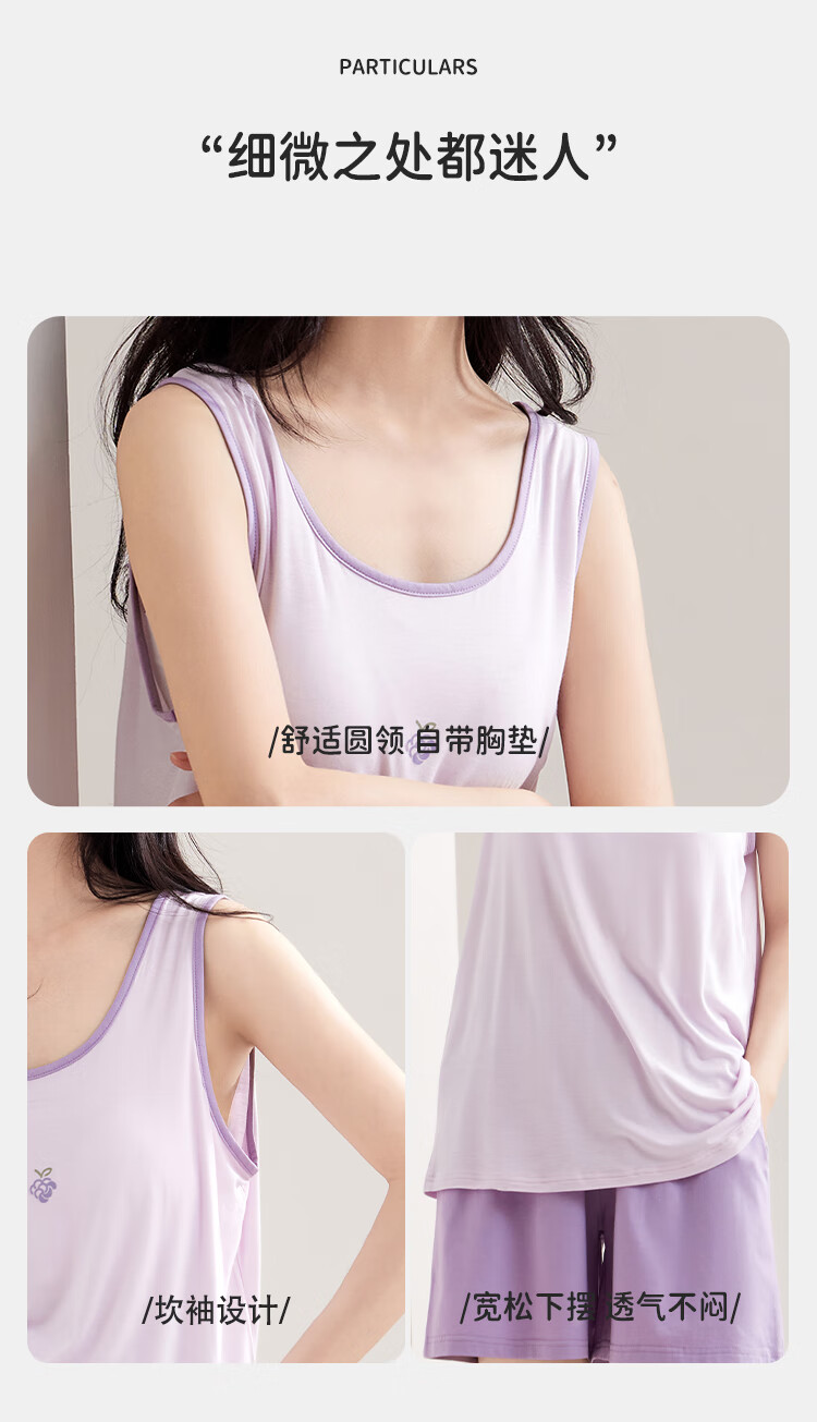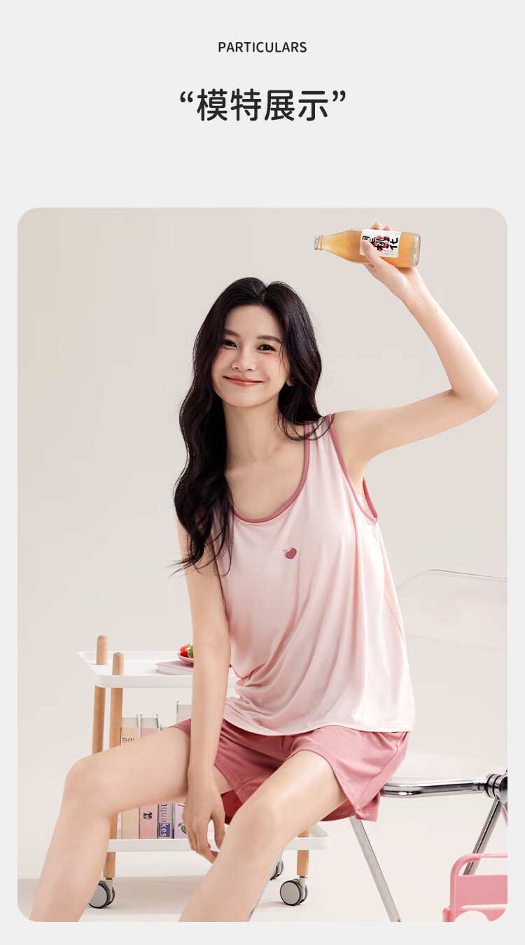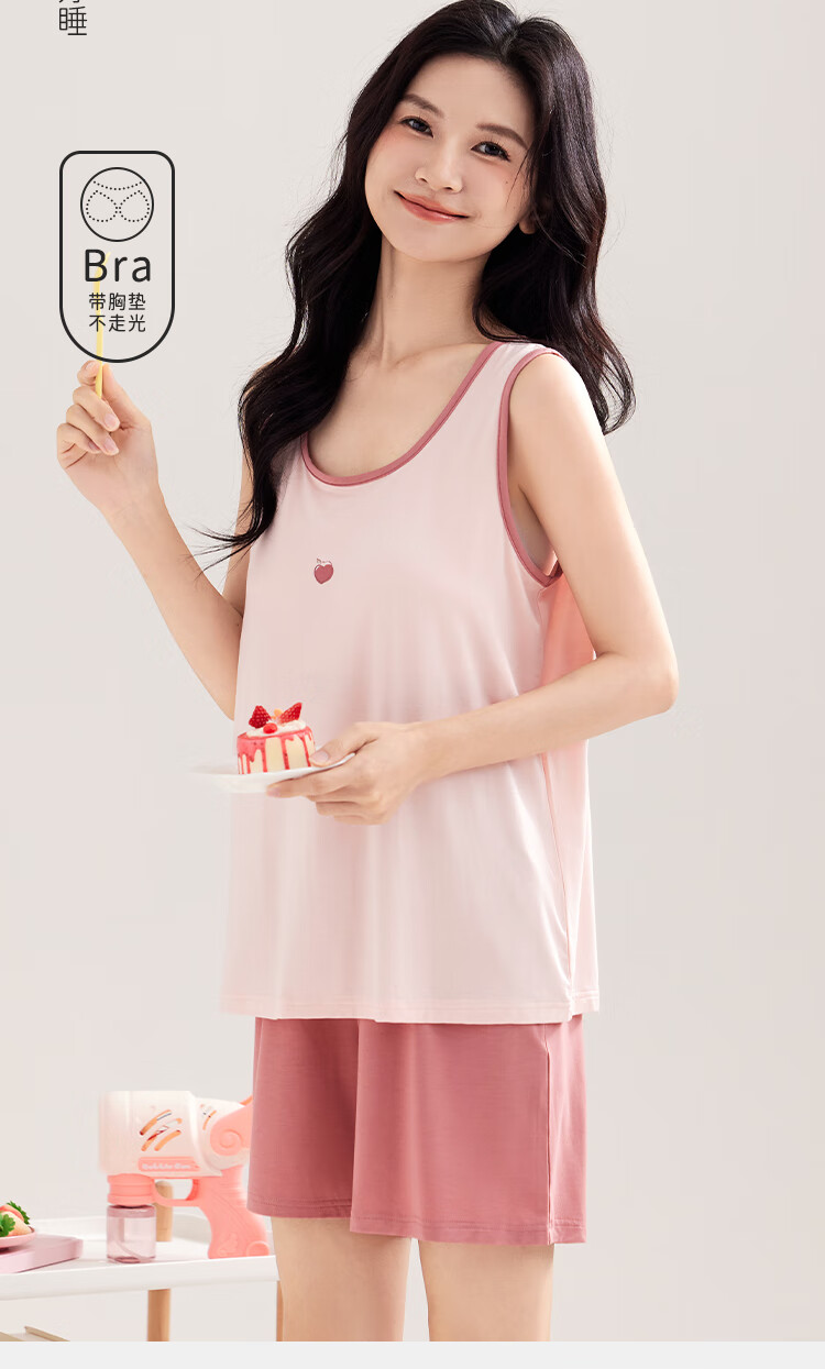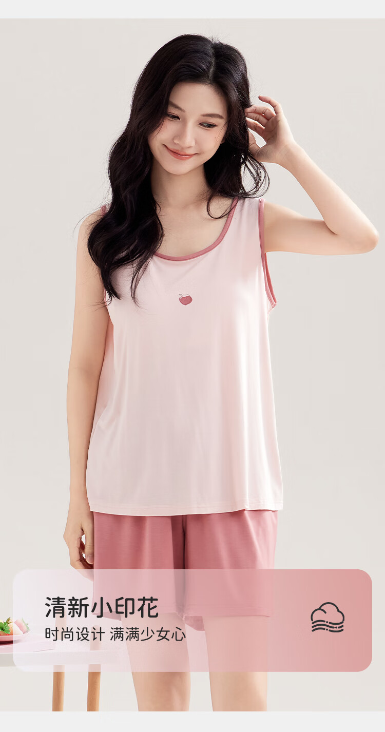 都市丽人女士睡衣女带胸垫春夏款无袖圆领短裤纯色休闲家居服套装可外穿 粉色 L
