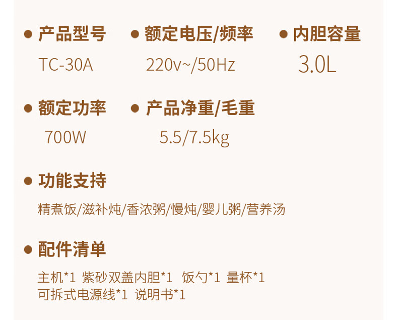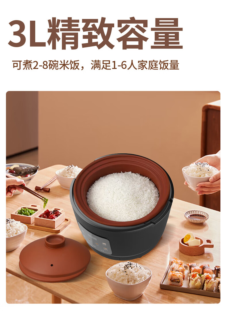 九阳(Joyoung)0氟系列珐琅瓷釜3升蜜罐电饭煲 4~6人家用0特氟龙电饭锅微压35分钟快煮多功能国家补贴30NF02