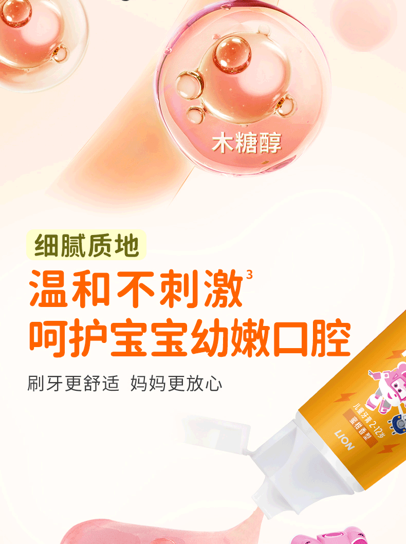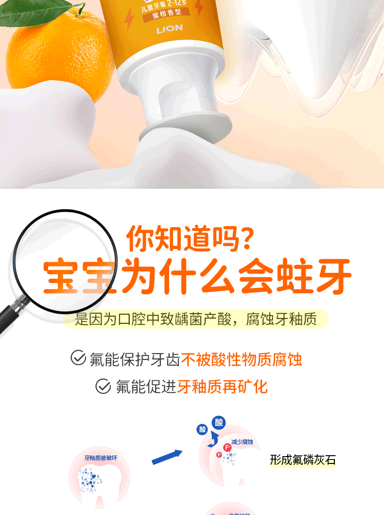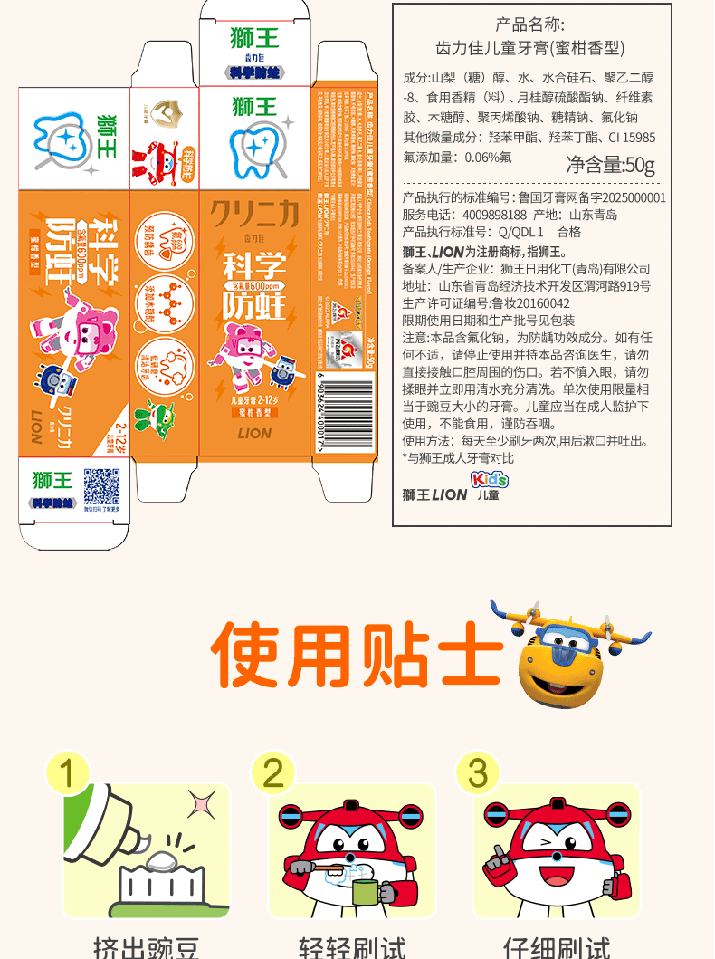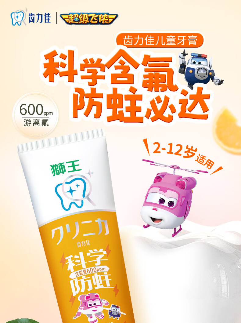 狮王(Lion)齿力佳儿童科学防蛀牙膏2-12岁(蜜柑)50g含木糖醇防蛀牙固齿