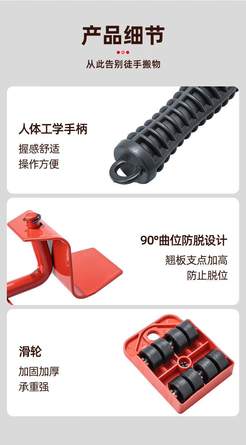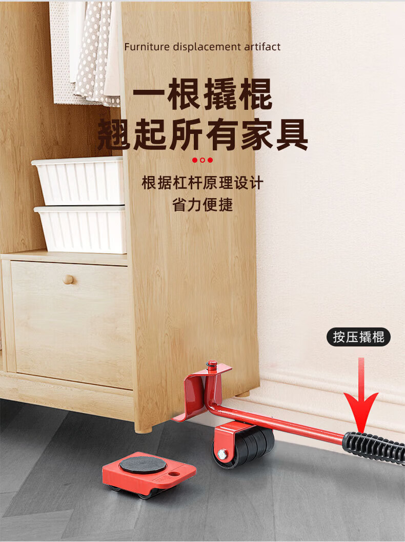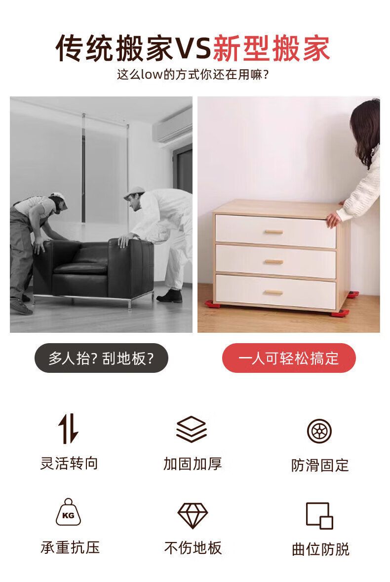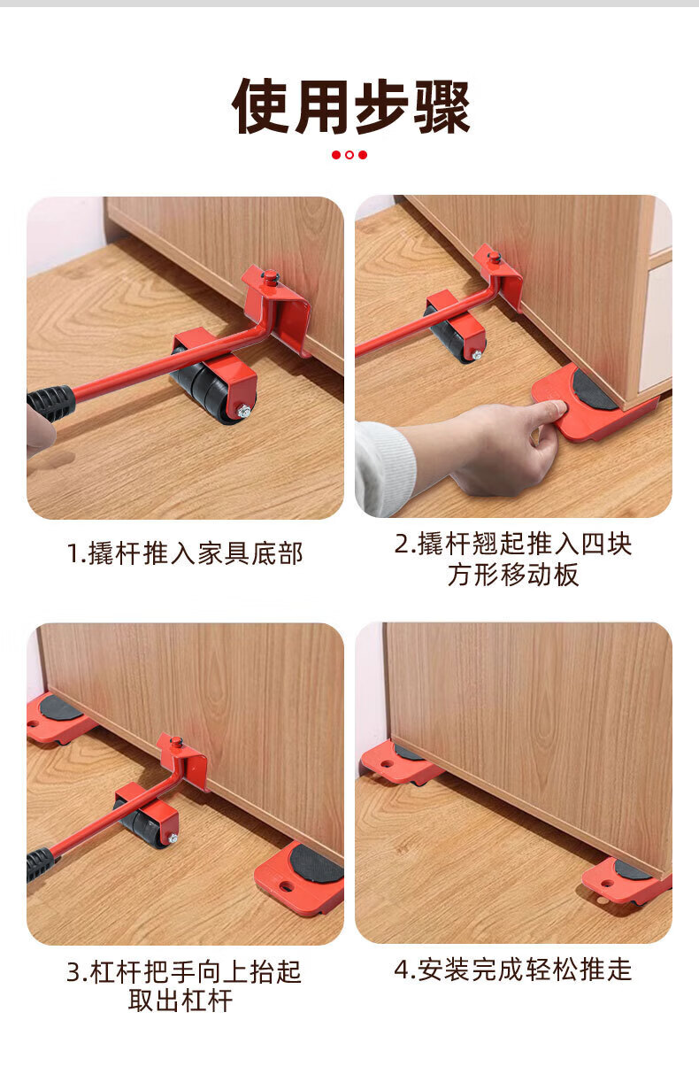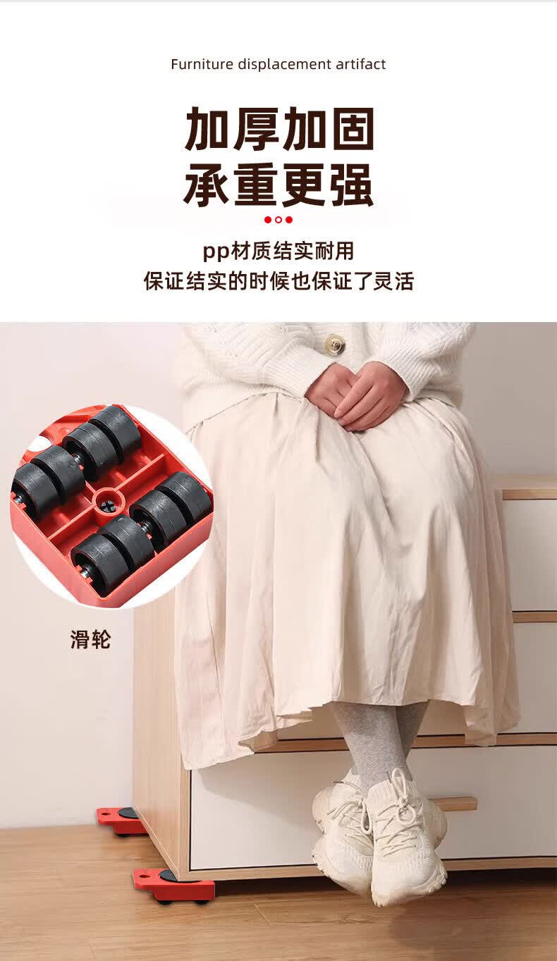 亚伦大力士搬重物搬家神器移动滑轮万向轮移动底座运家具床冰箱洗衣机移位器 4个方形包胶轮滑板-带撬棍【承重600kg】 万向旋转-不伤地板