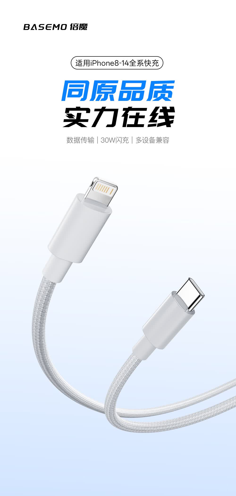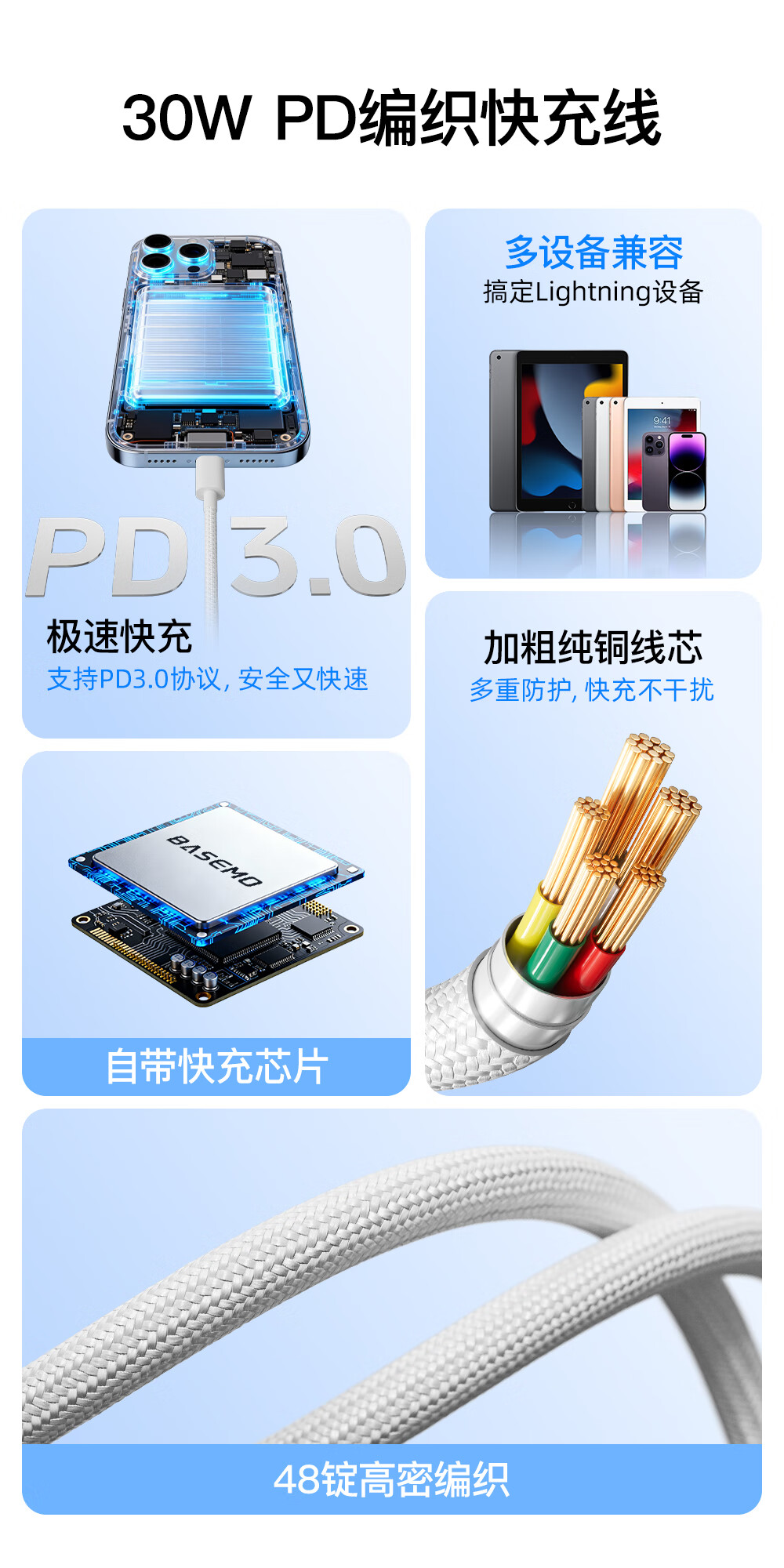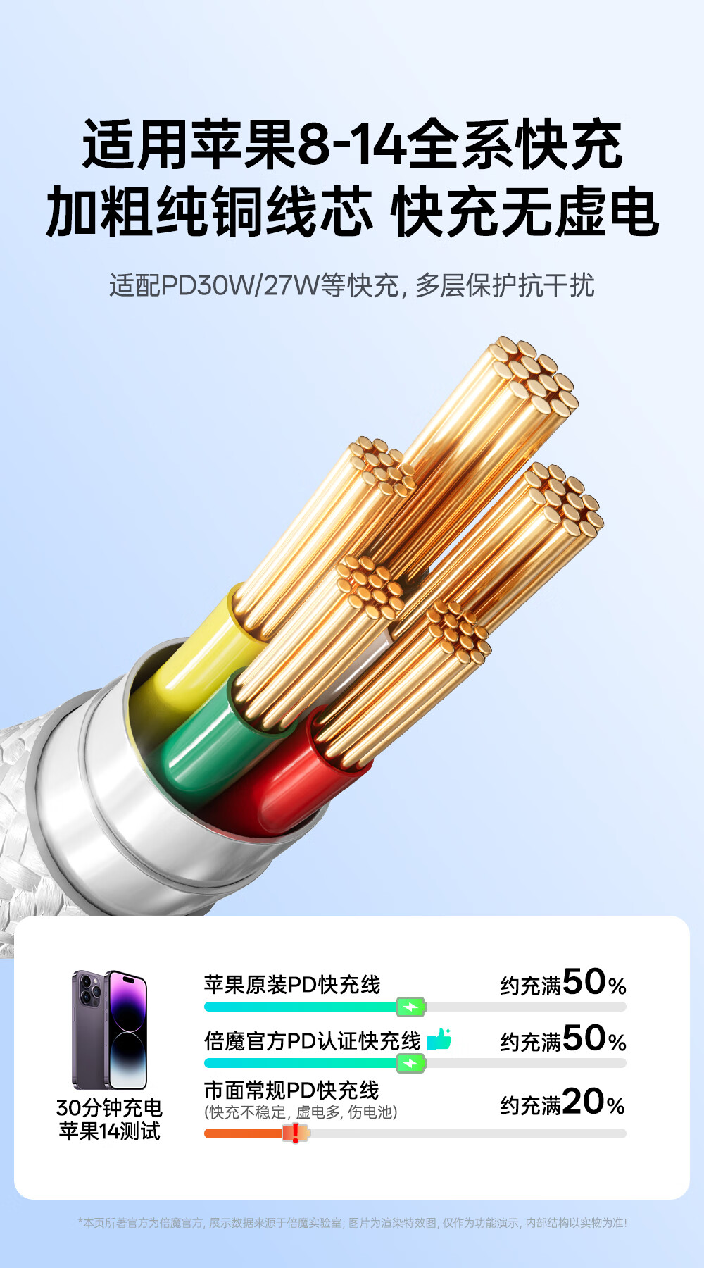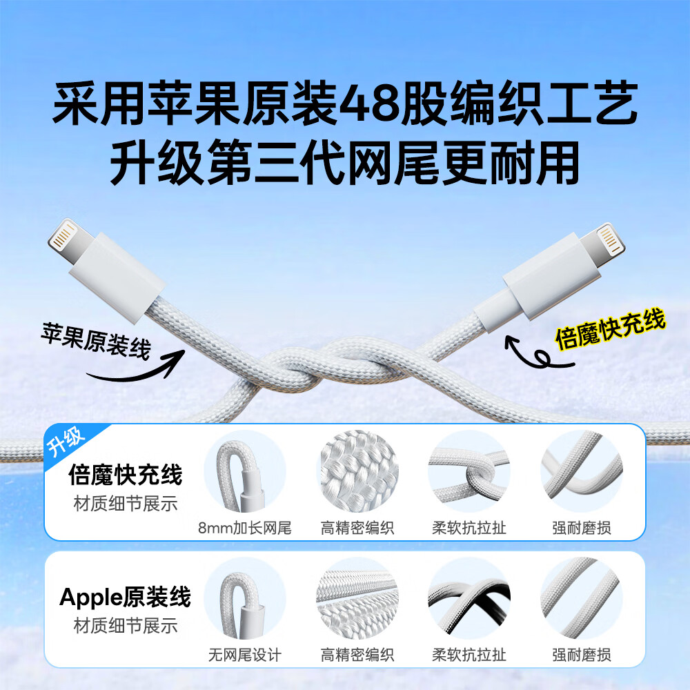 倍魔苹果数据线快充线PD30W充电线to lightning编织款iPhone14/13/12/11/xs/8手机平板车载 1米 蓝色