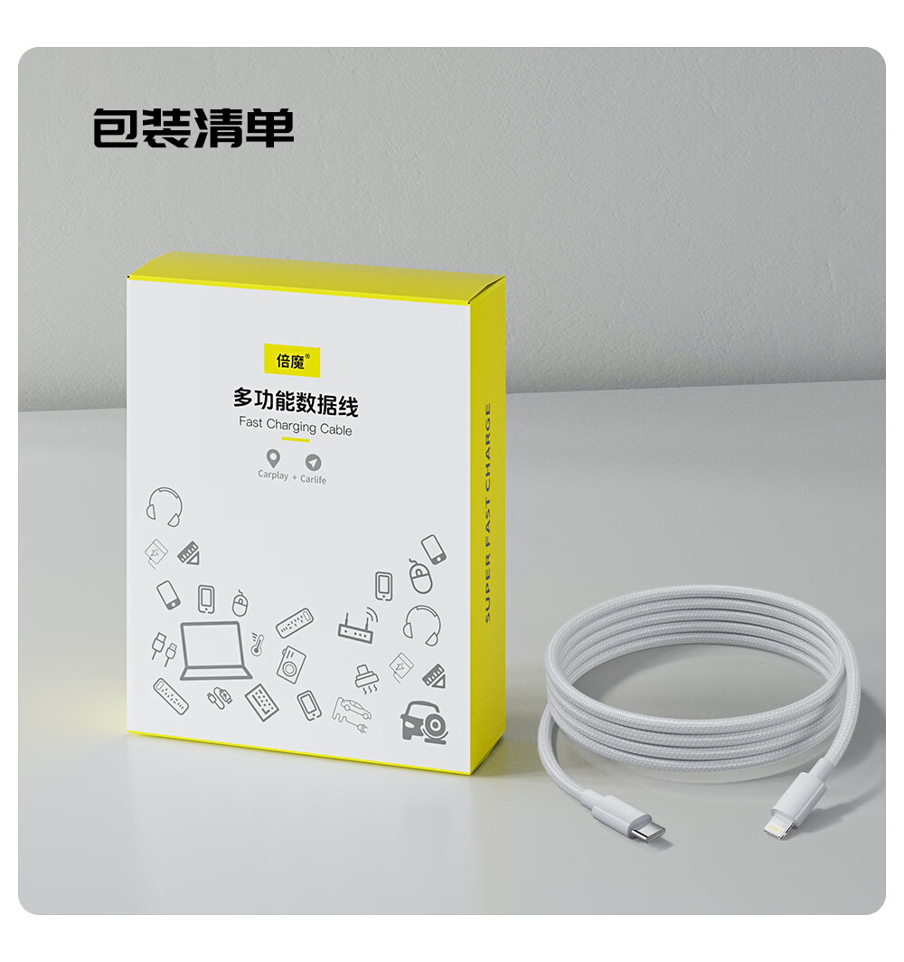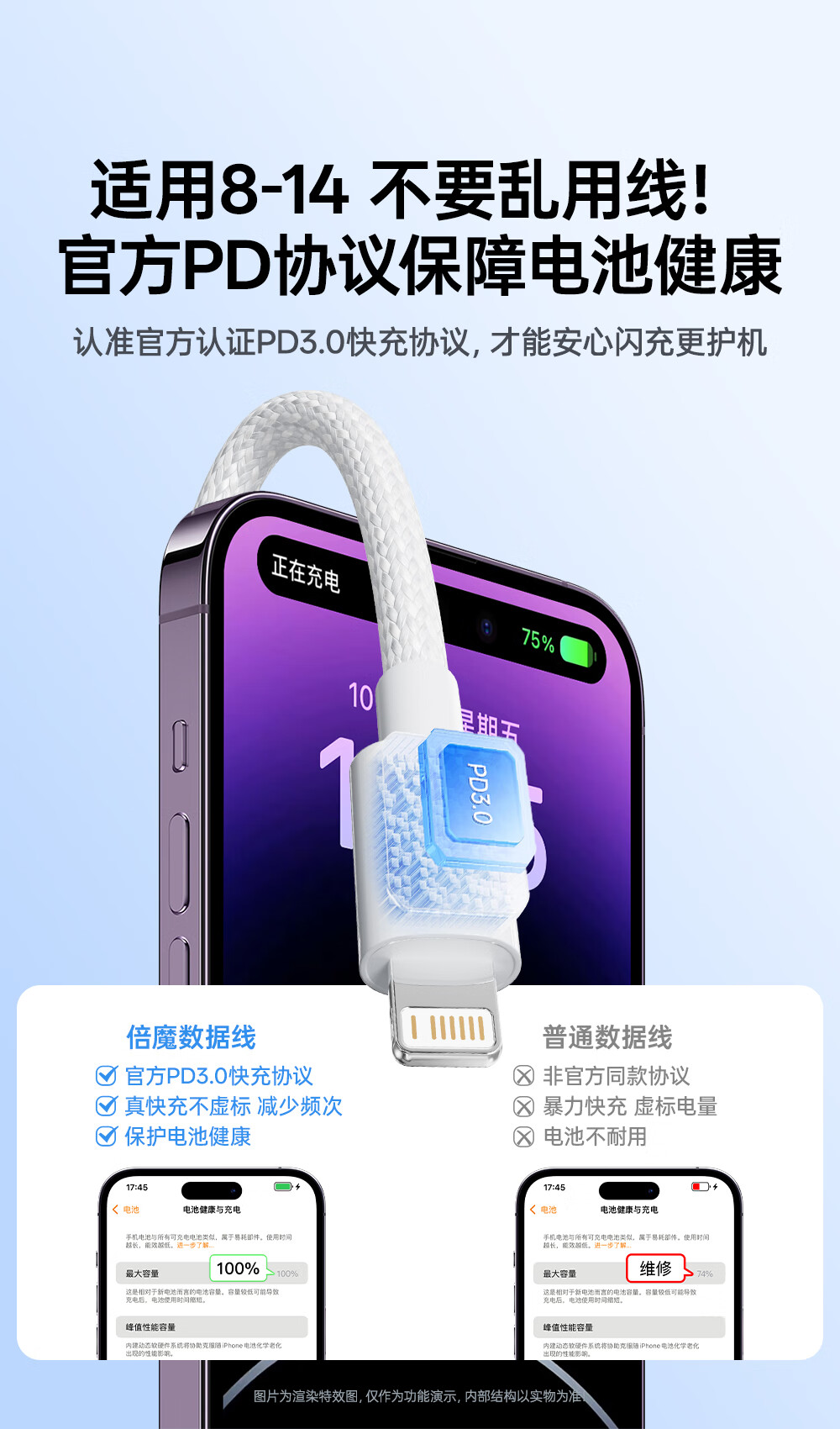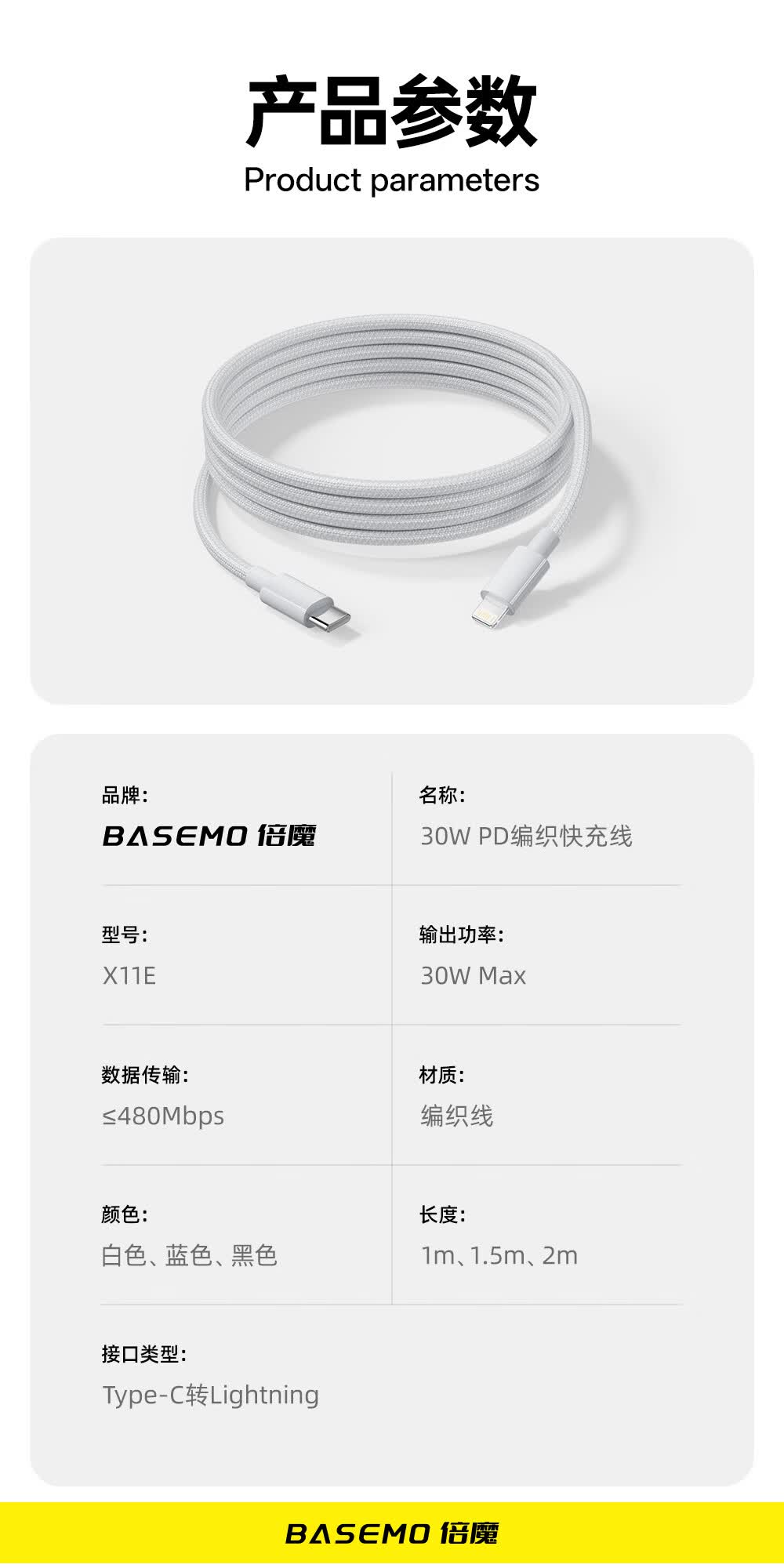 倍魔苹果数据线快充线PD30W充电线to lightning编织款iPhone14/13/12/11/xs/8手机平板车载 1米 蓝色