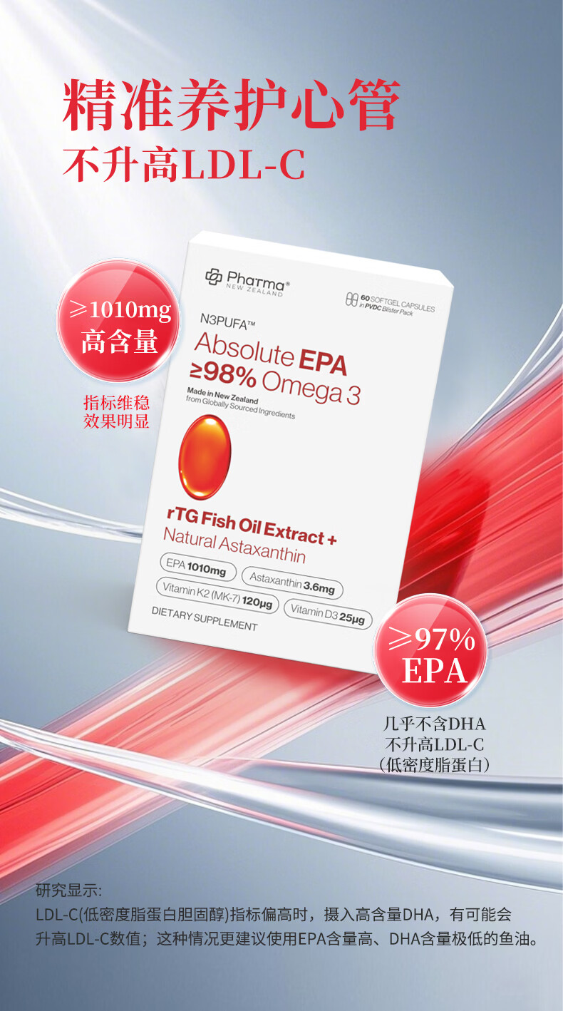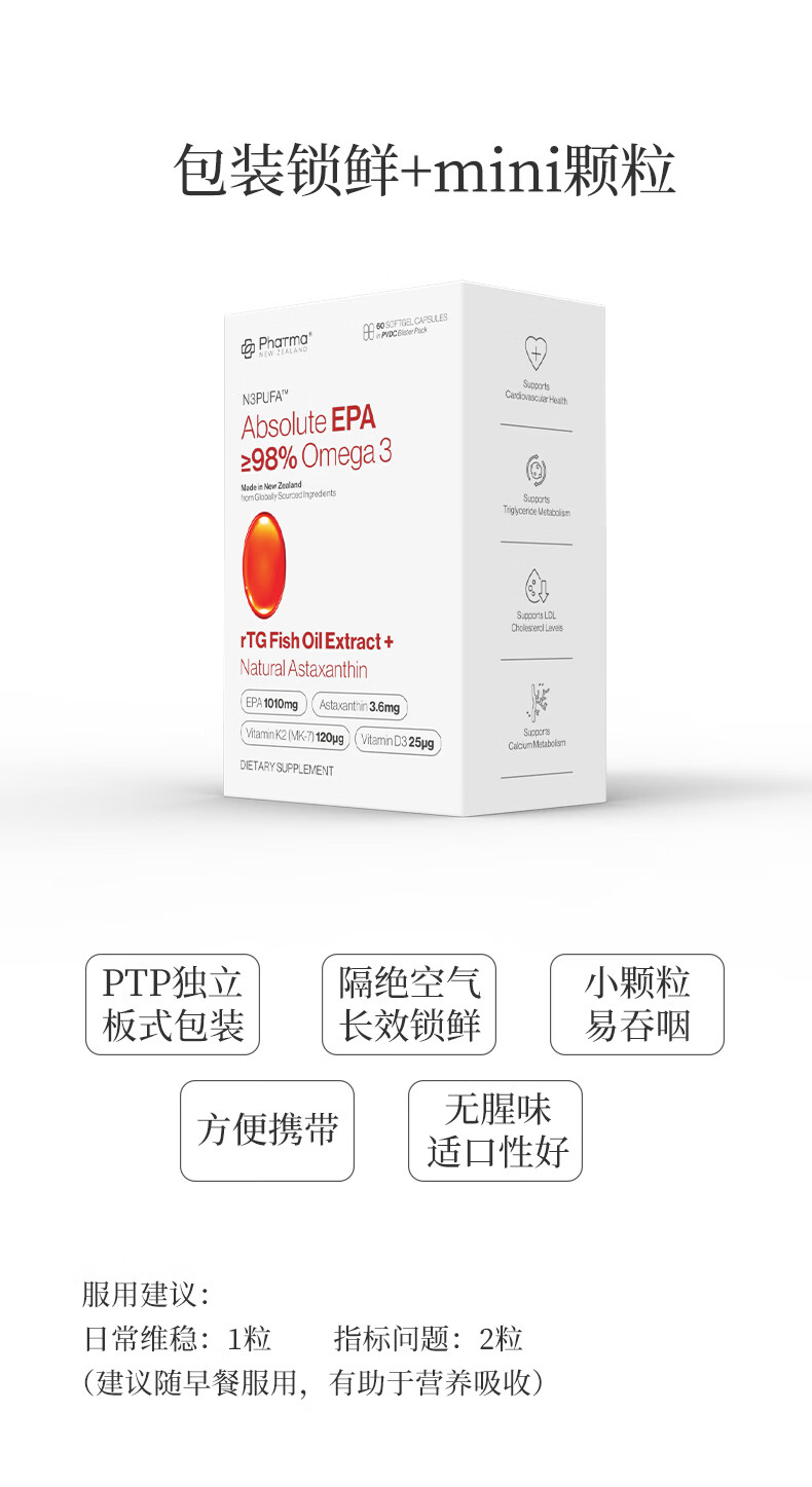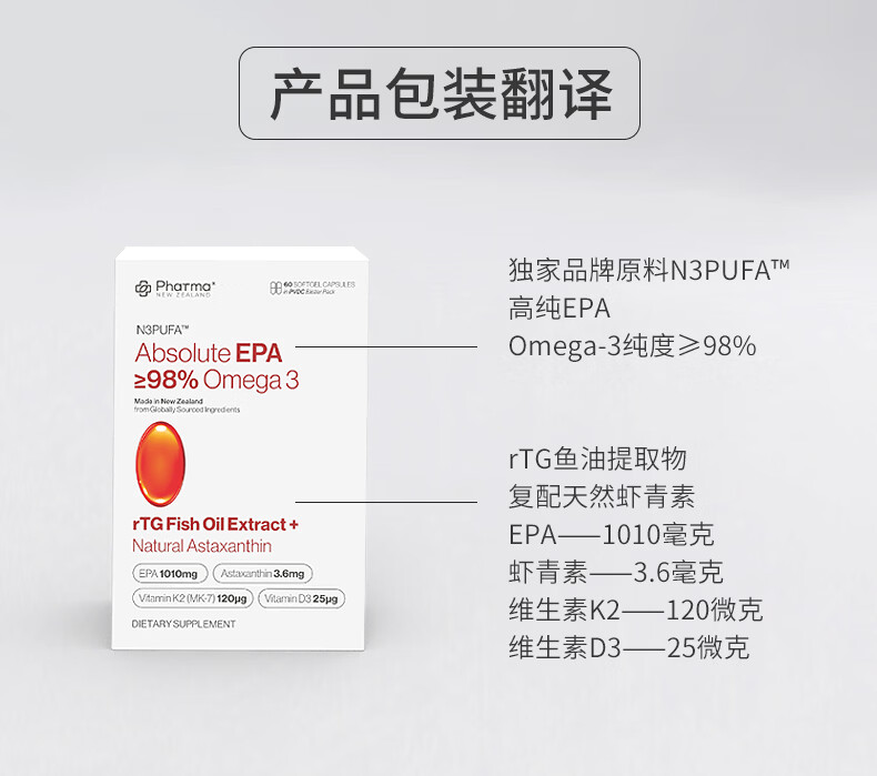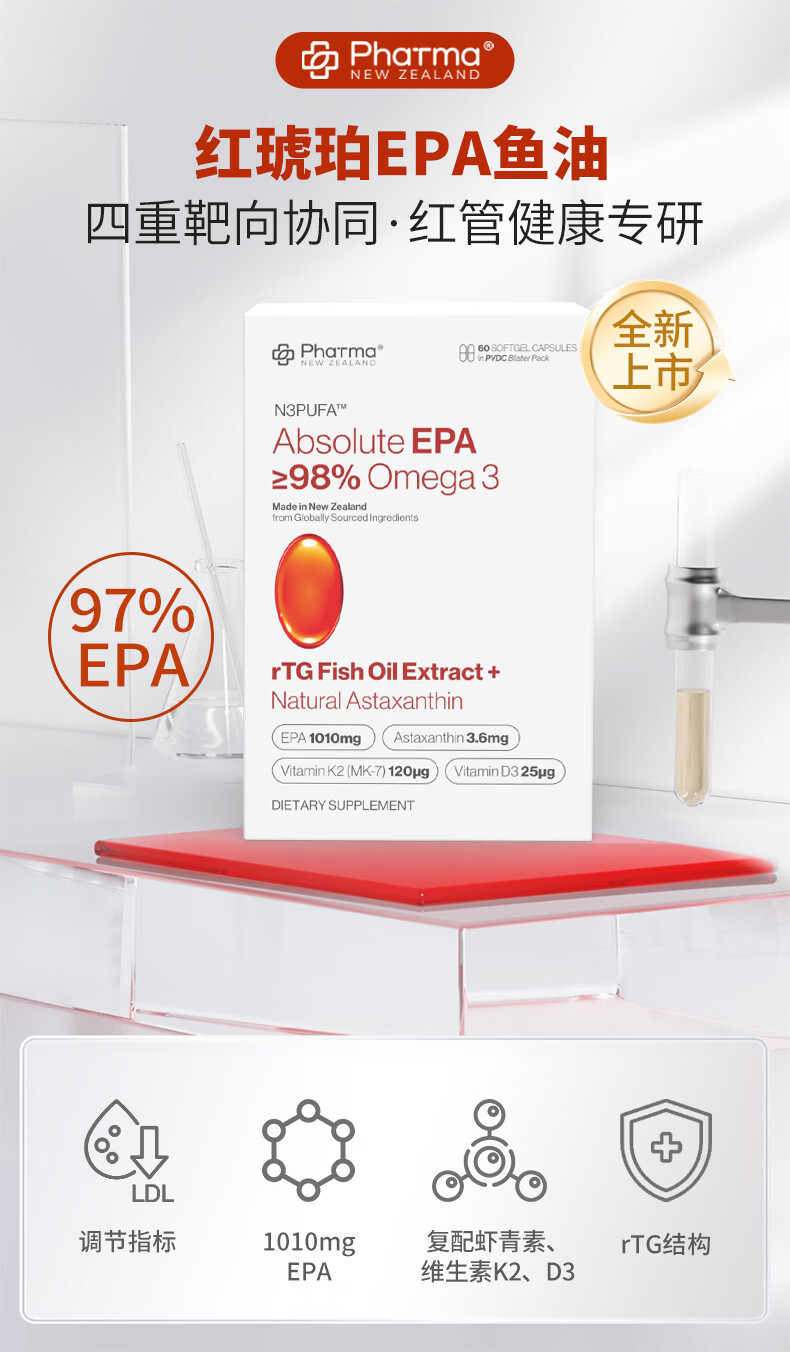 PhatmaPNZ高纯EPA红琥珀深海鱼油软胶囊rTG型Omega3纯度98%虾青素护心脑 降血脂送父母保健品 60粒*1盒