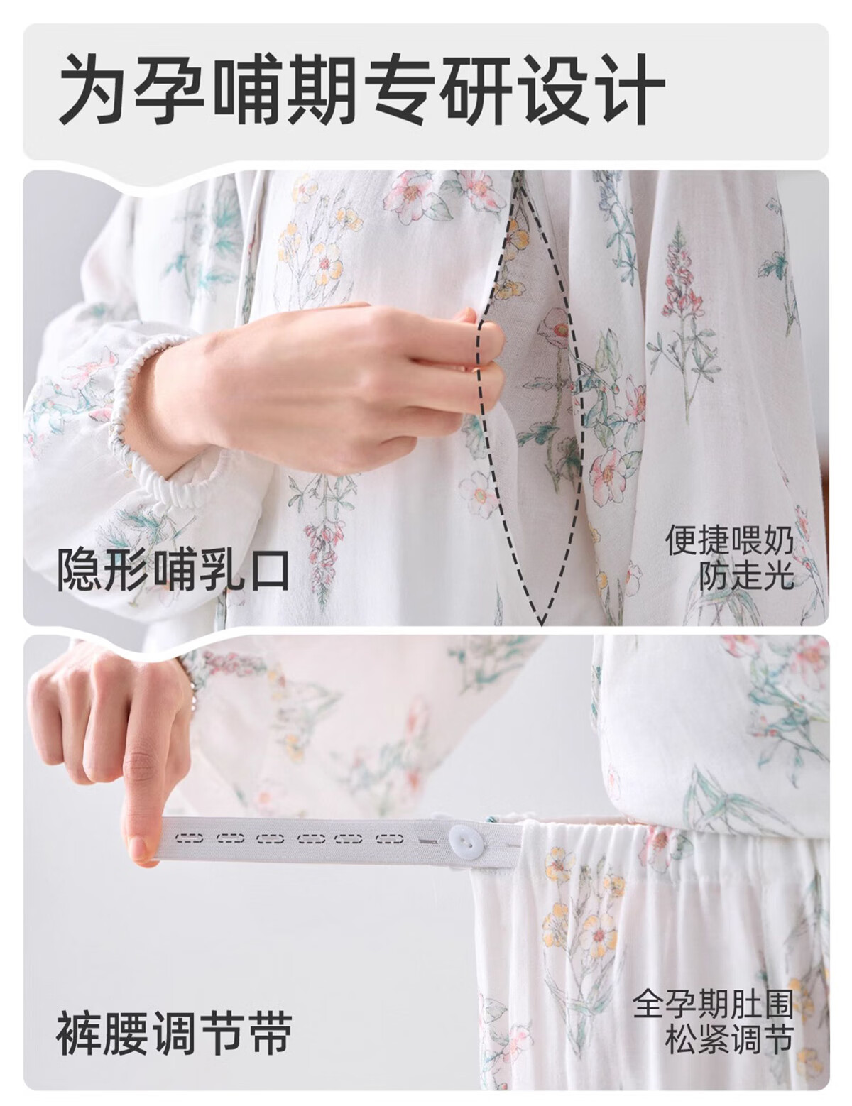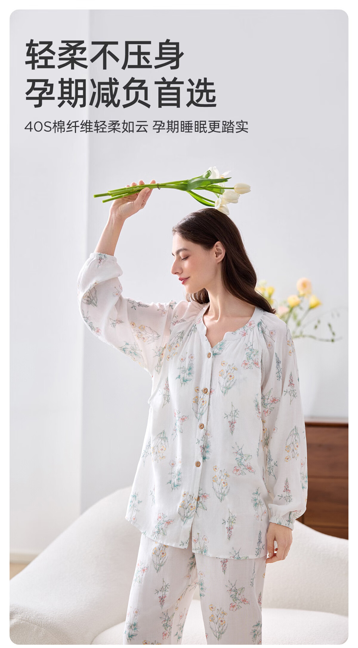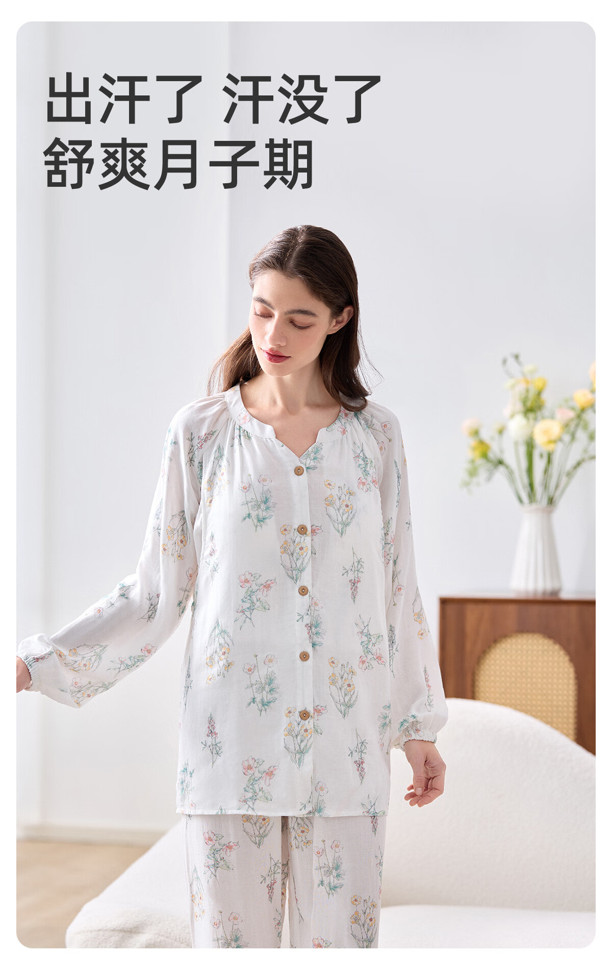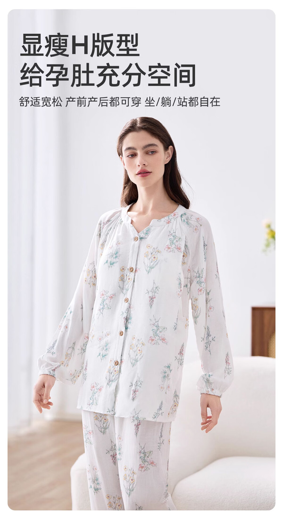 ROVO月子服吸湿透气带胸垫产后竹棉纤维孕妇睡衣哺乳家居服套装 雅白纤花【带胸垫 A类竹纤维】 L