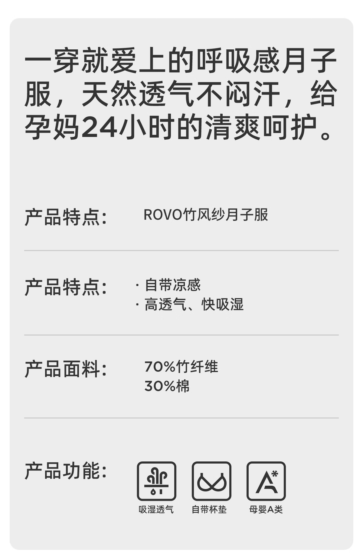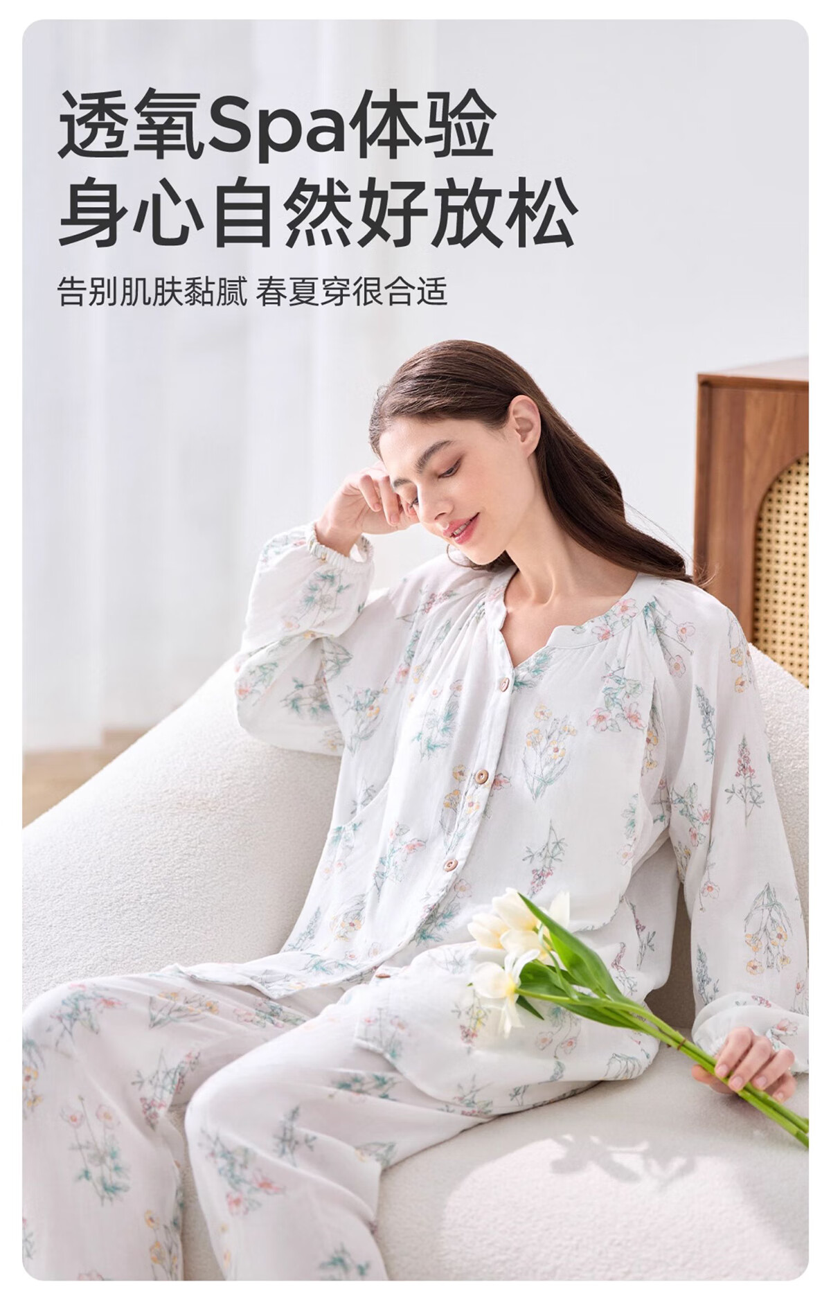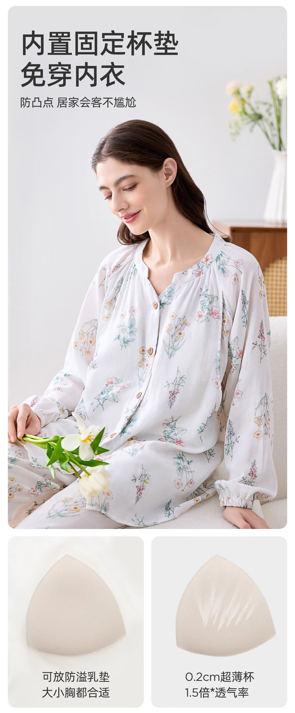 ROVO月子服吸湿透气带胸垫产后竹棉纤维孕妇睡衣哺乳家居服套装 雅白纤花【带胸垫 A类竹纤维】 L