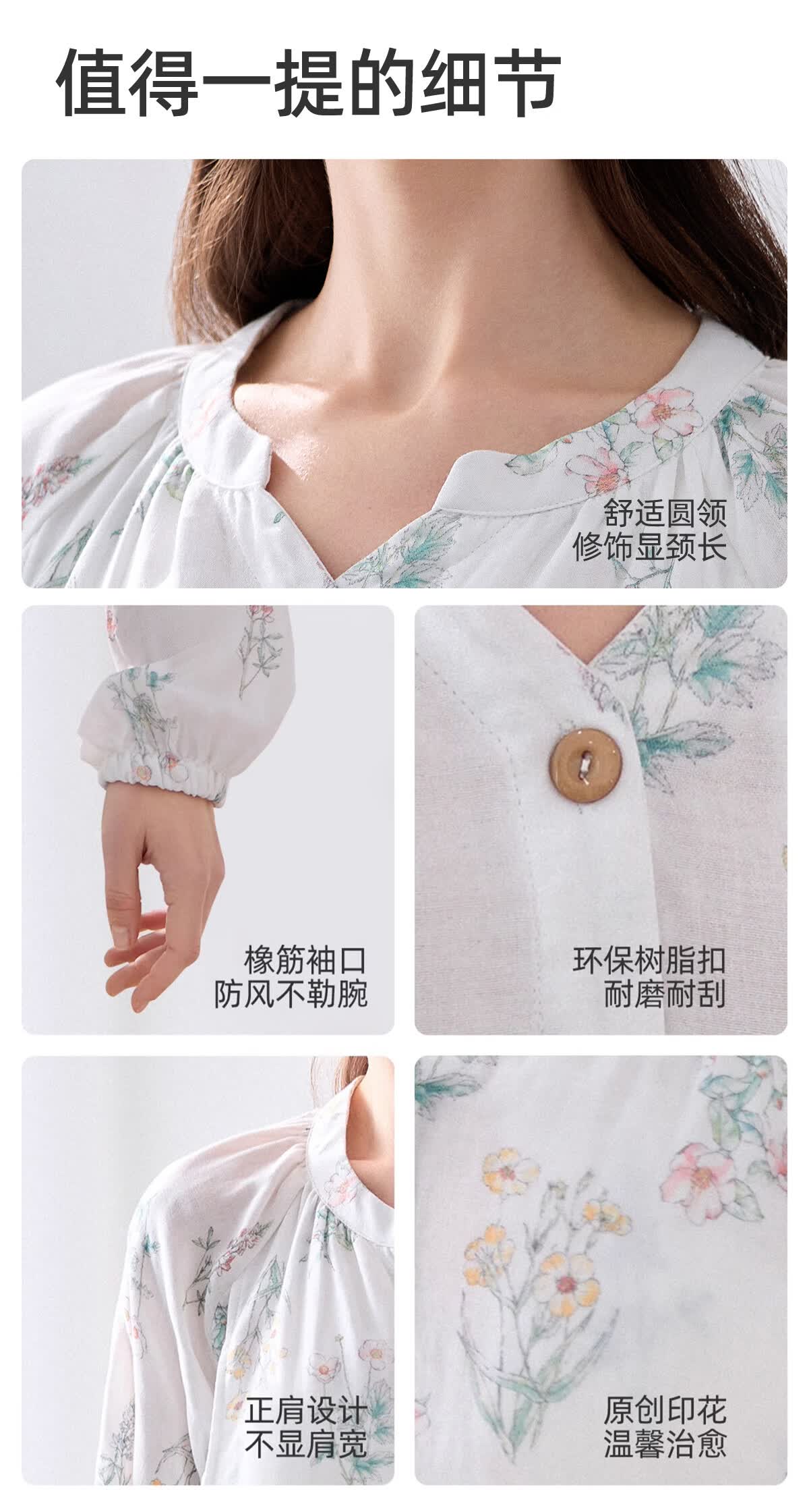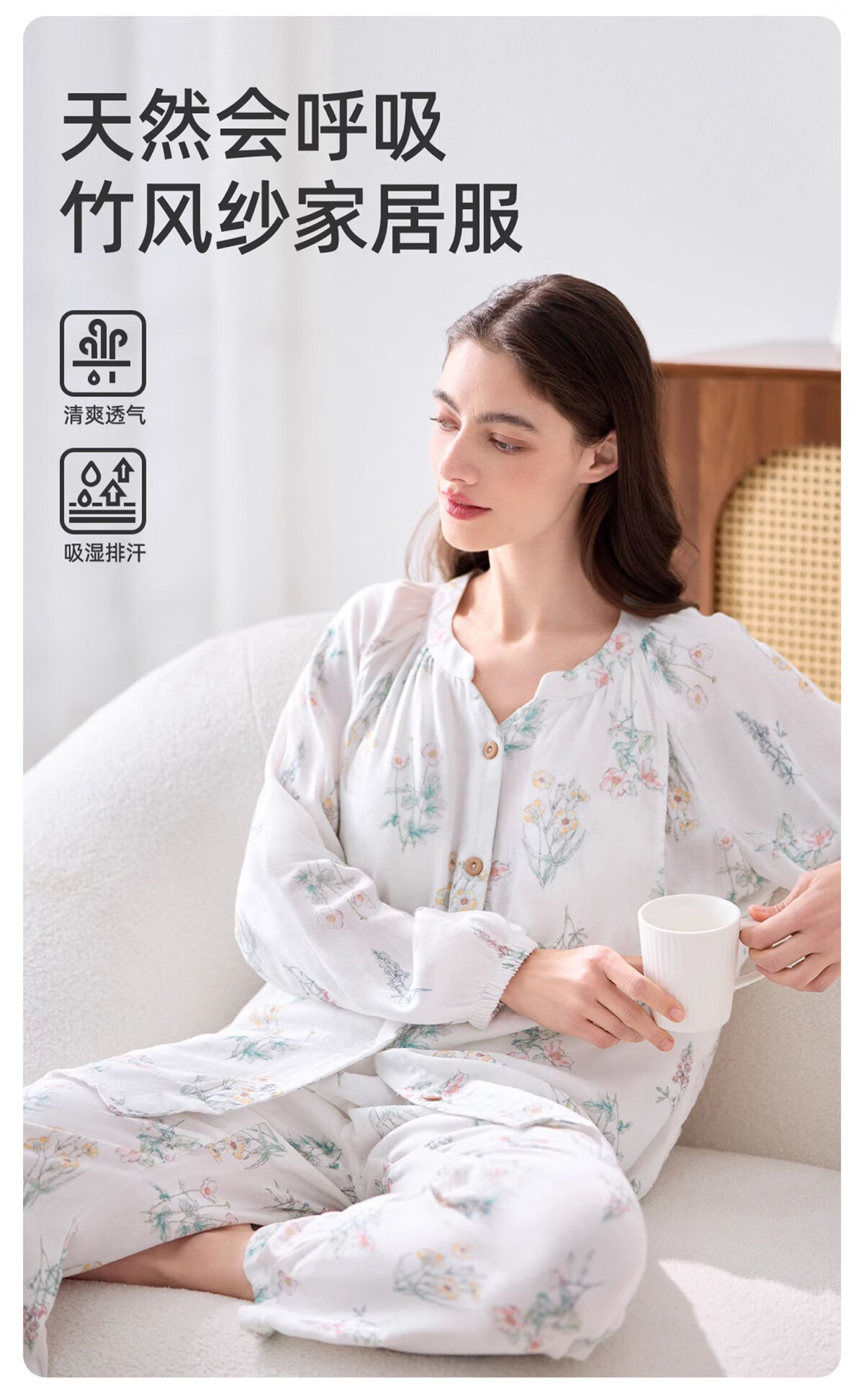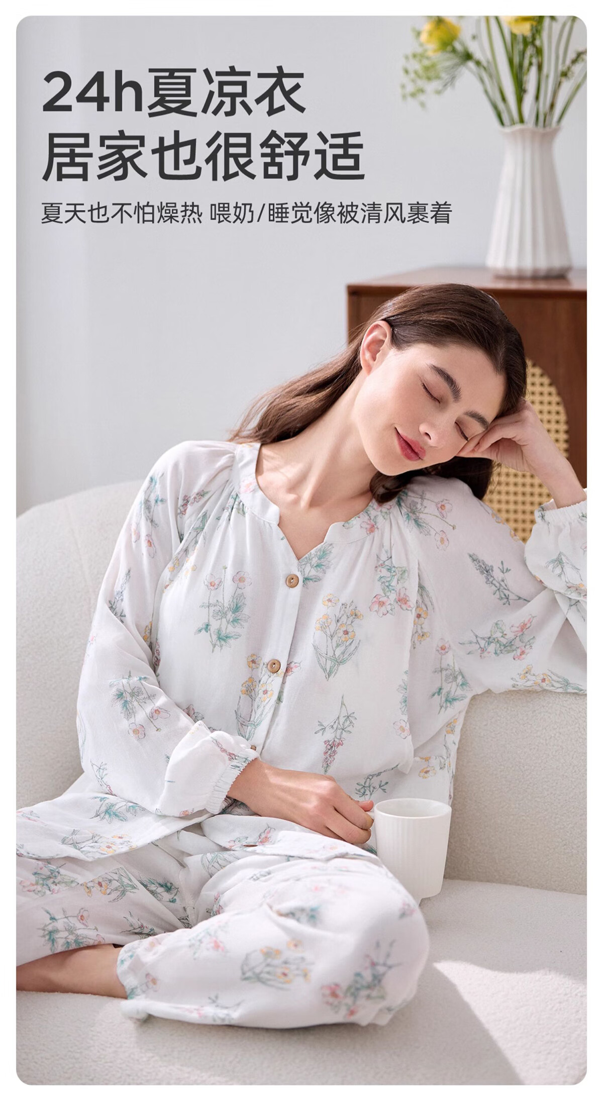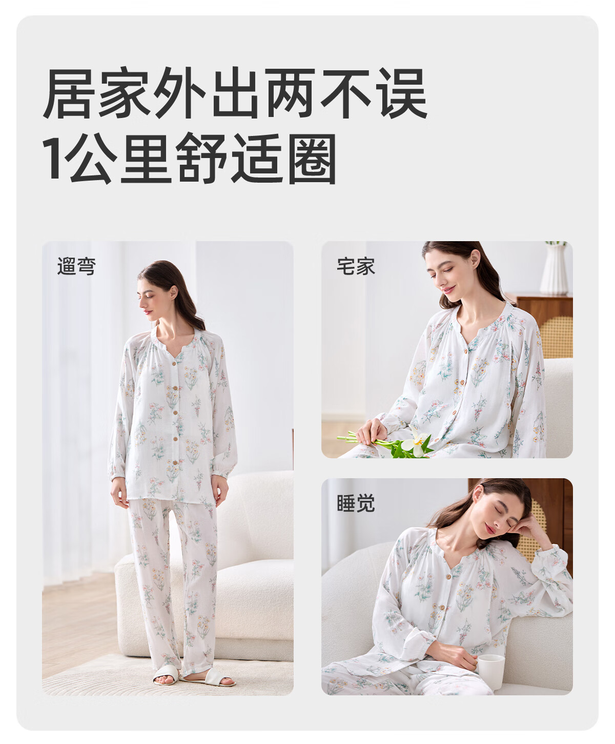 ROVO月子服吸湿透气带胸垫产后竹棉纤维孕妇睡衣哺乳家居服套装 雅白纤花【带胸垫 A类竹纤维】 L