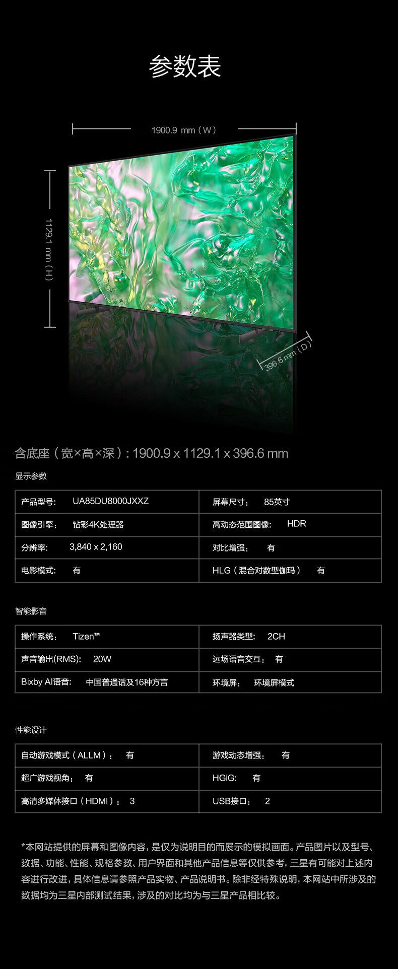 三星(SAMSUNG)85DU8000 85英寸 包安装版【固定挂架回音壁音响套装】 平板液晶AI电视 超薄4K