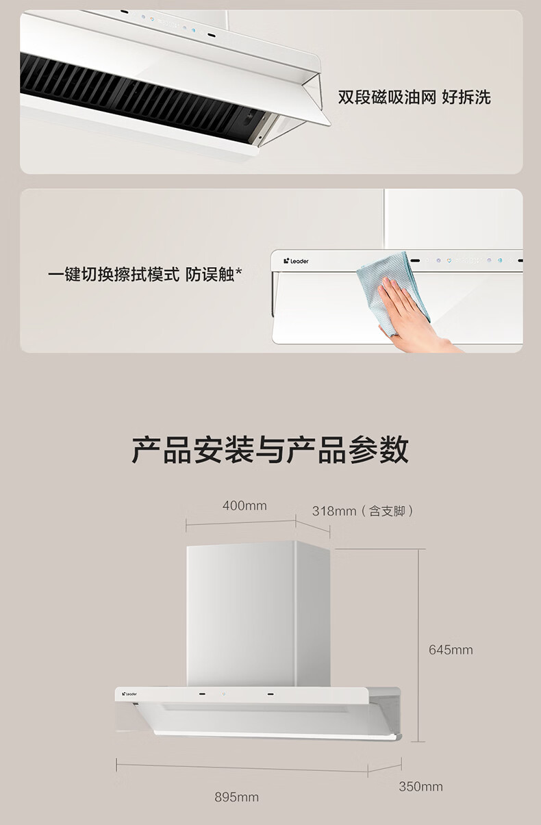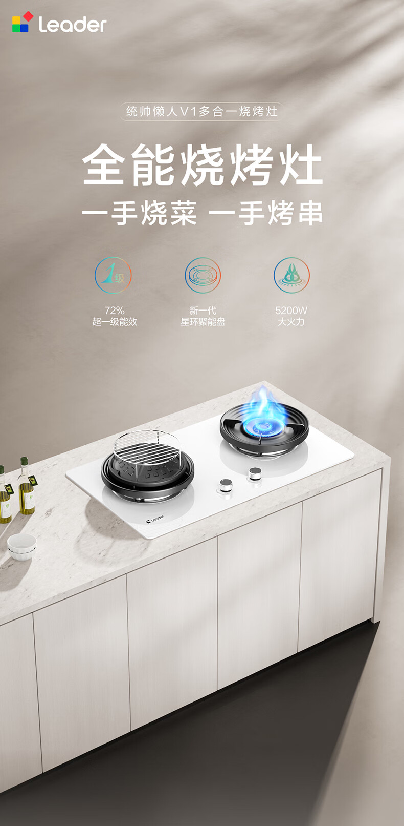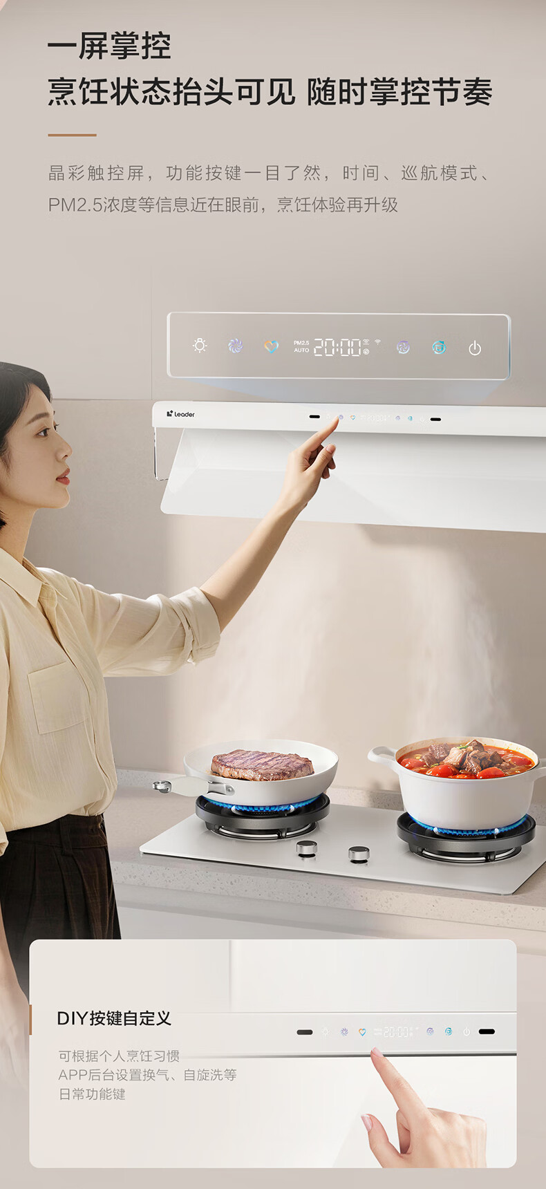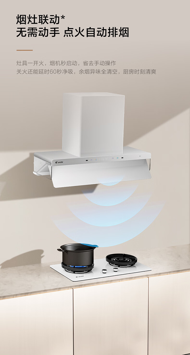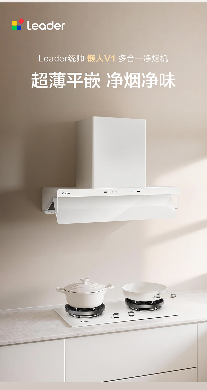 统帅(Leader)抽吸排油烟机懒人V1系列海尔 家用30风量以旧换新 白色顶侧一体烟灶套装联动 72%热效台嵌烧烤灶