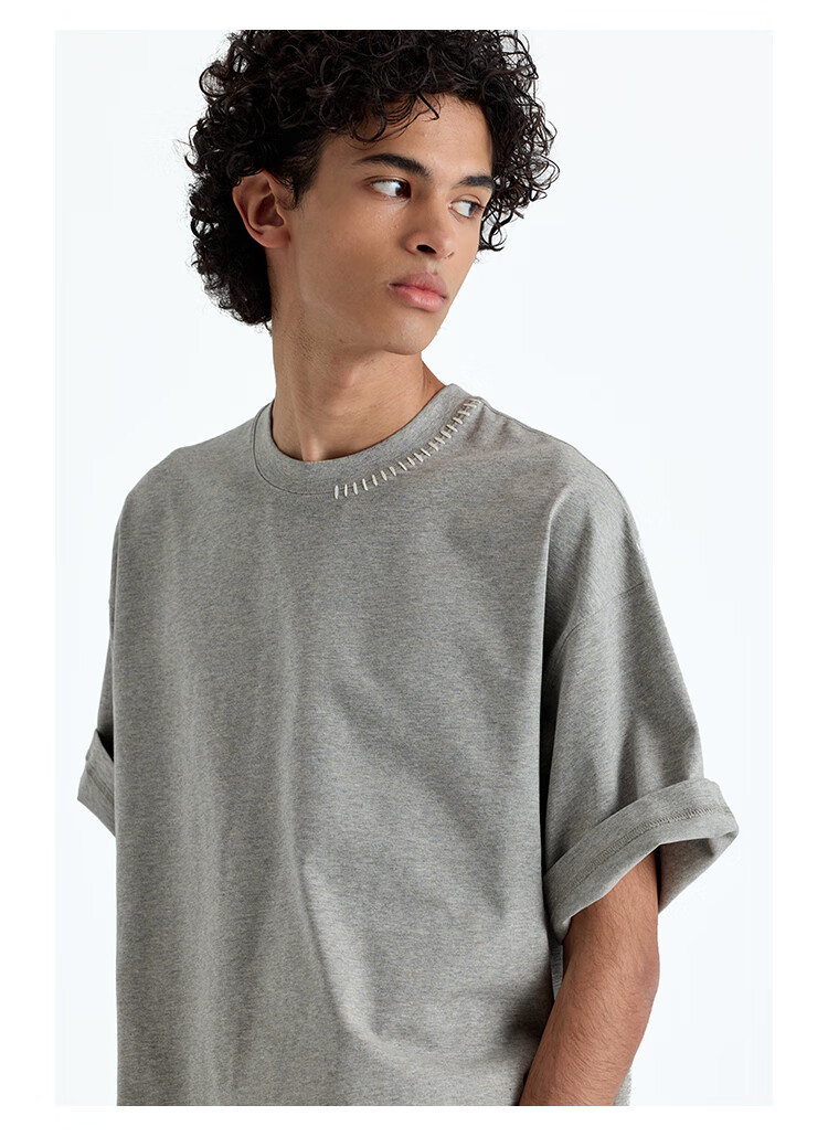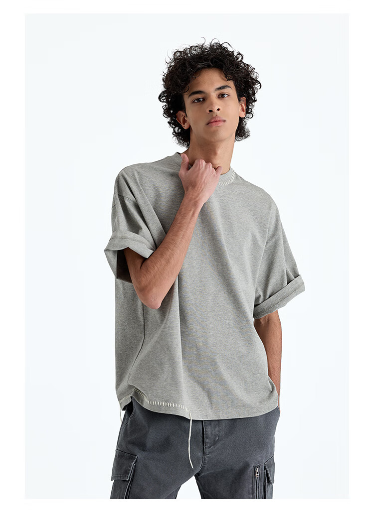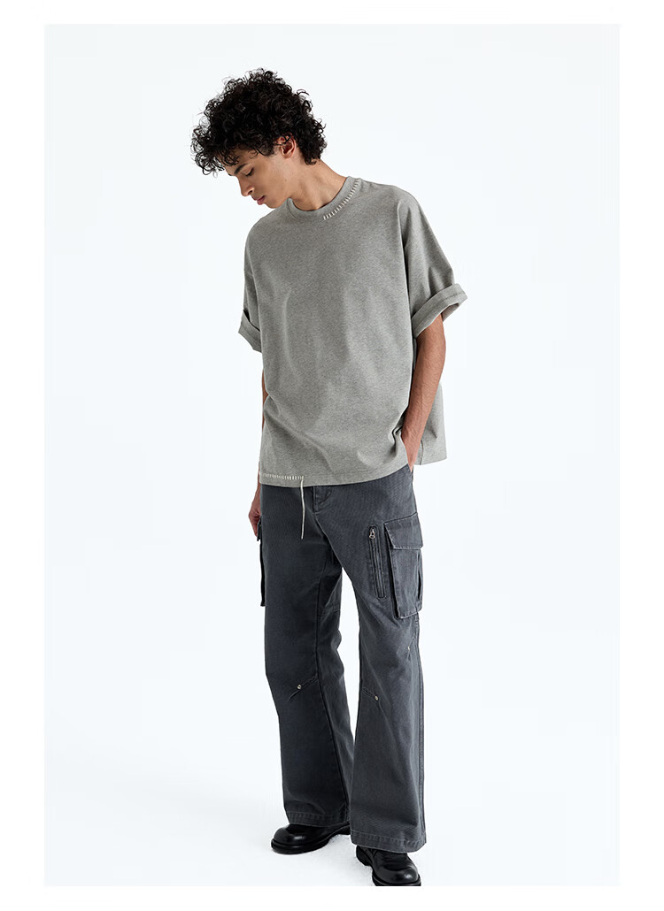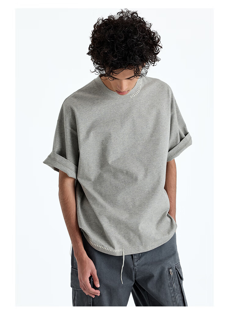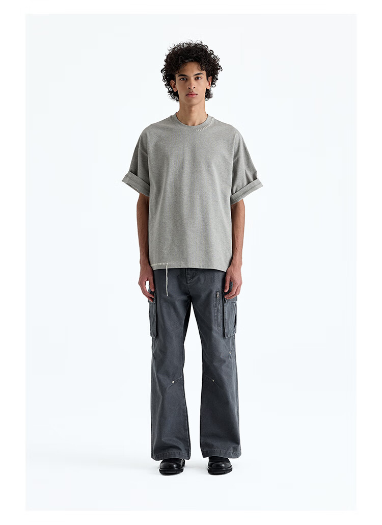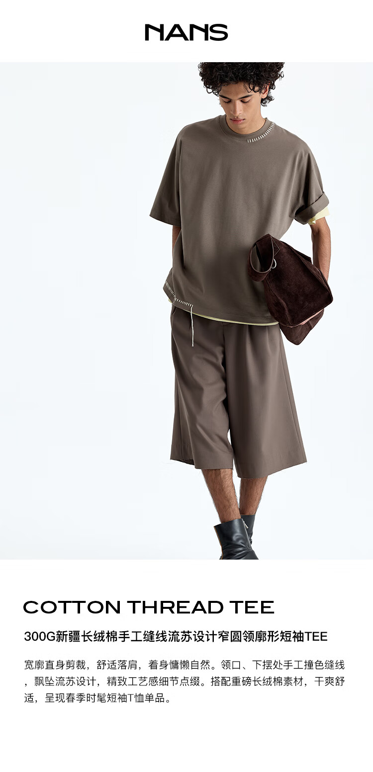 NANS STUDIO 300G新疆长绒棉手工缝线流苏设计窄圆领廓形短袖TEE NS9A11 GRAY / 麻灰 现货 S