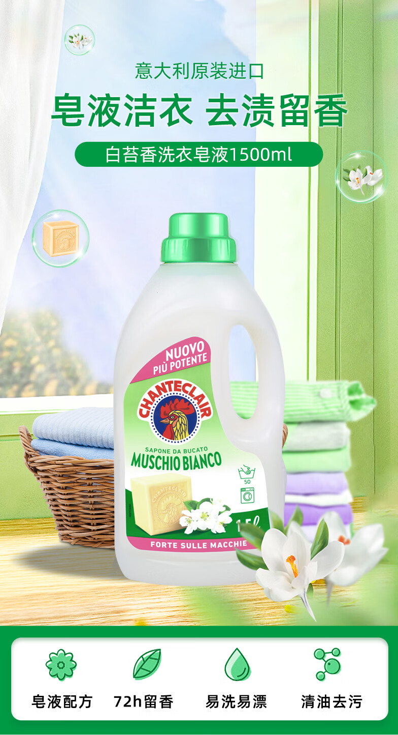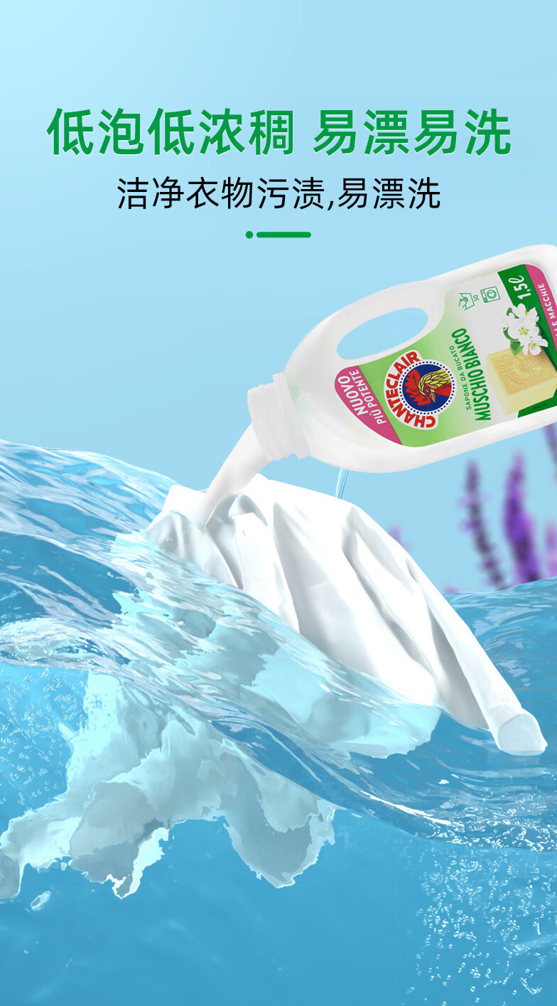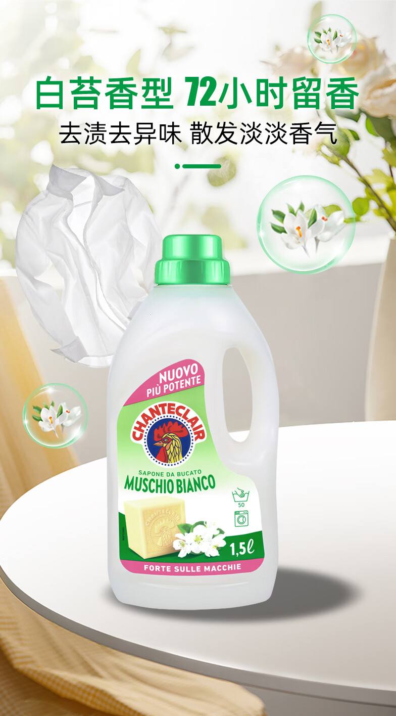 大公鸡管家(CHANTE CLAIR)意大利进口 液态洗衣皂洗衣液 衣物洗涤剂 低泡易漂洗温和不伤手 白苔香洗衣液1500ml*3瓶