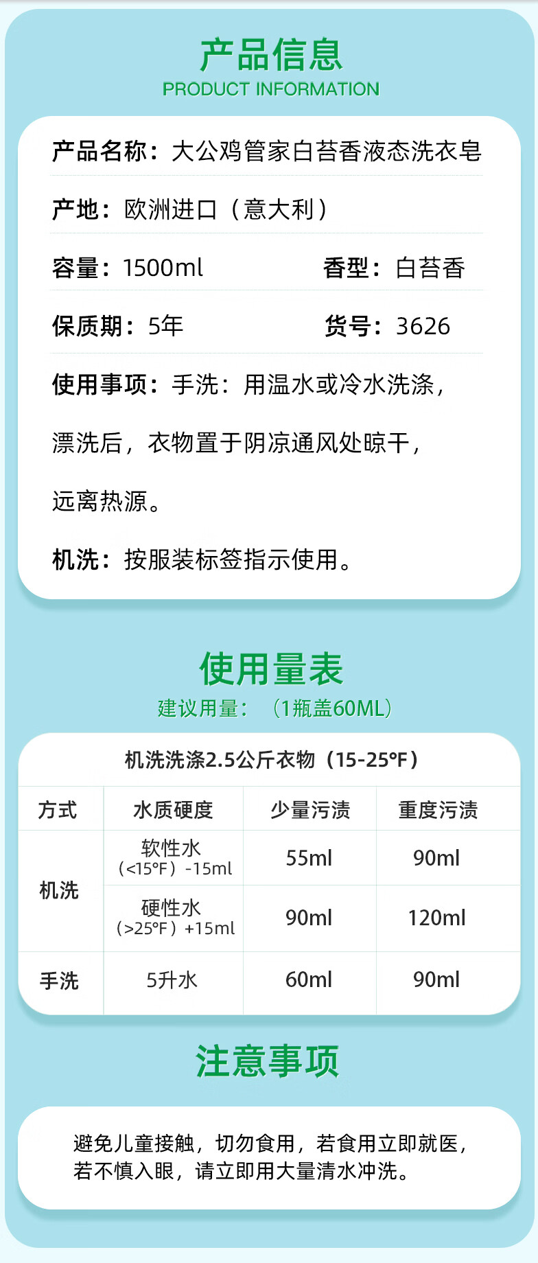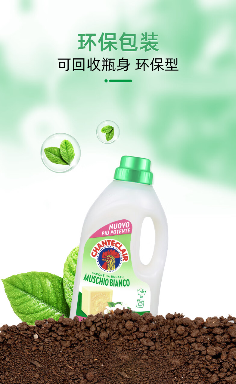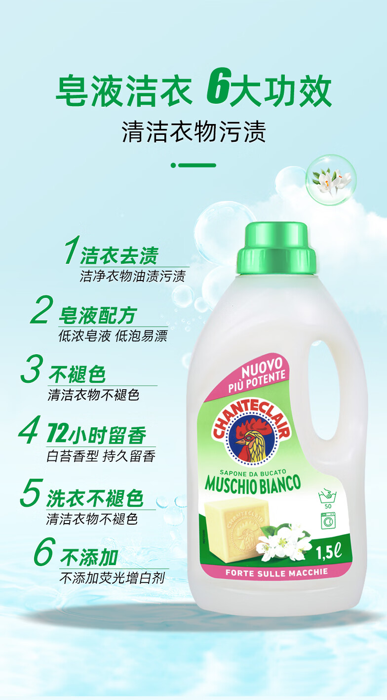 大公鸡管家(CHANTE CLAIR)意大利进口 液态洗衣皂洗衣液 衣物洗涤剂 低泡易漂洗温和不伤手 白苔香洗衣液1500ml*3瓶