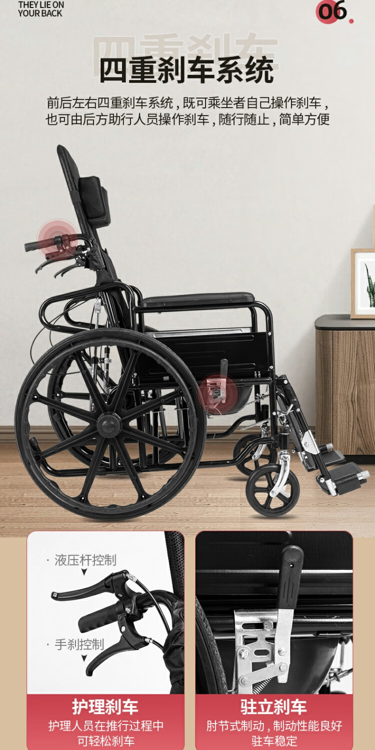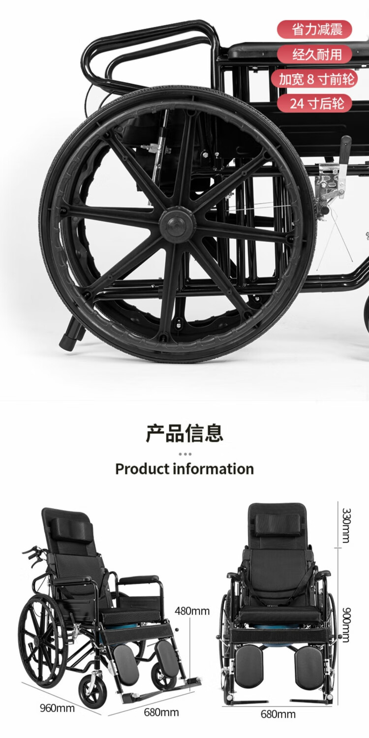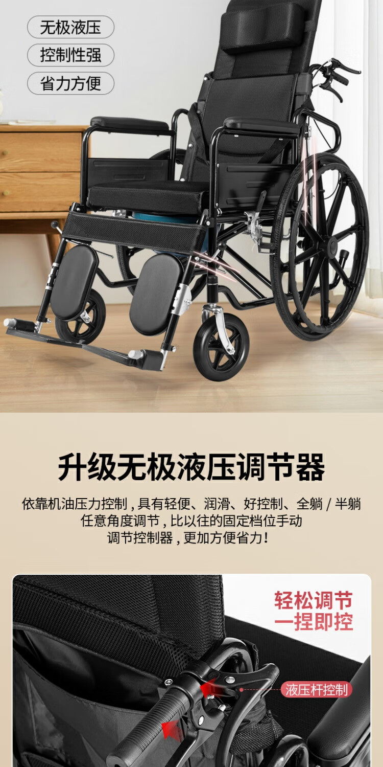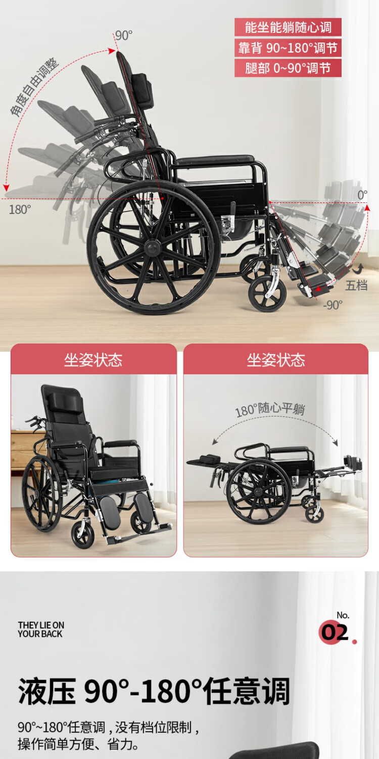 康立普(CANLIPE)轮椅瘫痪老人专用出行轻便折叠全躺多功能可躺可洗澡大小便手推车 【液压】透气耐磨牛津布+加厚减震轻便铝圈轮