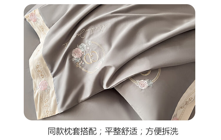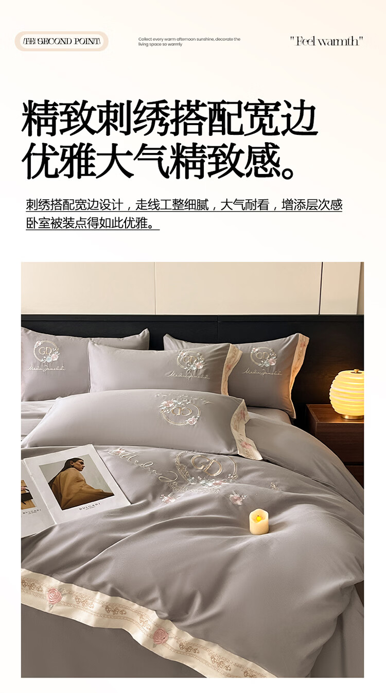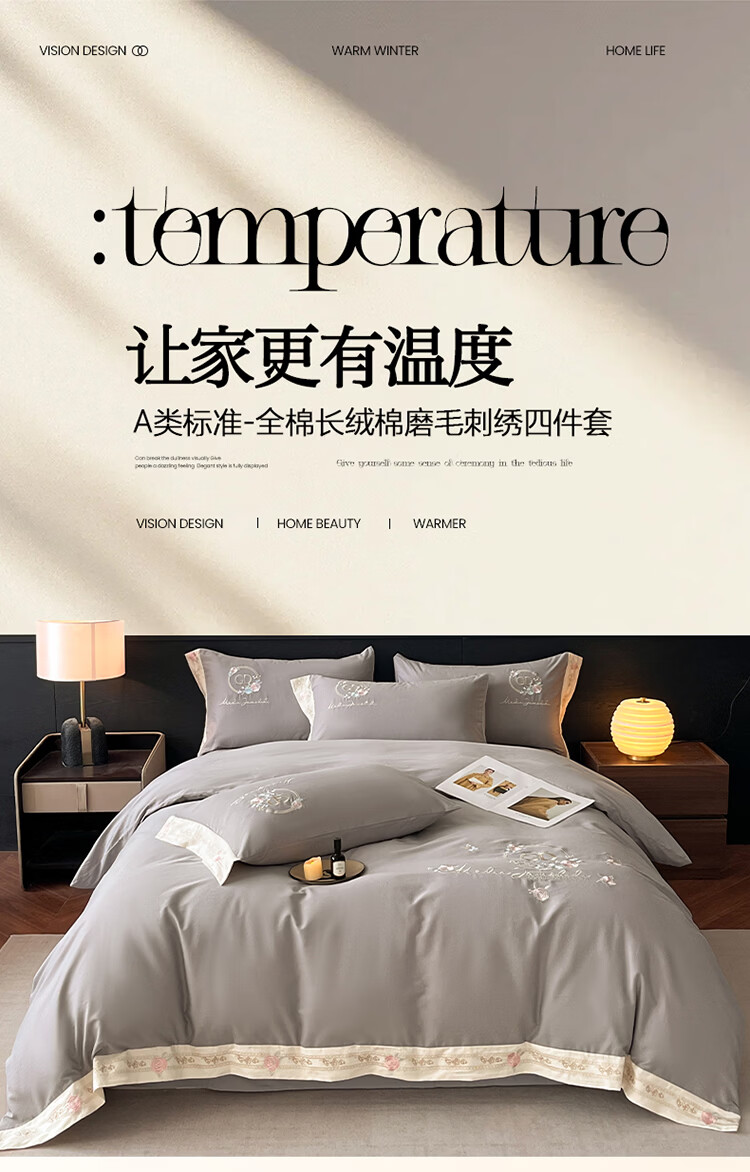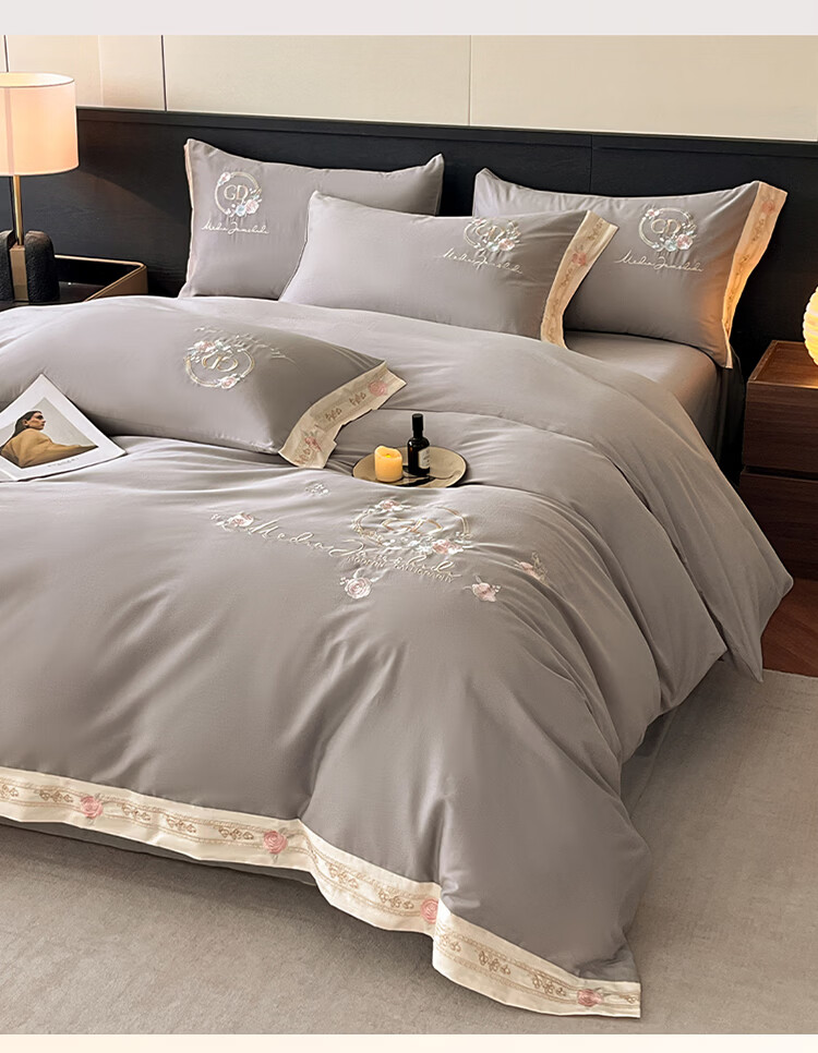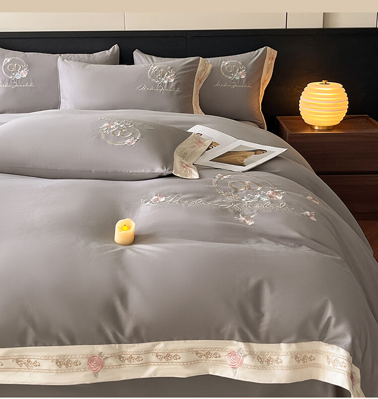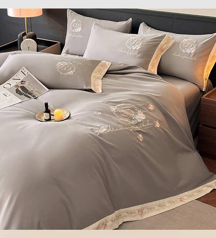 ROLAND LIVE全棉磨毛加厚A类四件套刺绣秋冬季被套床单纯棉床上用品1.8m床 PS 全棉磨毛四件套-斯嘉丽都市灰 标准 床单款 【被套200*230cm】