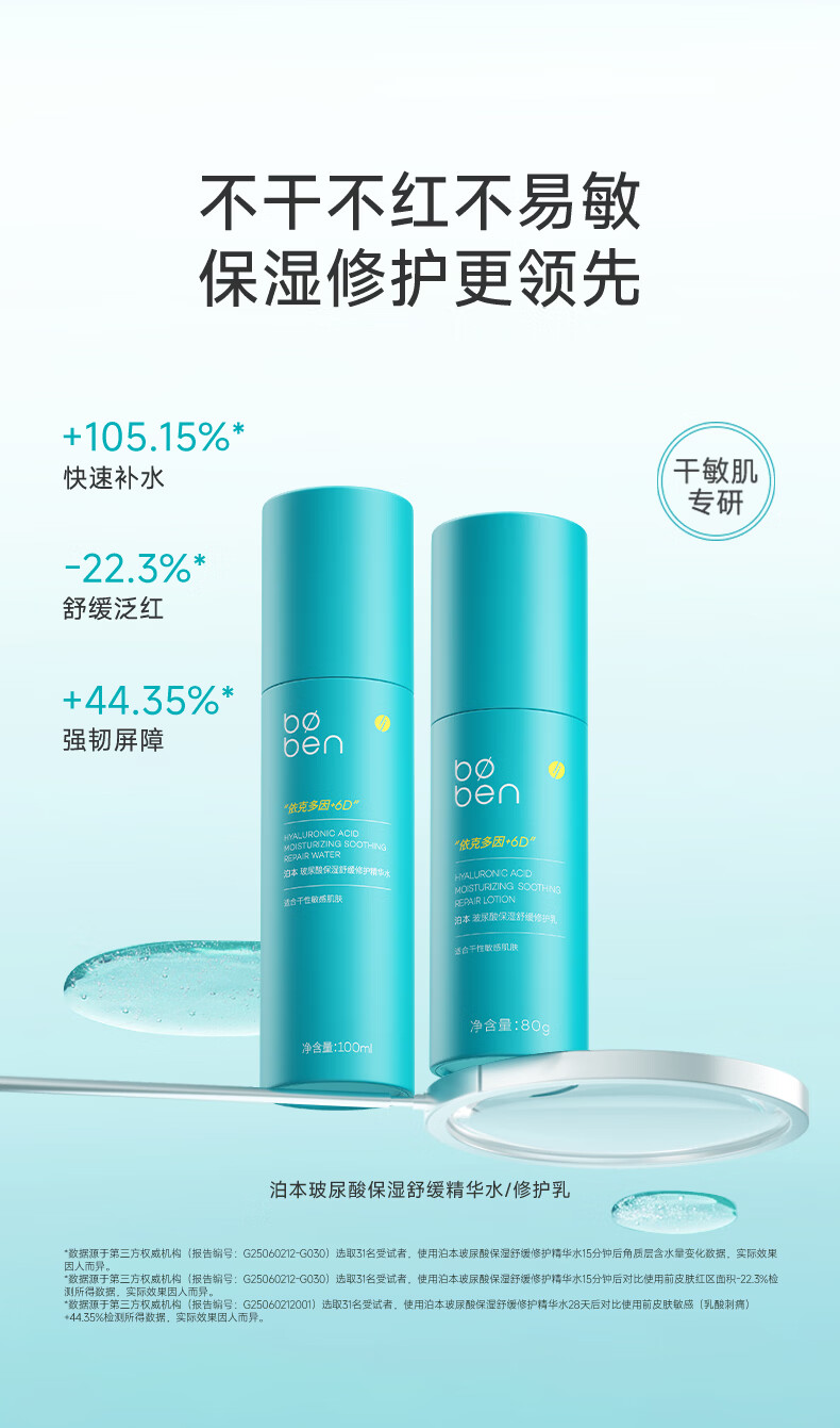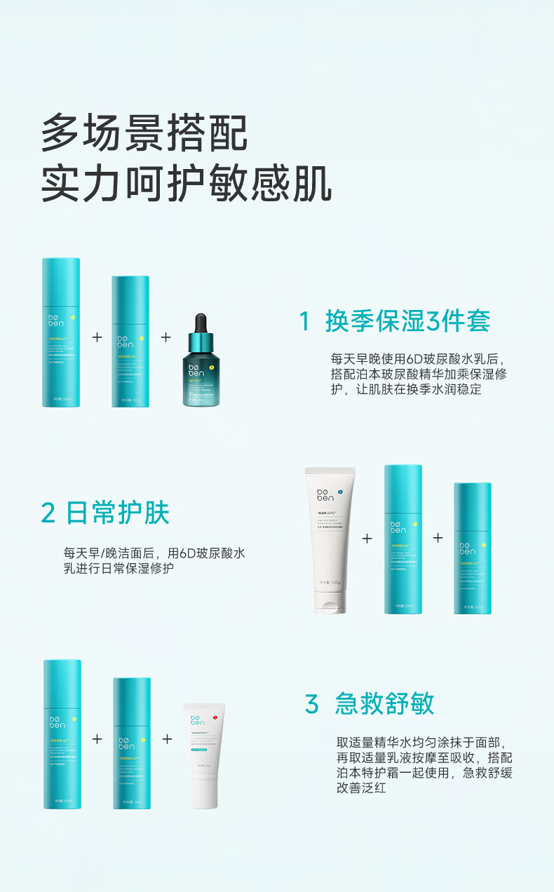 泊本6D玻尿酸水乳套装修护保湿补水舒缓泛红敏感护肤品滋润 3件套:6D玻尿酸水乳洁面100+80+100