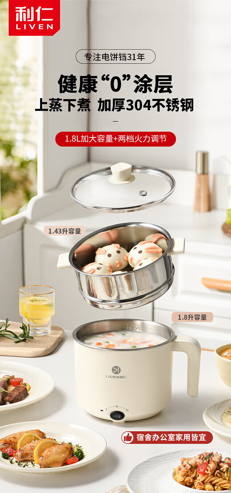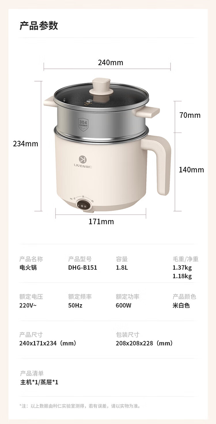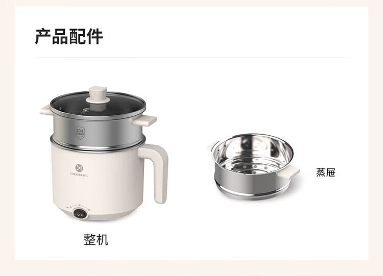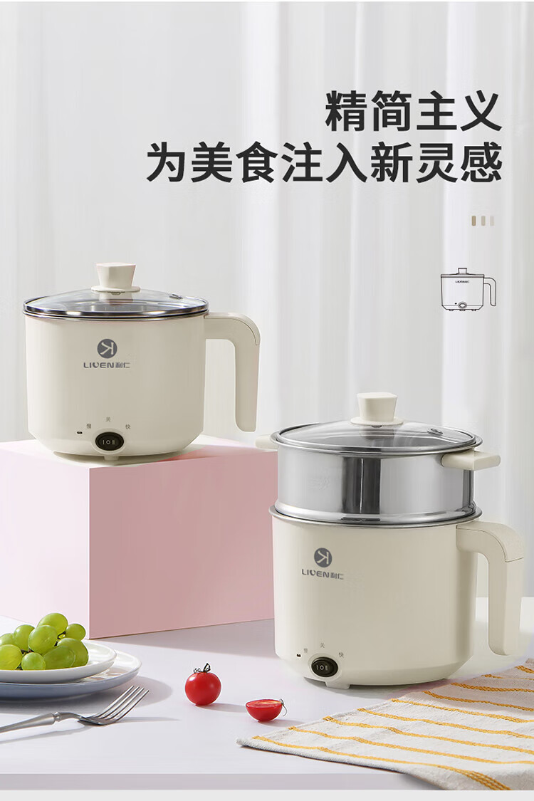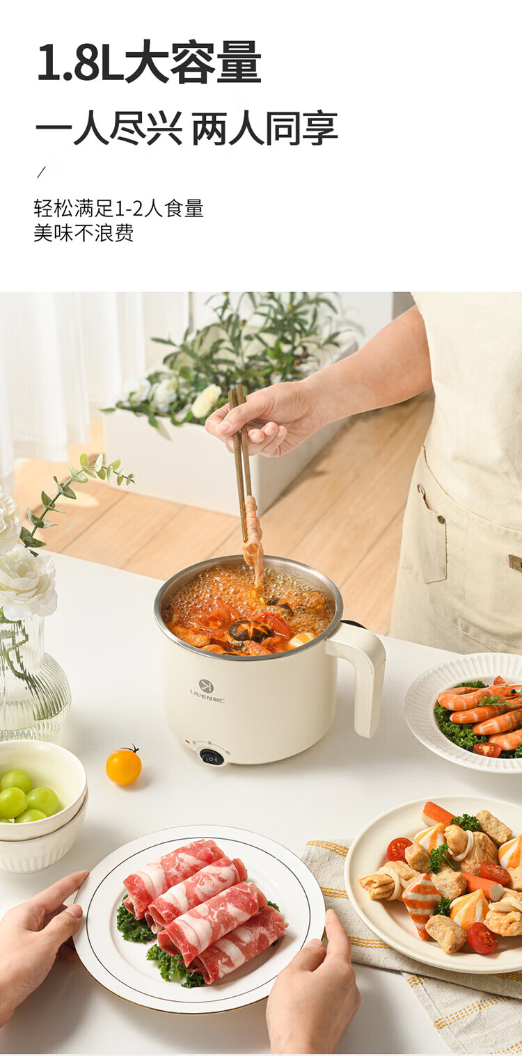 利仁(Liven)电煮锅304不锈钢0涂层1.8L小电锅宿舍电火锅电蒸锅炖蒸煮一体多功能学生锅小型1-2人用DHG-B151