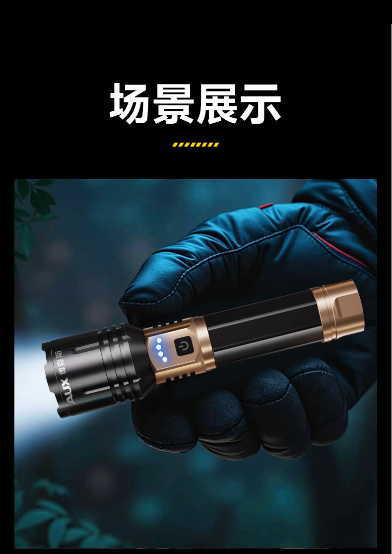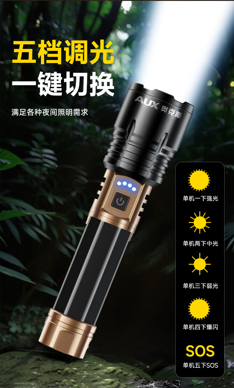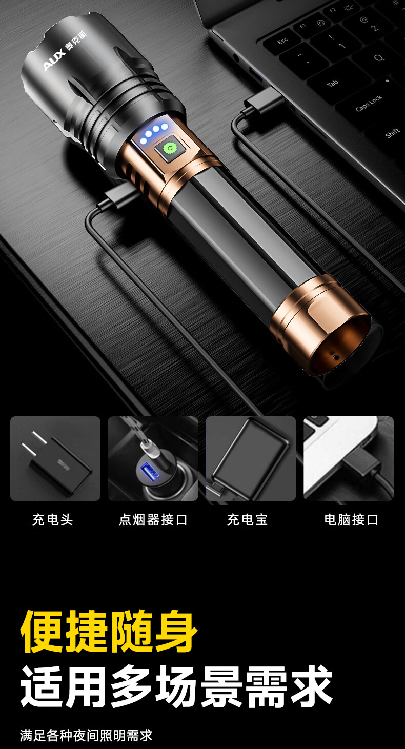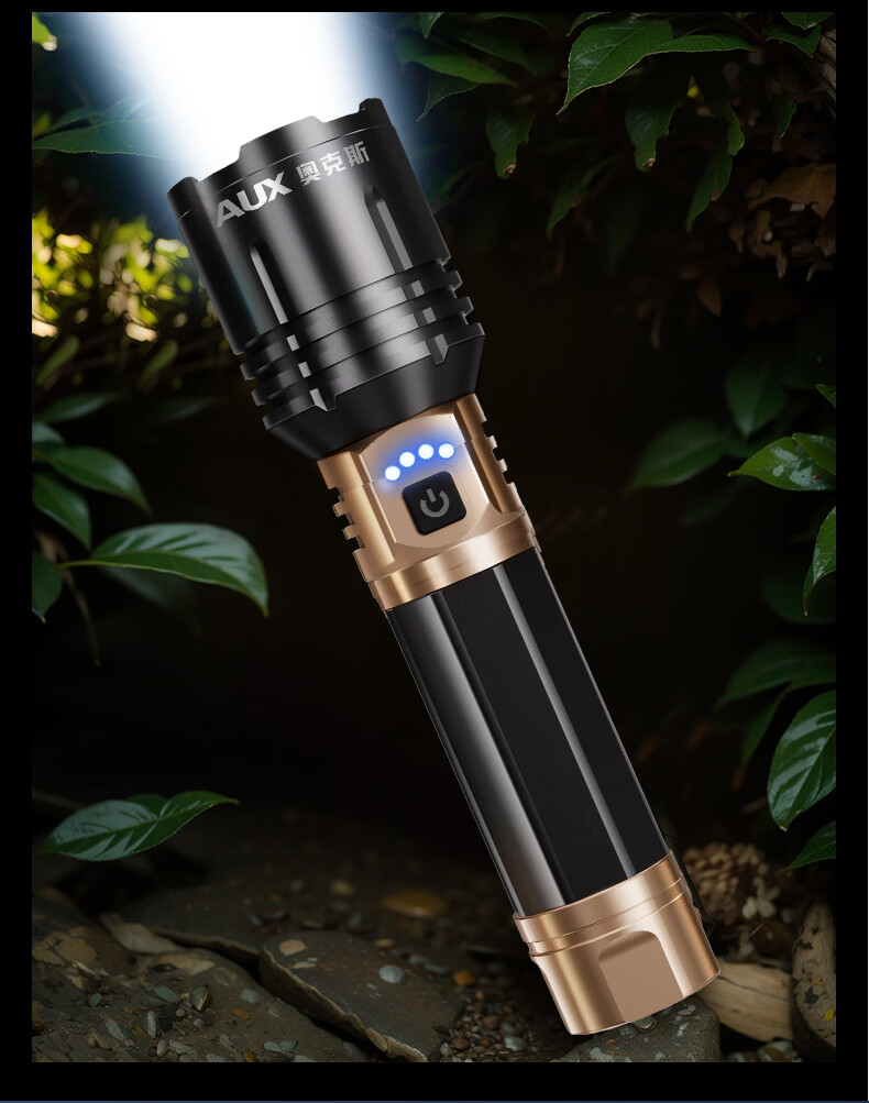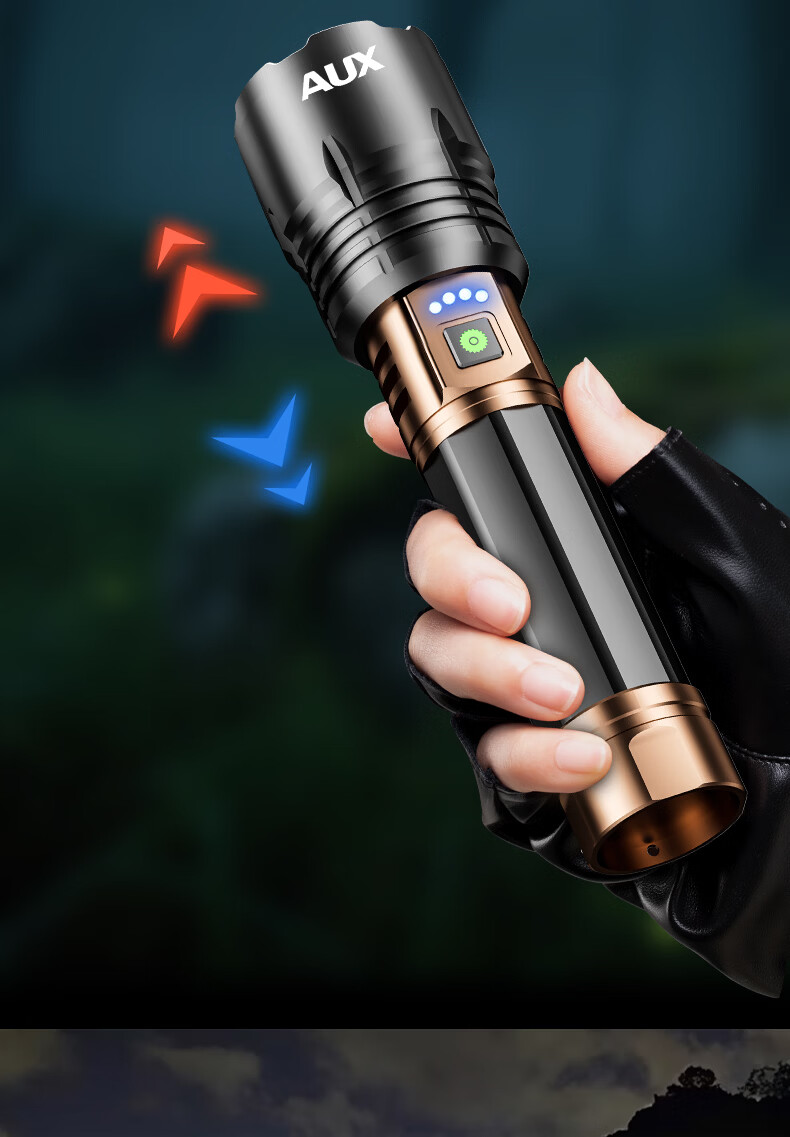 奥克斯(AUX)强光手电筒变焦超亮充电长续航大功率便携式远射户外镭射巡逻家用 【顶配款+三色镜片】双电池 12000毫安 Type-C快充