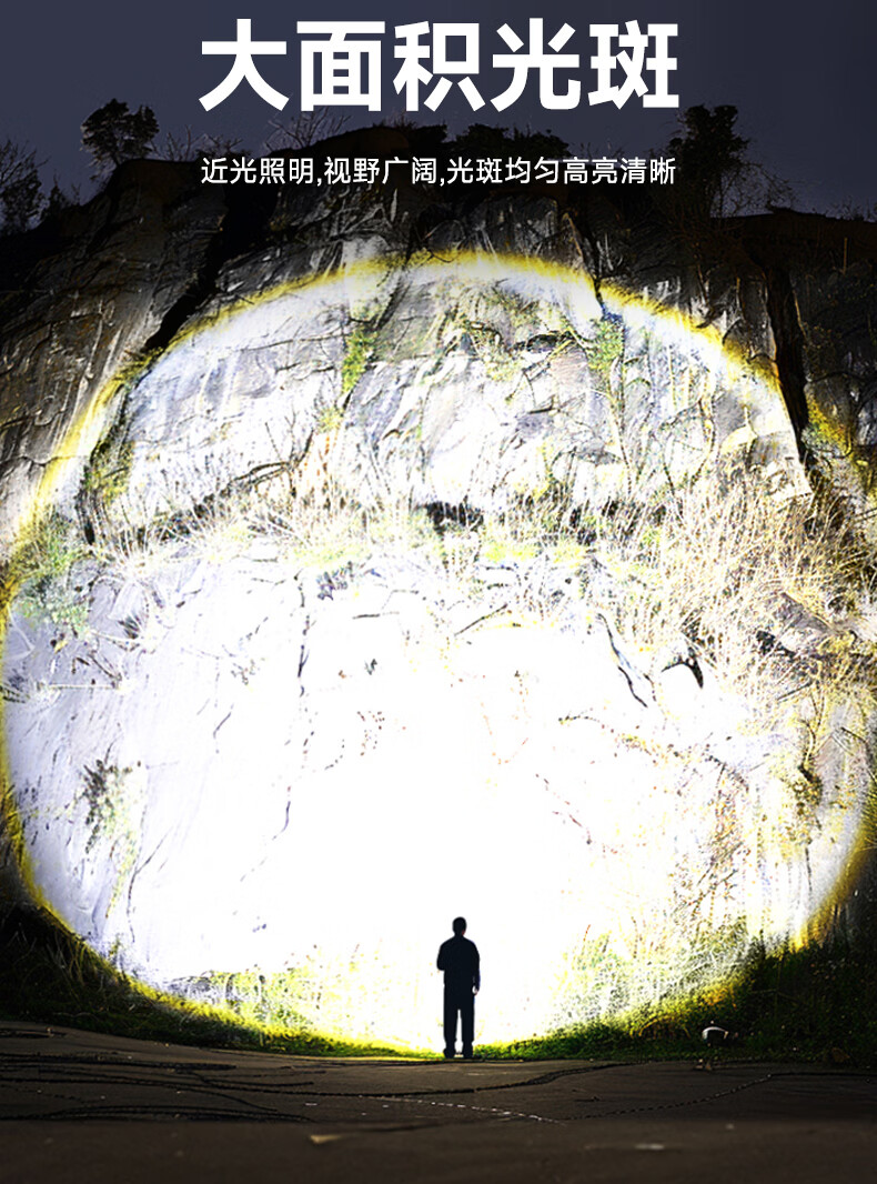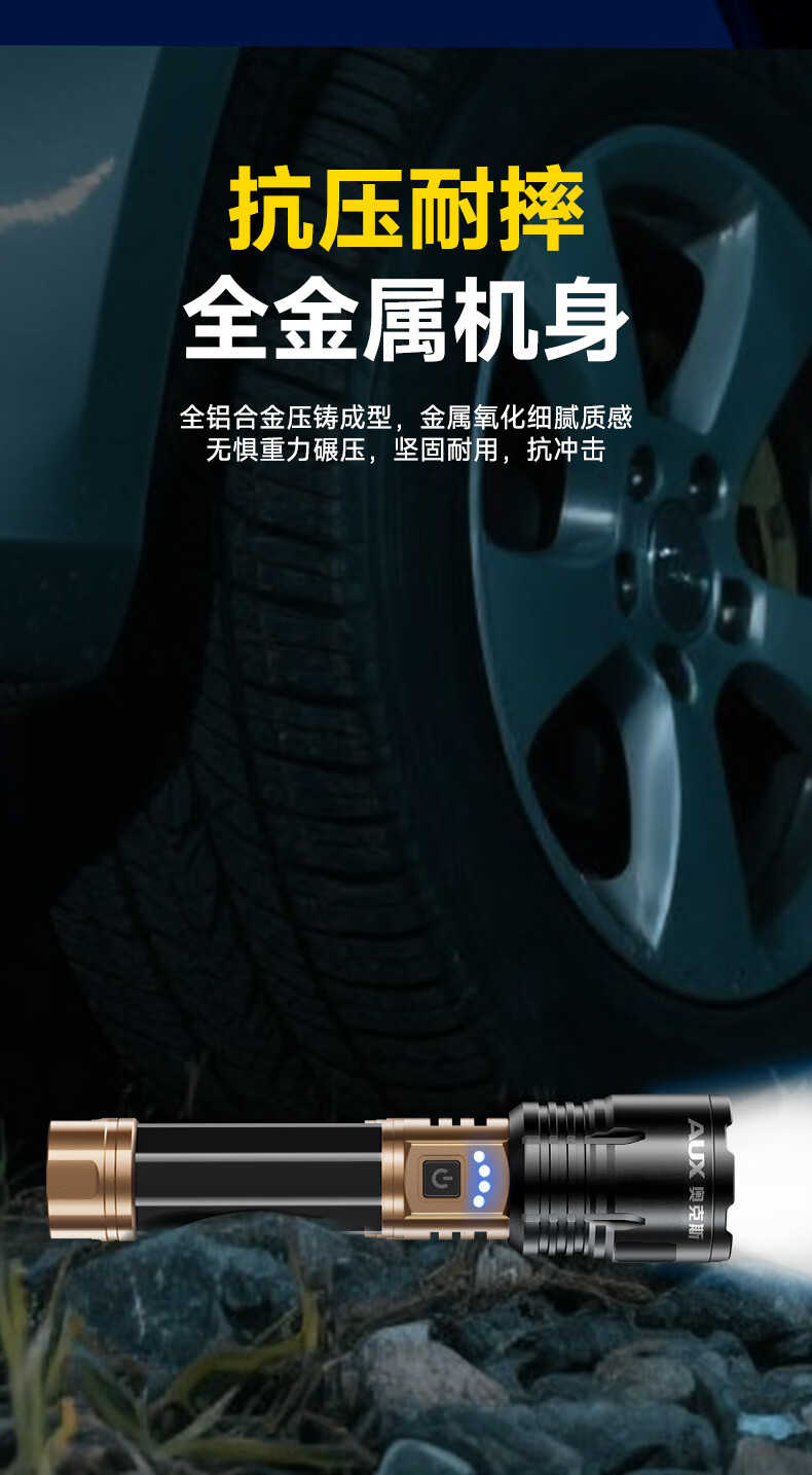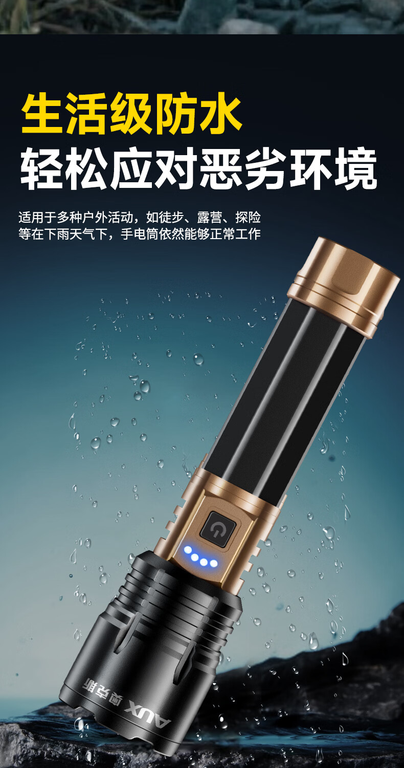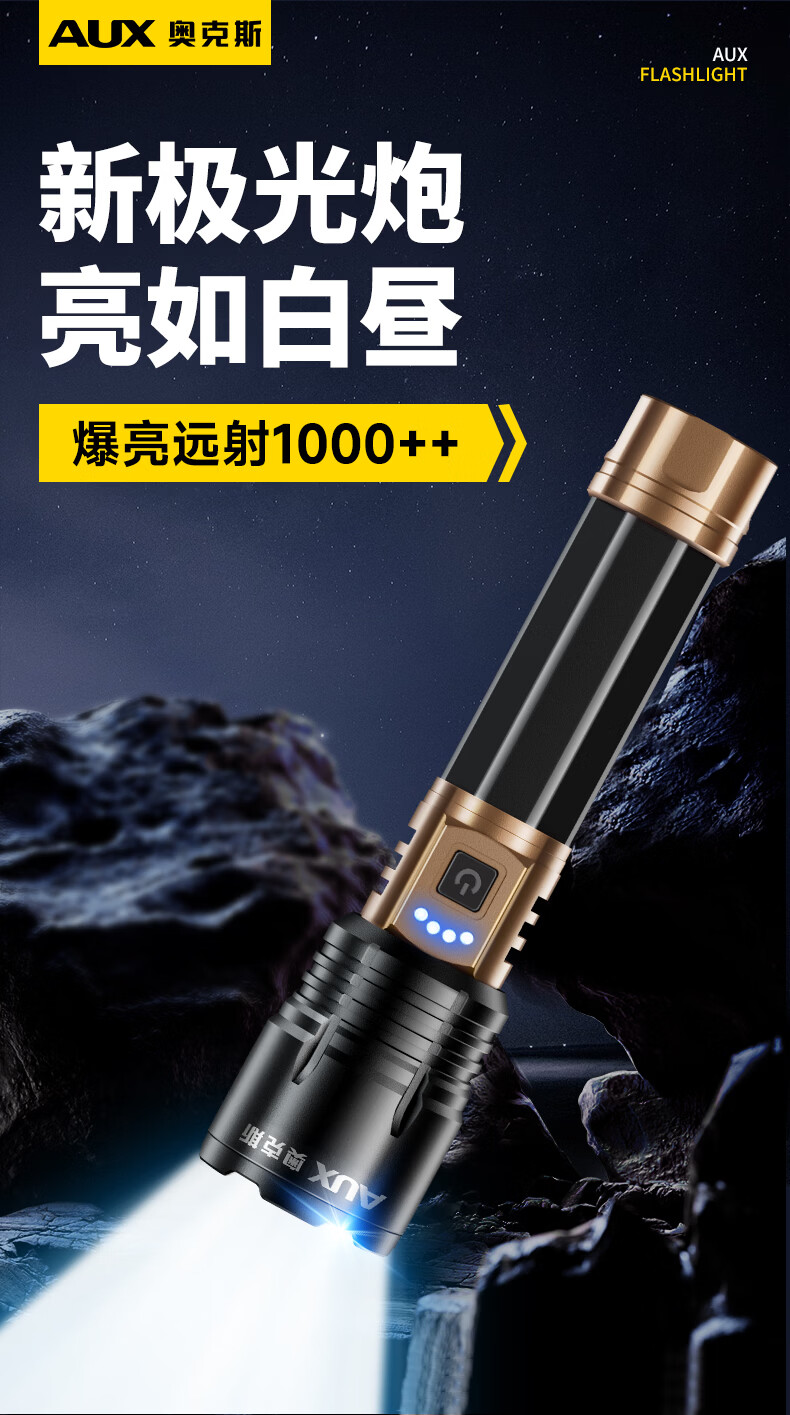 奥克斯(AUX)强光手电筒变焦超亮充电长续航大功率便携式远射户外镭射巡逻家用 【顶配款+三色镜片】双电池 12000毫安 Type-C快充