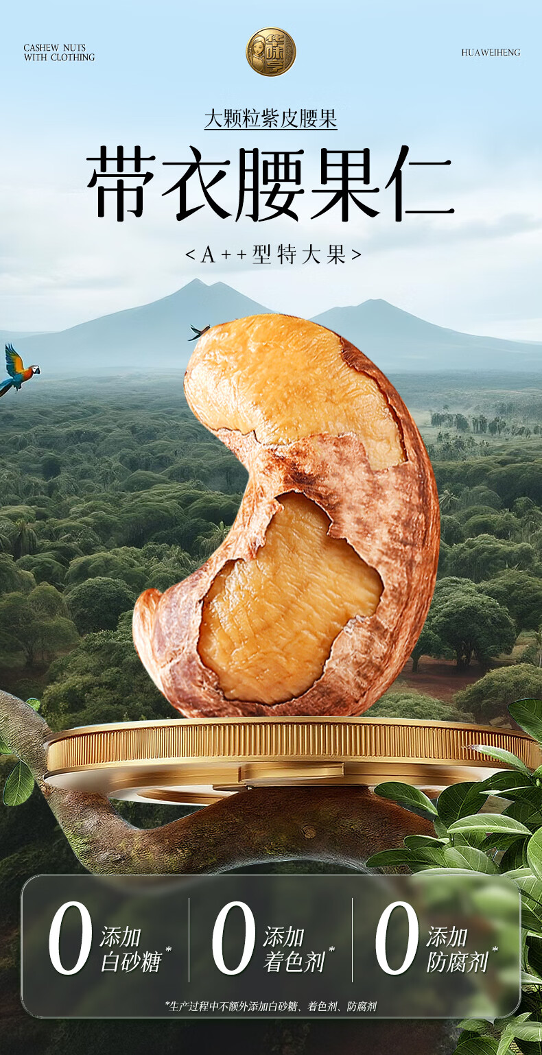 华味亨 带衣腰果505/袋 大颗粒1斤休闲零食紫衣腰果儿童孕妇坚果B 505g/袋(新品)