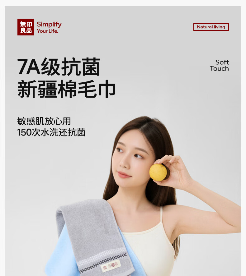 无印良品毛巾7A抗菌新疆全棉柔软亲肤100%纯棉不易掉毛2条装加厚a类擦脸巾