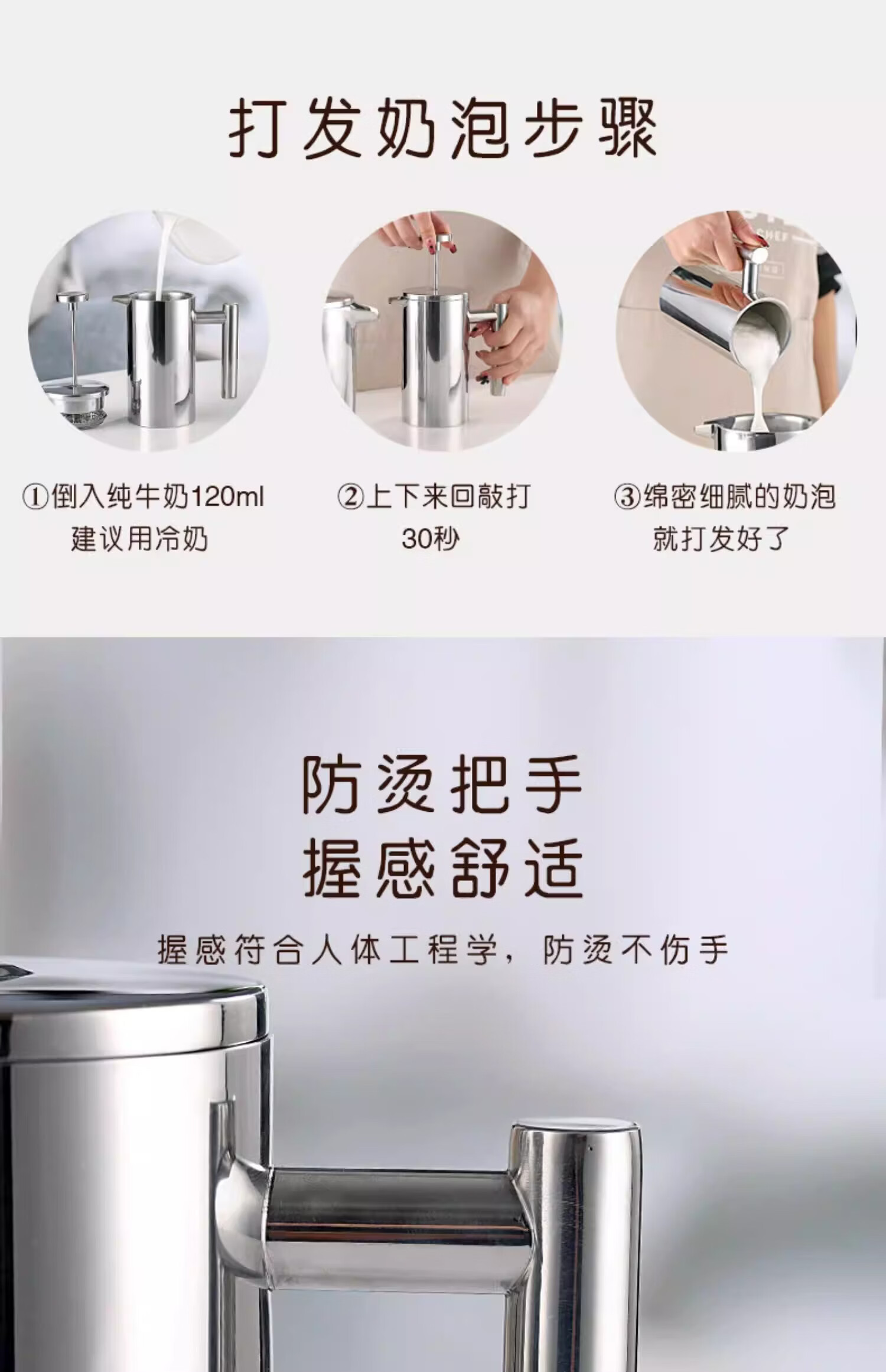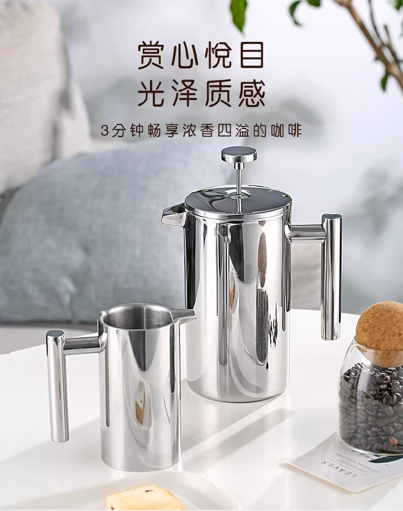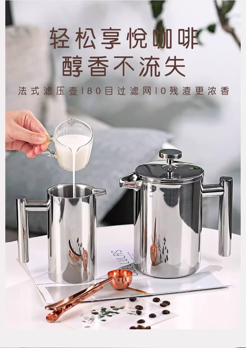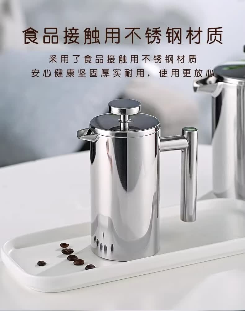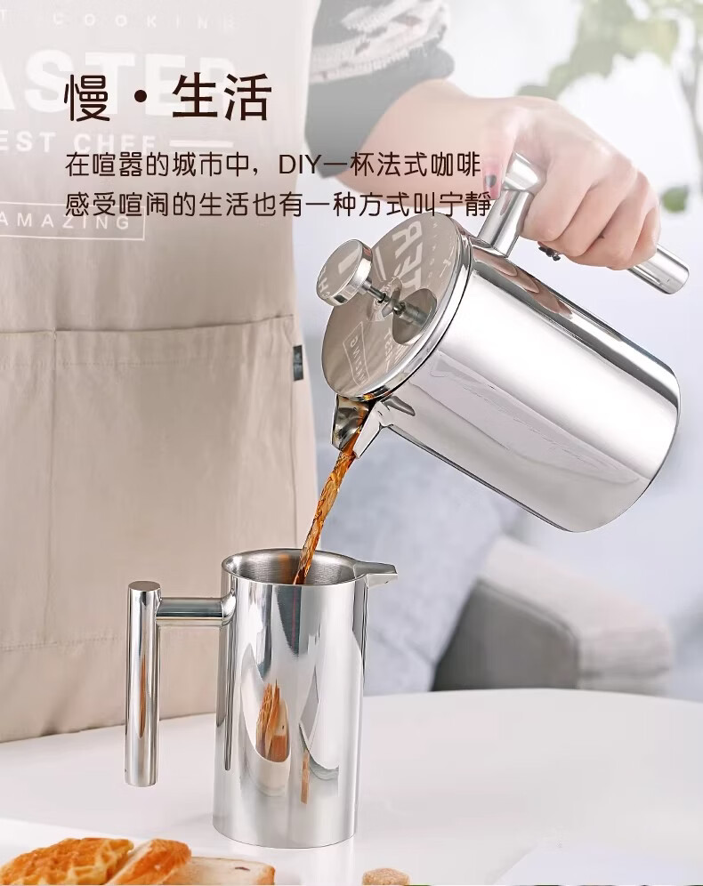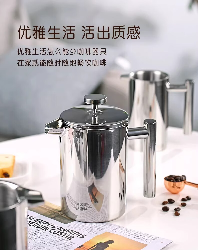 Bincoo双层304不锈钢法压壶过滤家用大容量手冲咖啡壶牛奶打泡器 钢本色-350ml