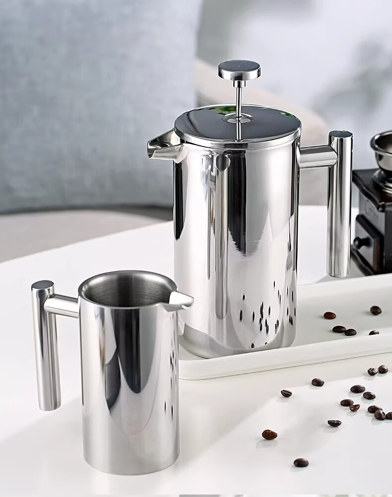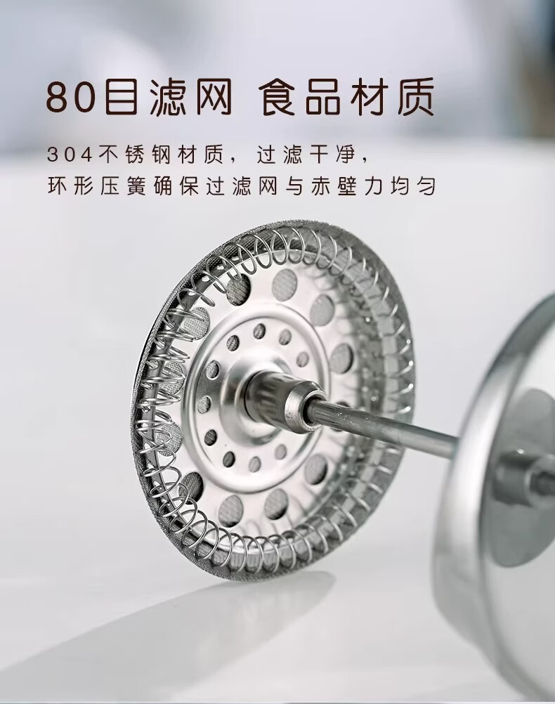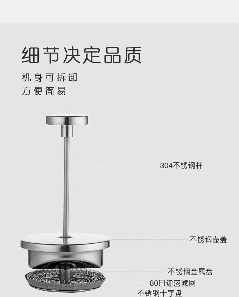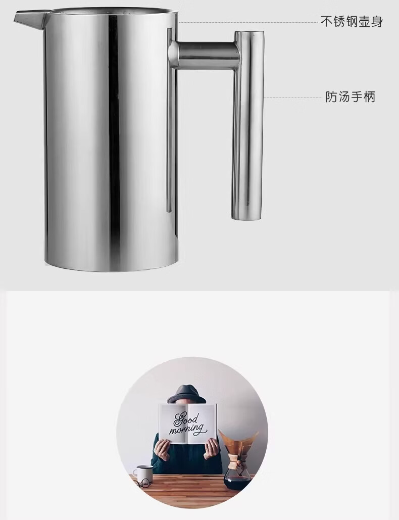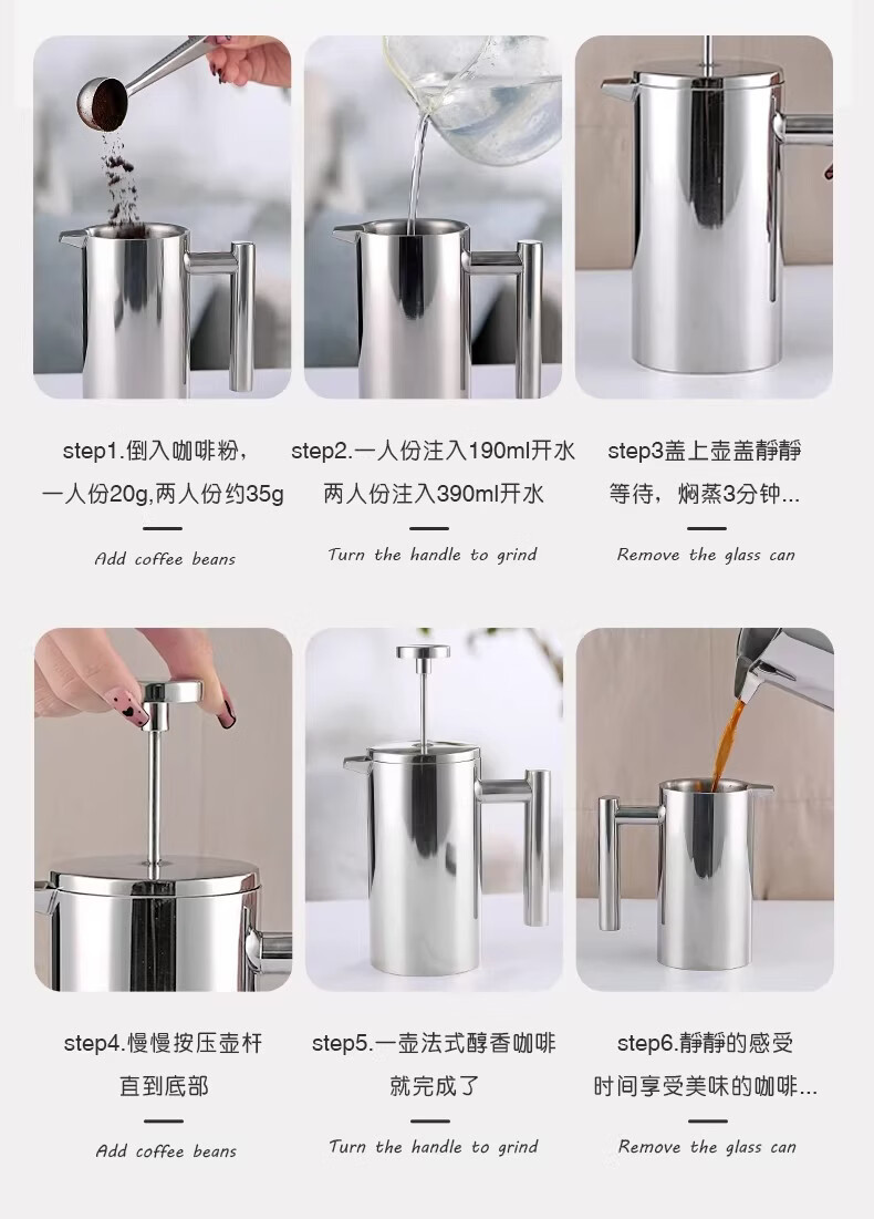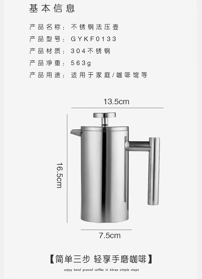Bincoo双层304不锈钢法压壶过滤家用大容量手冲咖啡壶牛奶打泡器 钢本色-350ml