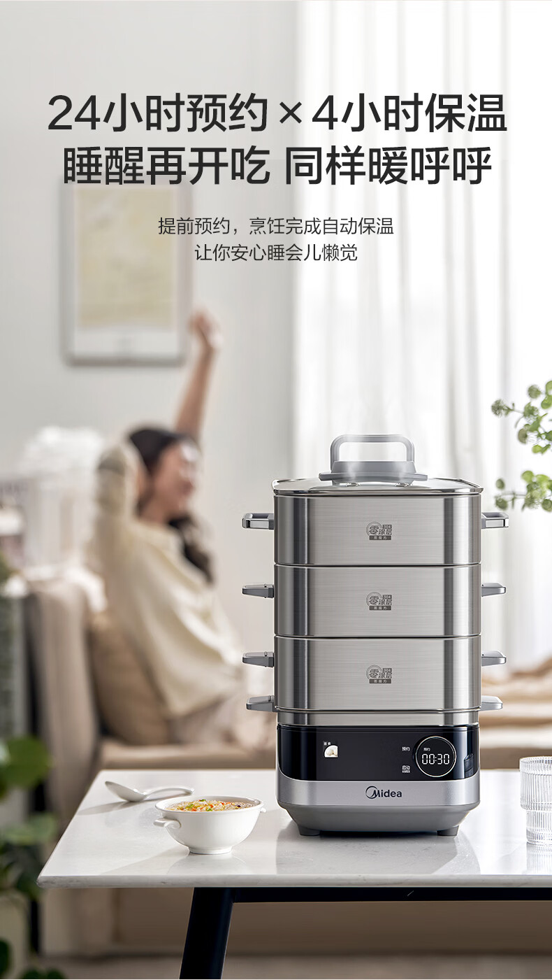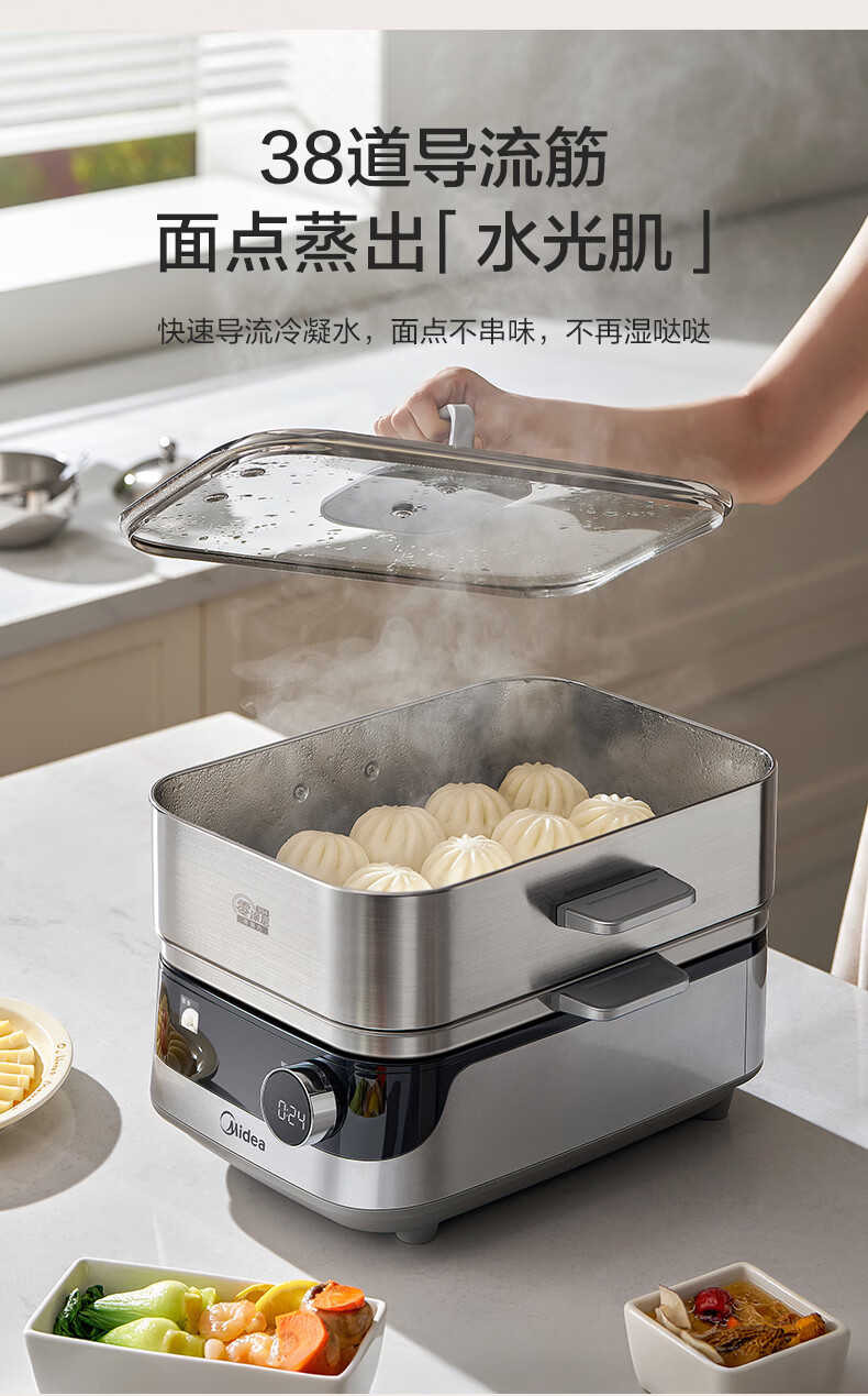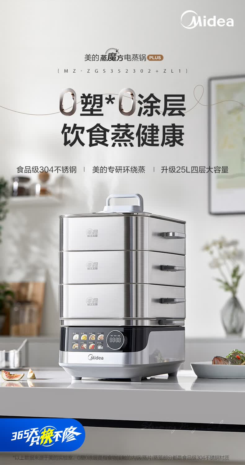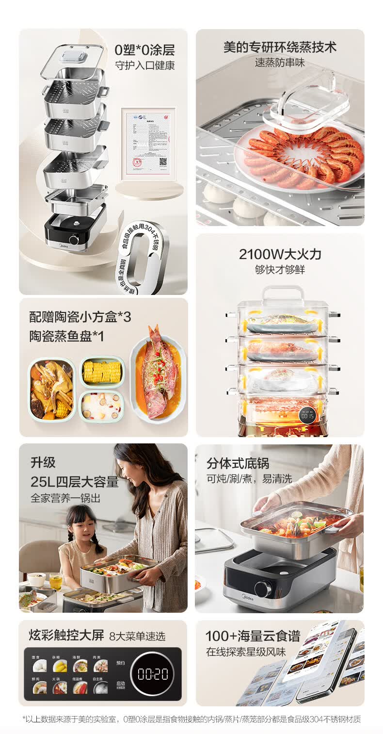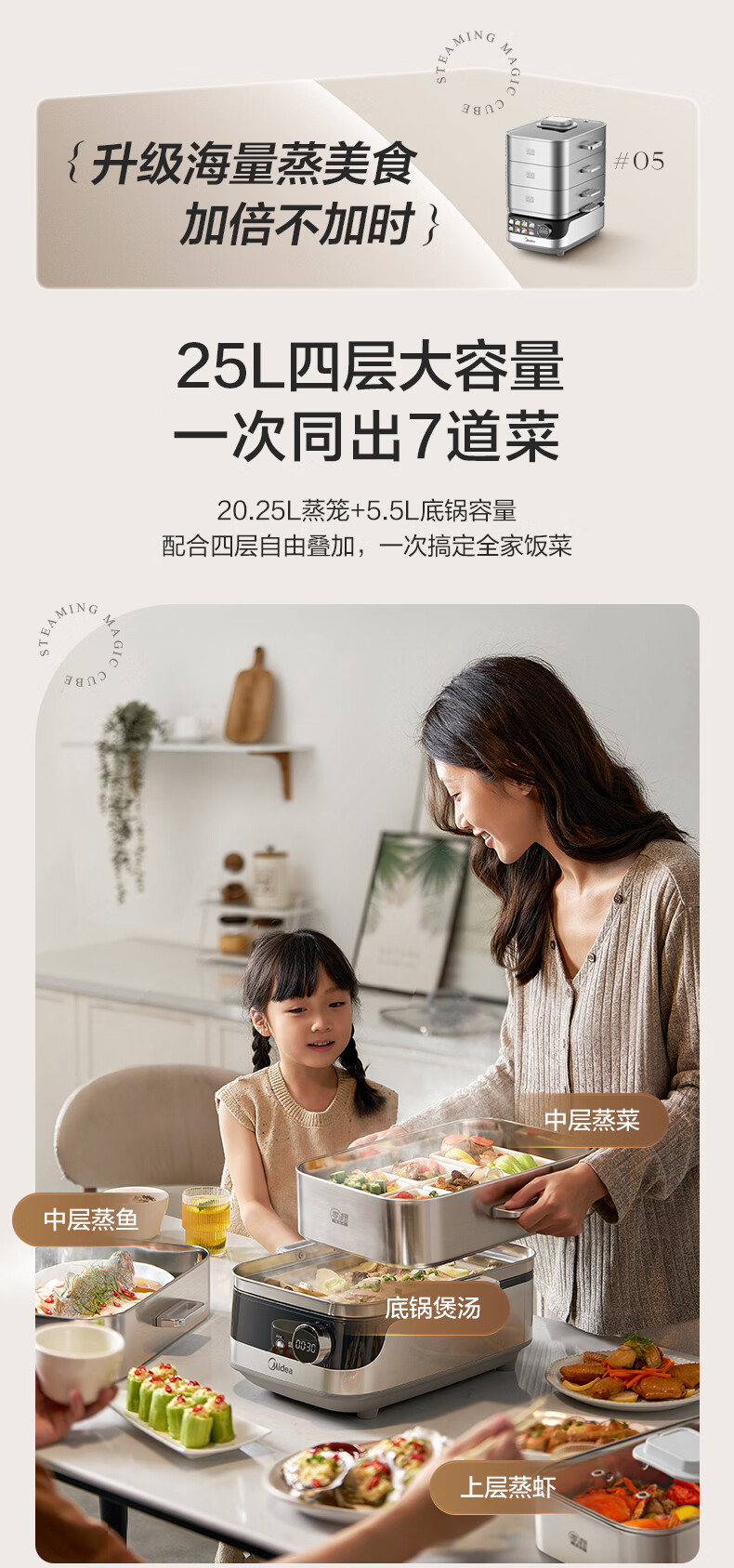 美的(Midea)蒸魔方0涂层电蒸锅炖蒸煮一体多功能锅 304不锈钢可拆洗 大容量家用4-10人蒸煮锅 25L 新升级-四层0涂层不锈钢