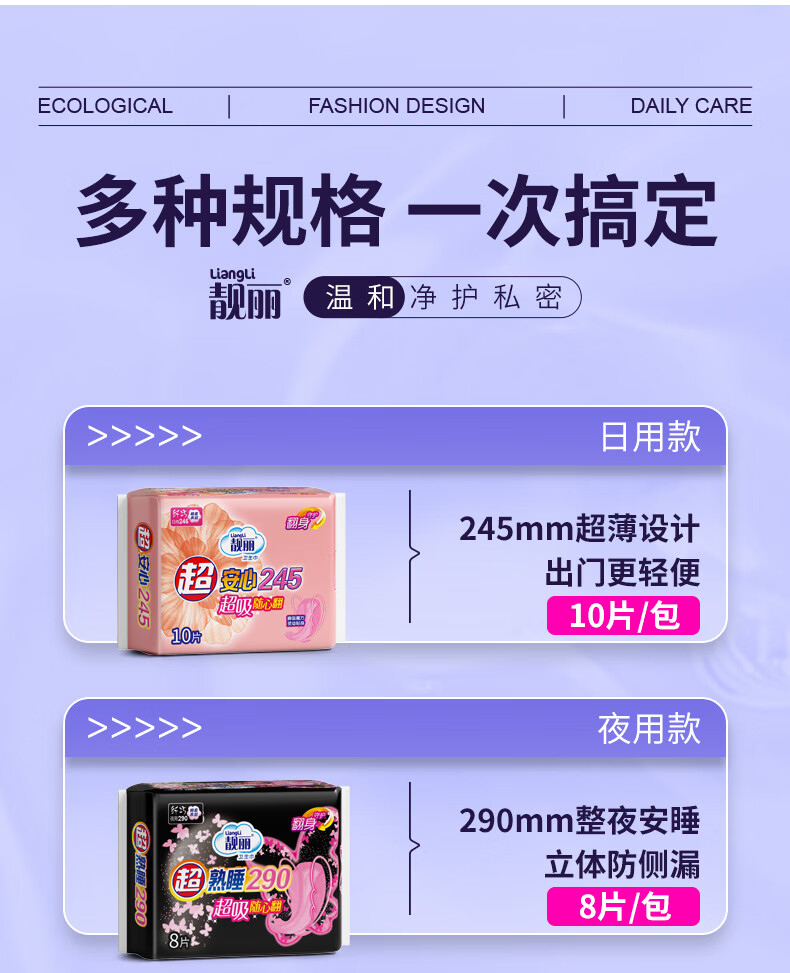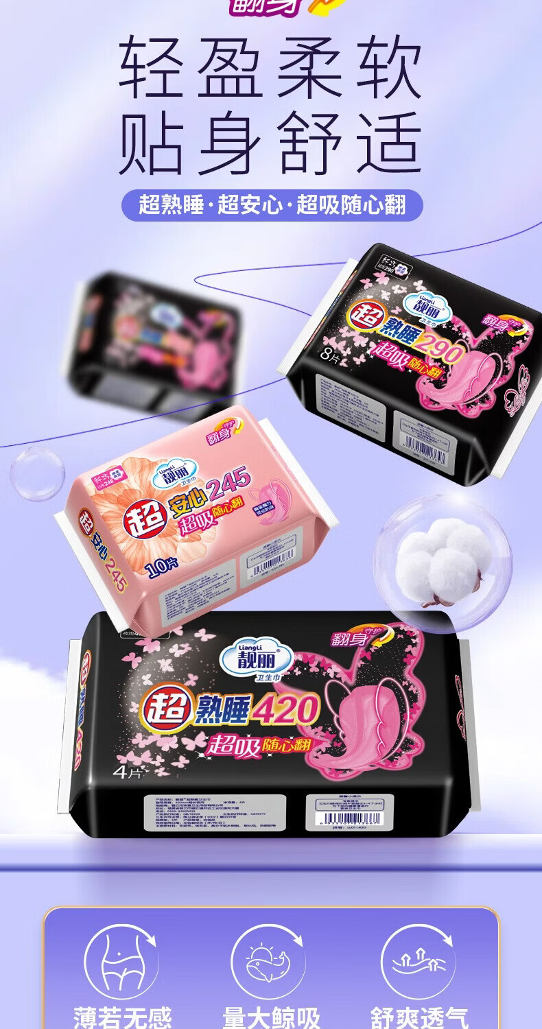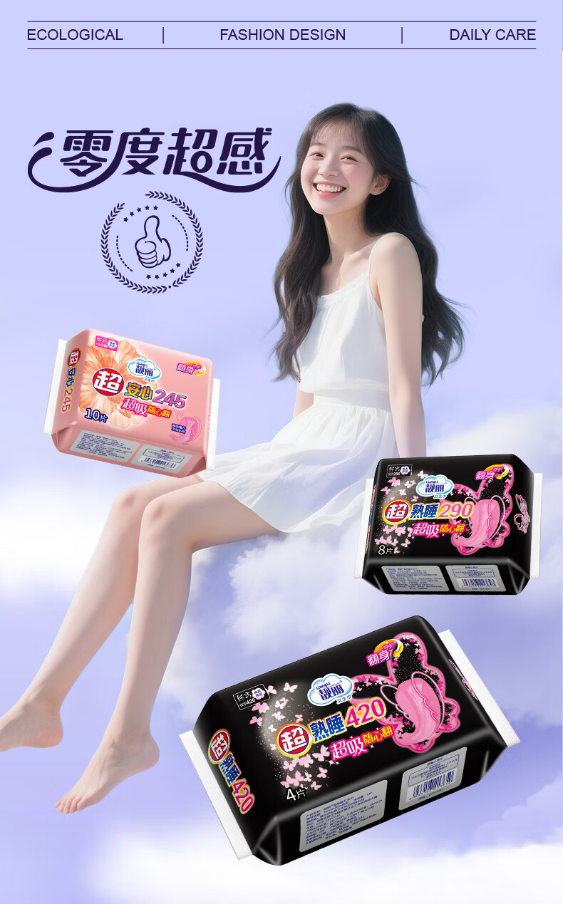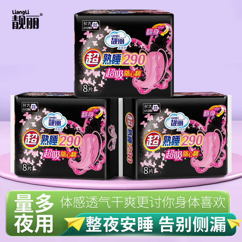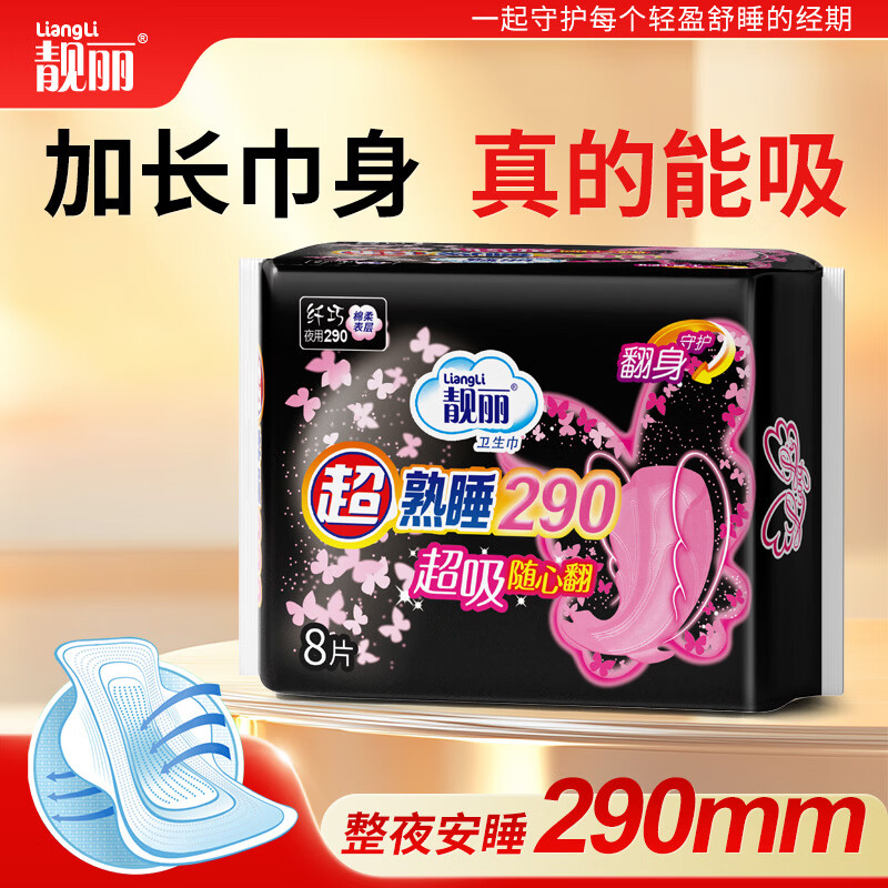 【新国标】超熟睡卫生巾靓丽290夜用棉柔干爽自营包邮姨妈女防漏 棉柔 290mm 8片 绵柔卫生巾