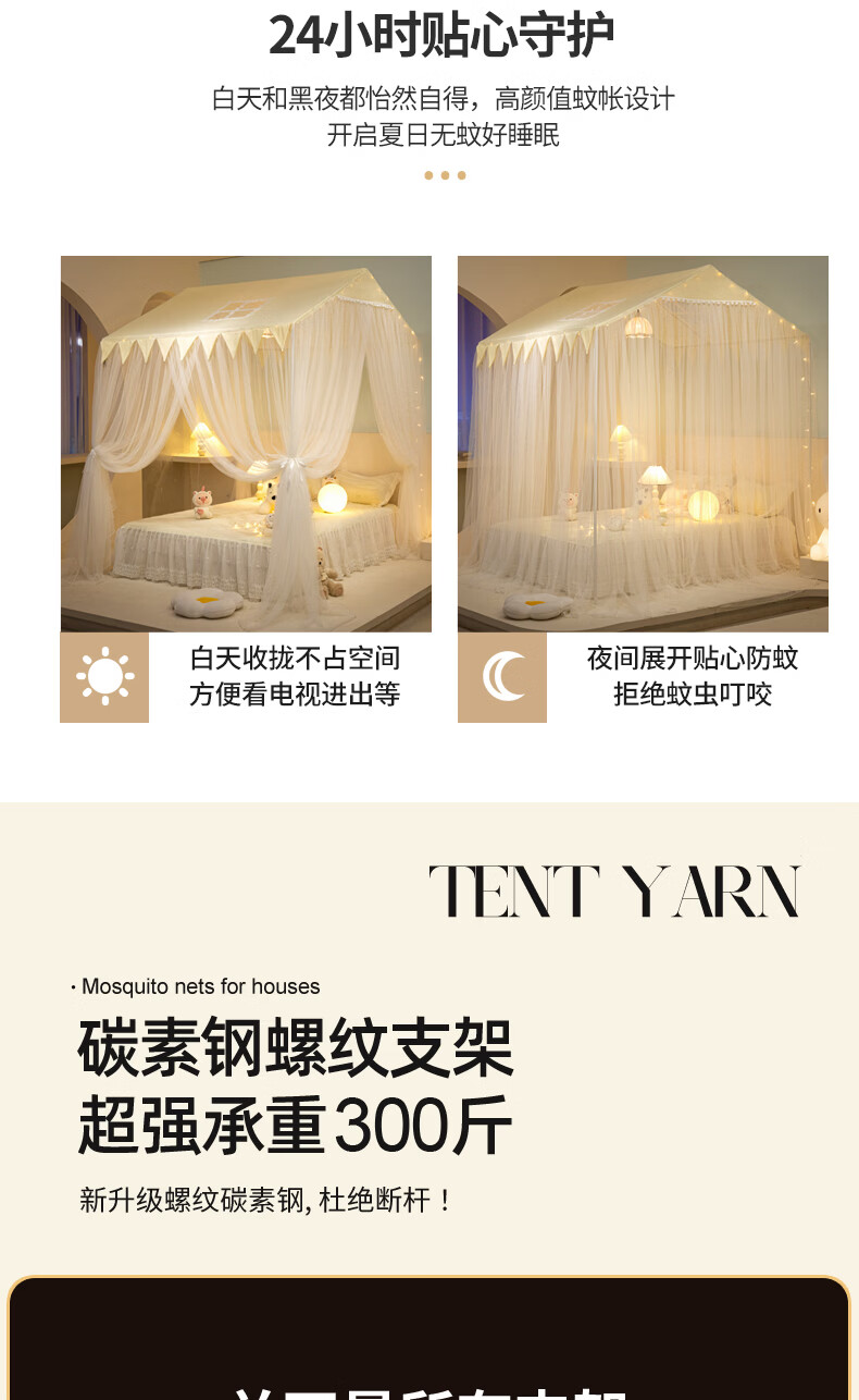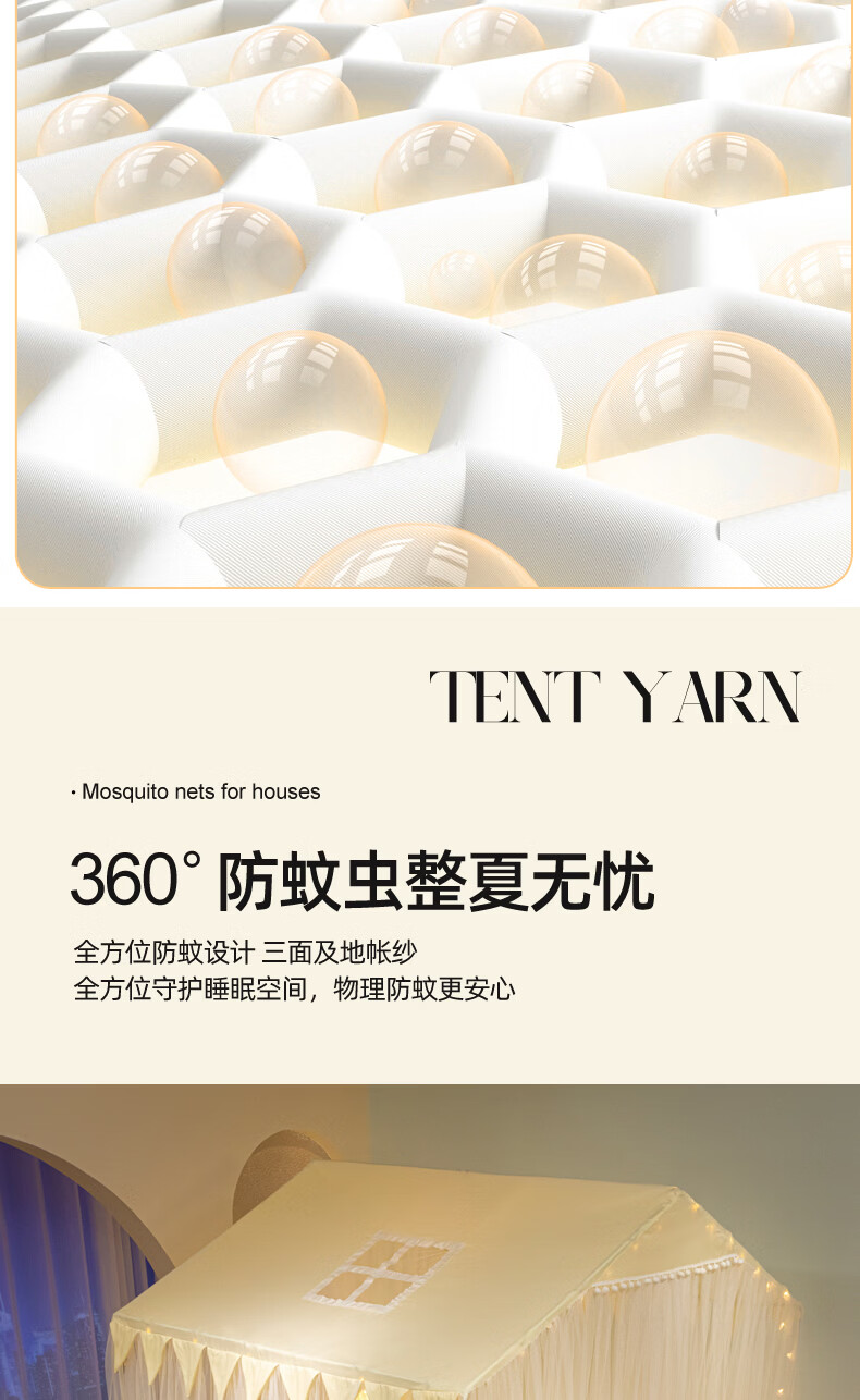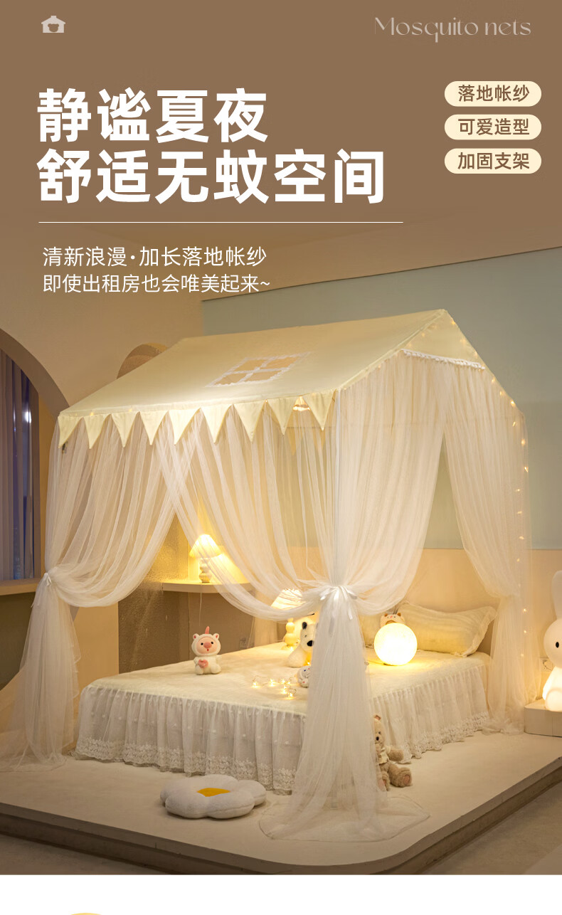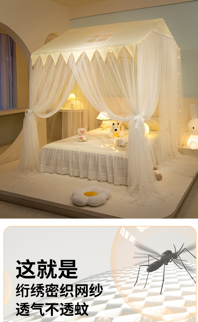 无印良品防摔蚊帐1.8x2米家用一体式免安装防蚊儿童防掉卧室全包底三开门 米色【防蚊防摔 一体式免安装】 200cm*180cm*170cm 适用于1.8米床【一体式免安装支架】