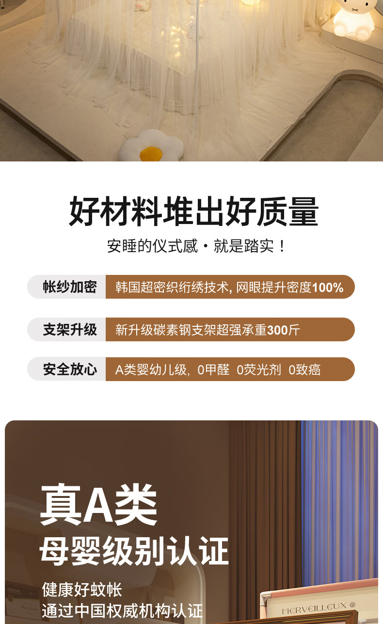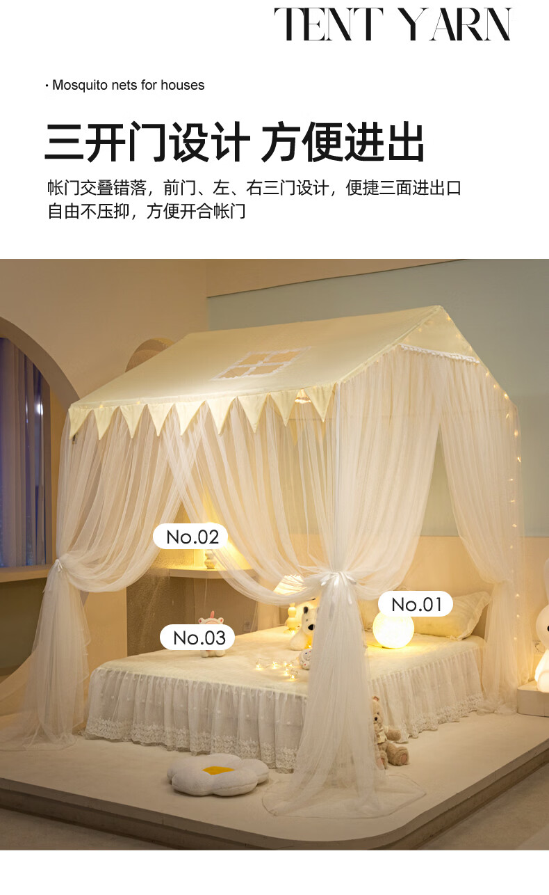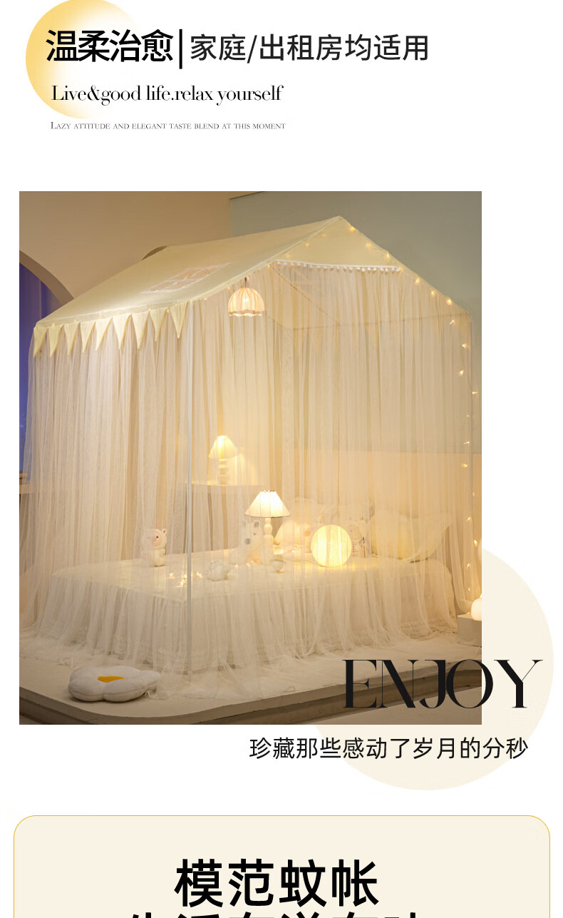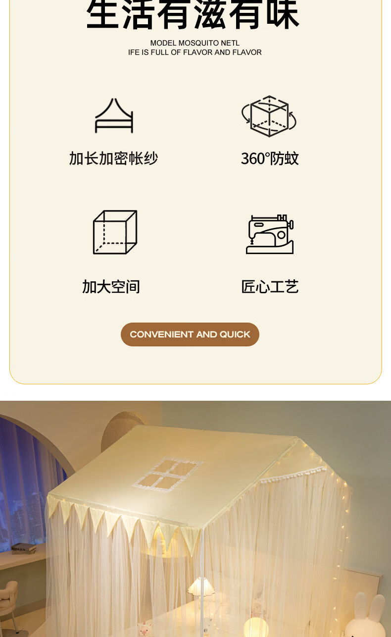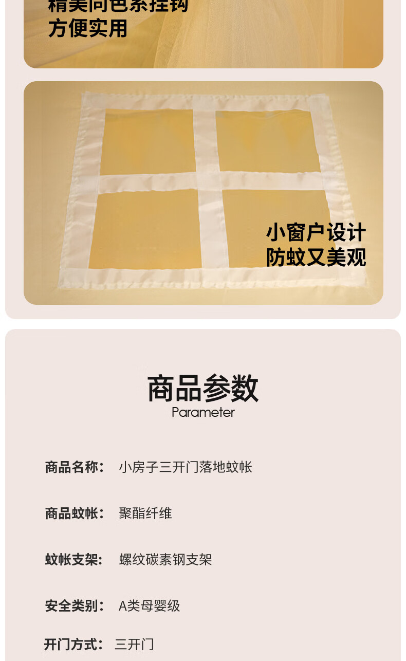 无印良品防摔蚊帐1.8x2米家用一体式免安装防蚊儿童防掉卧室全包底三开门 米色【防蚊防摔 一体式免安装】 200cm*180cm*170cm 适用于1.8米床【一体式免安装支架】