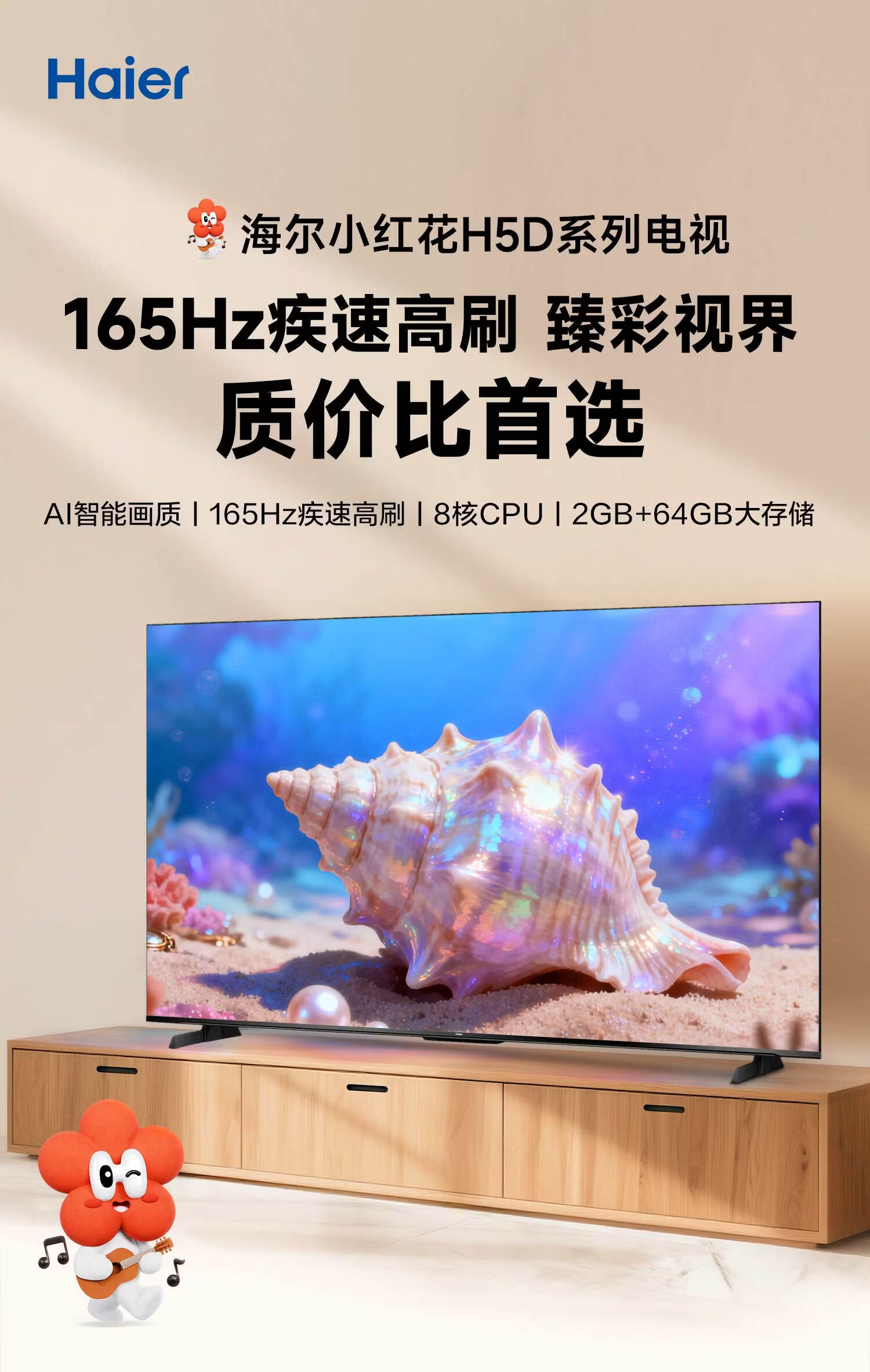 海尔【小红花电视-绽放版】品质款电视85H5D 85英寸165Hz 130%高色域64GB 4K游戏护眼1级能效H5C升级版