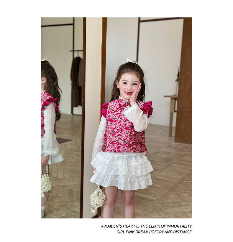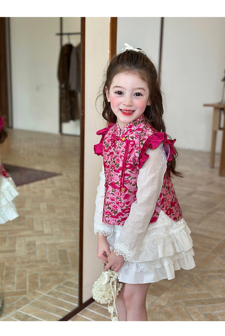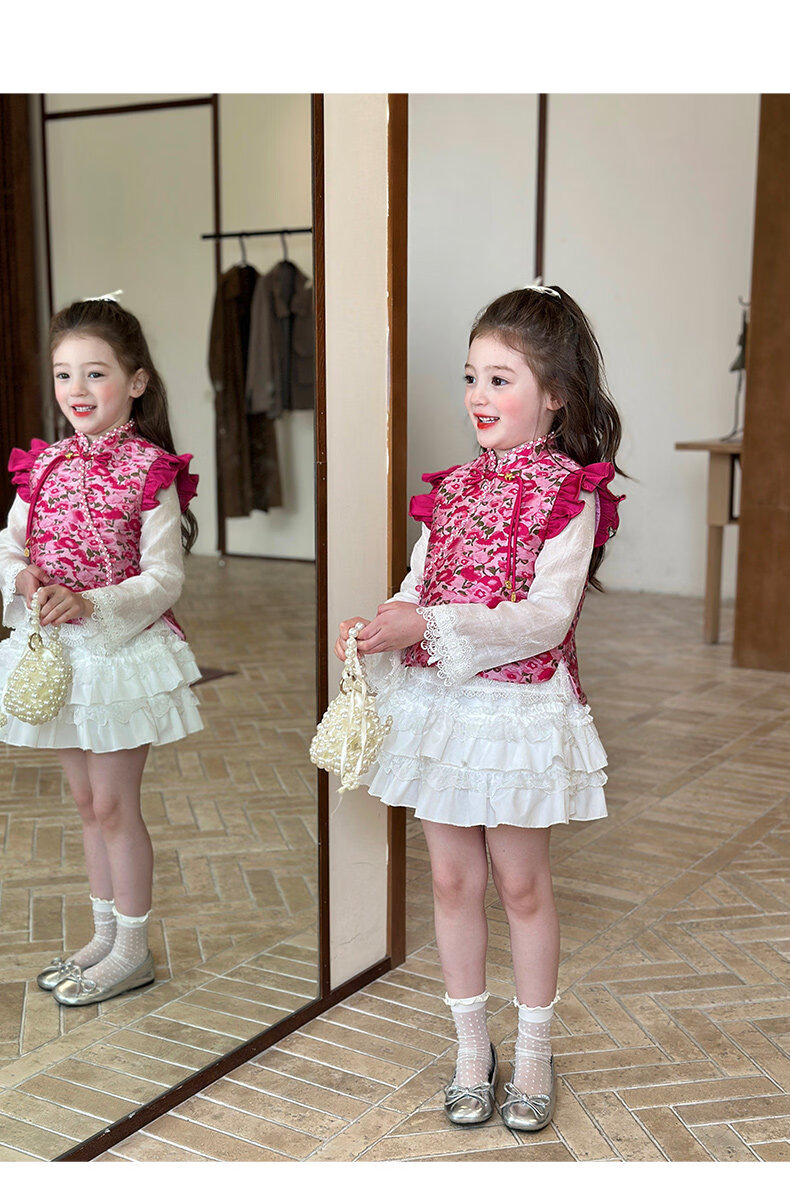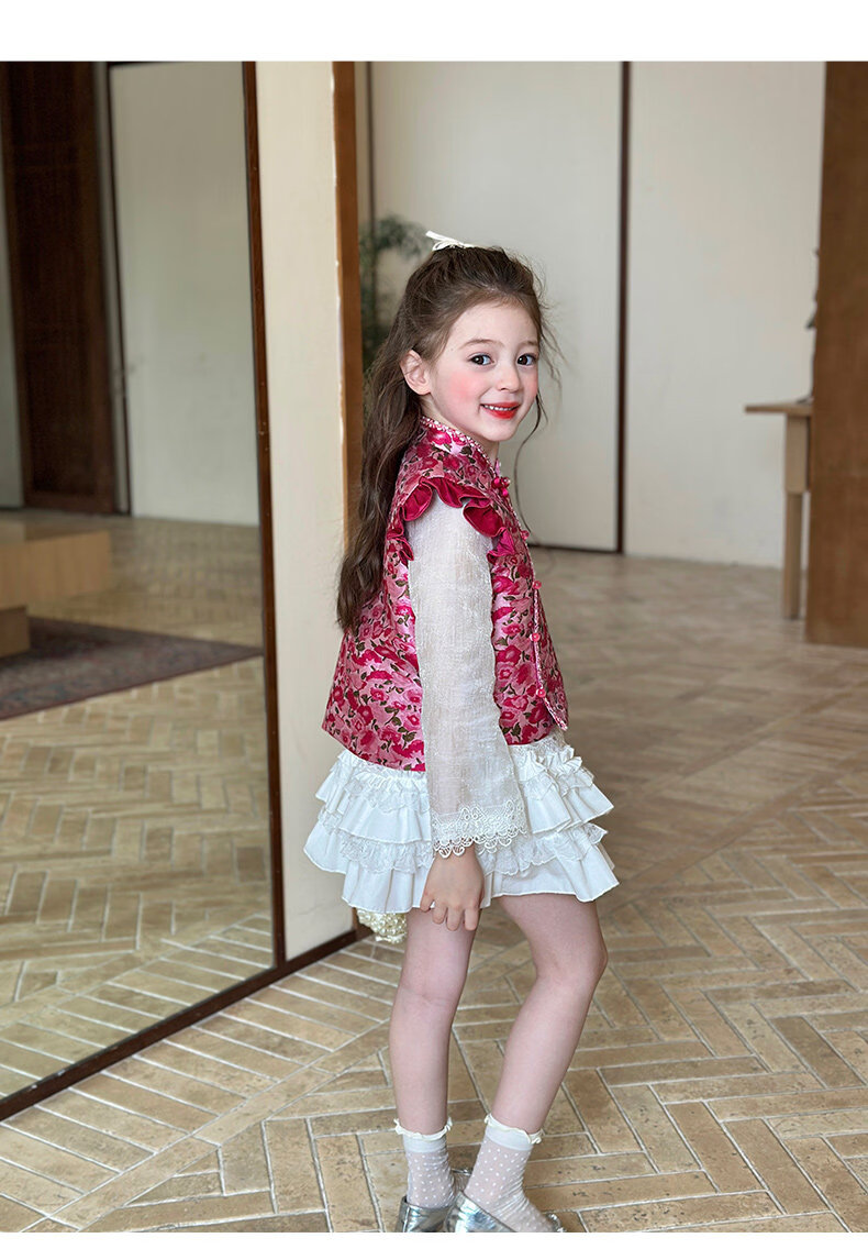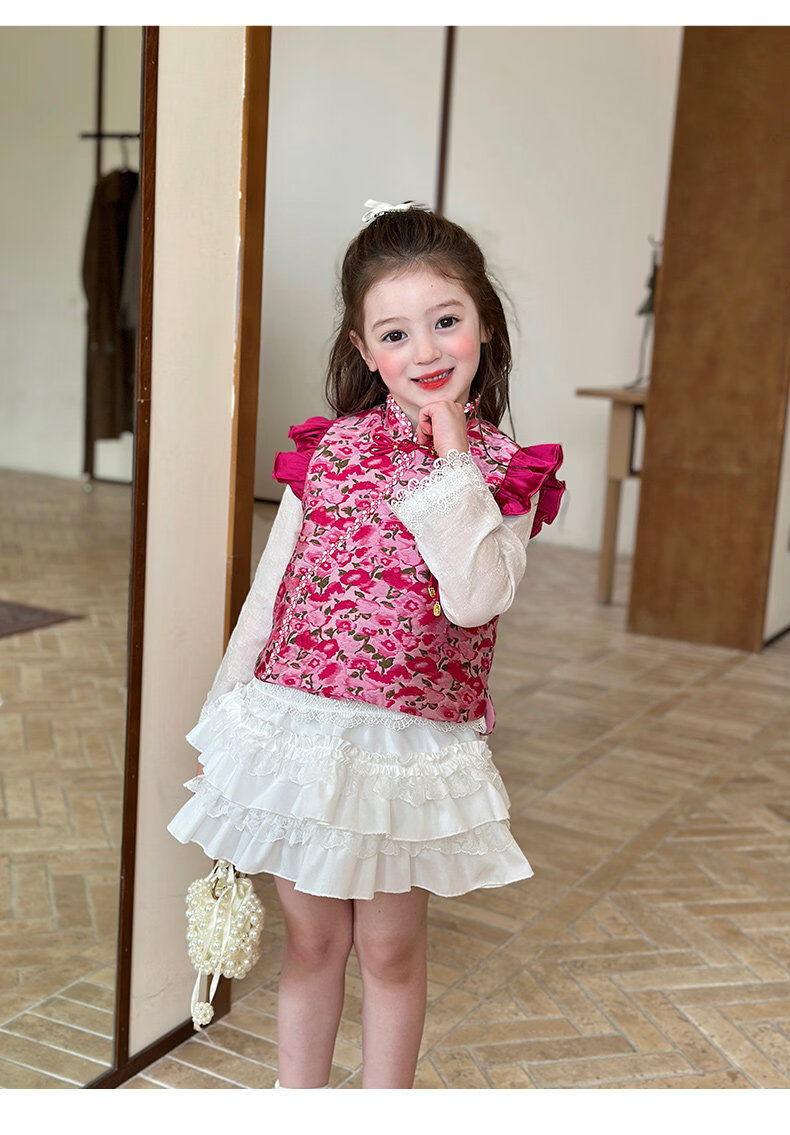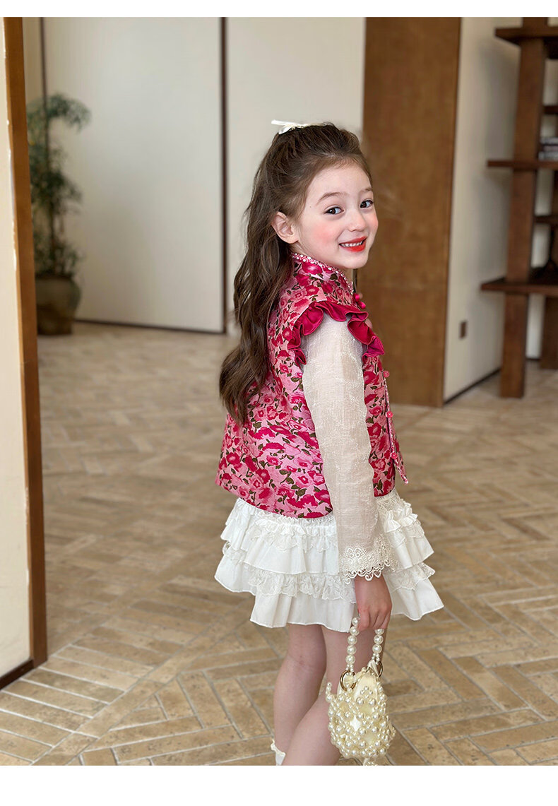 栀了成长记童装女童红色国风套装2025冬季儿童新年夹棉马甲两件套 红色 套装 100 cm