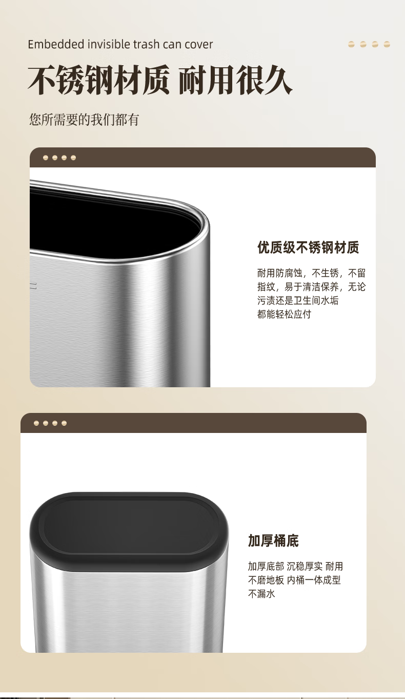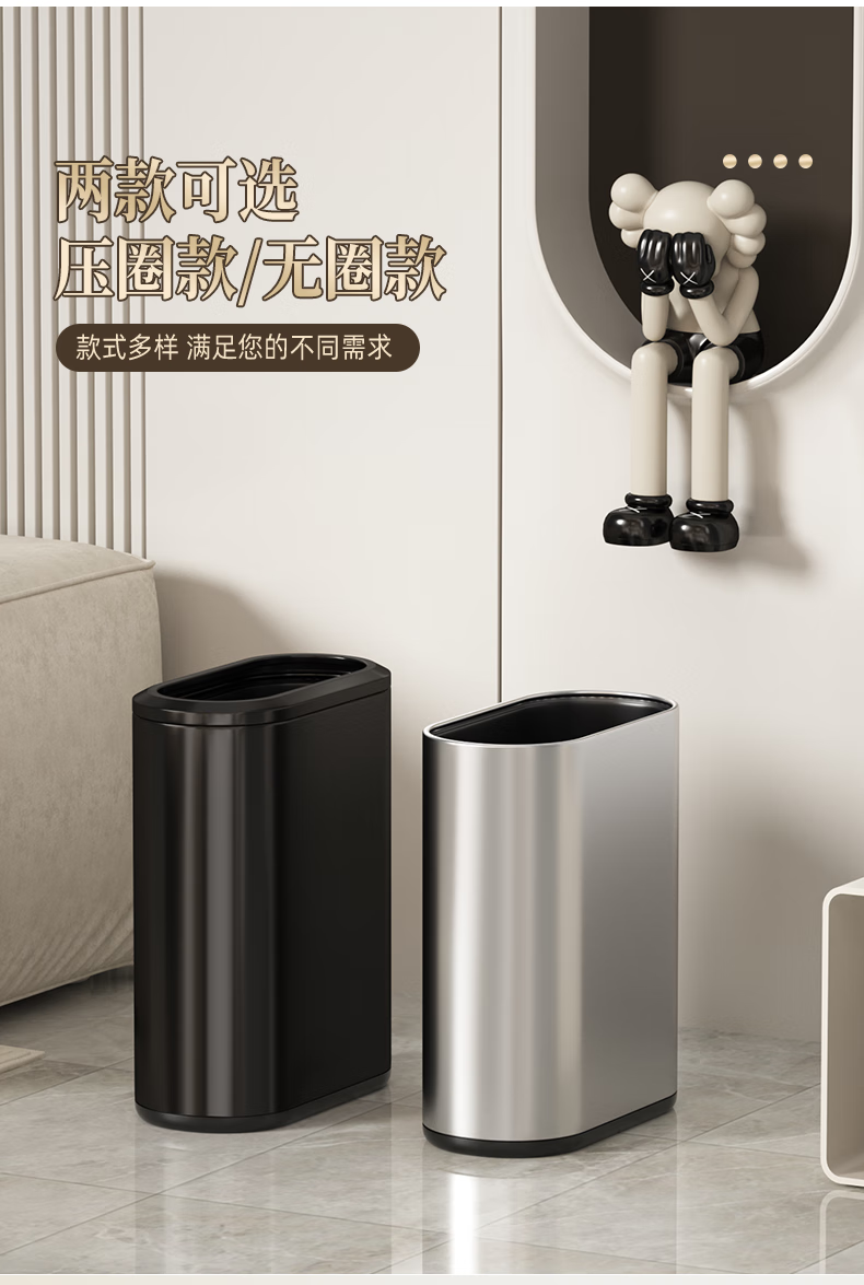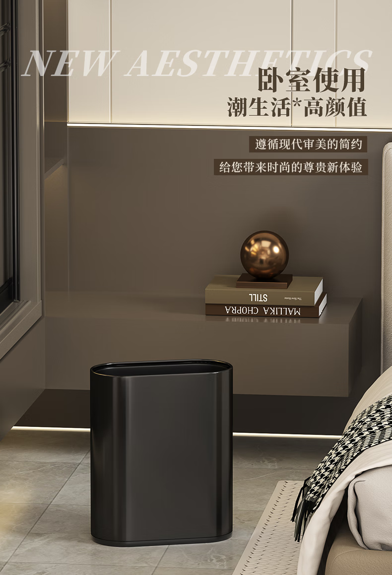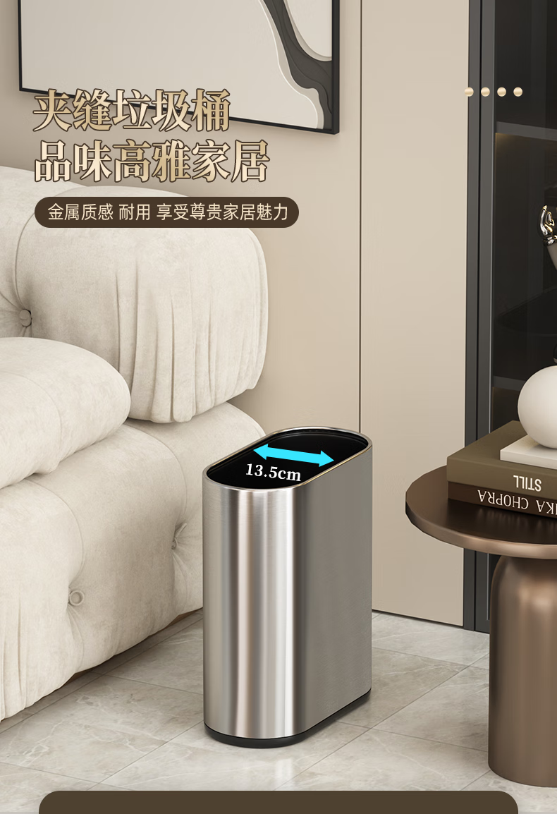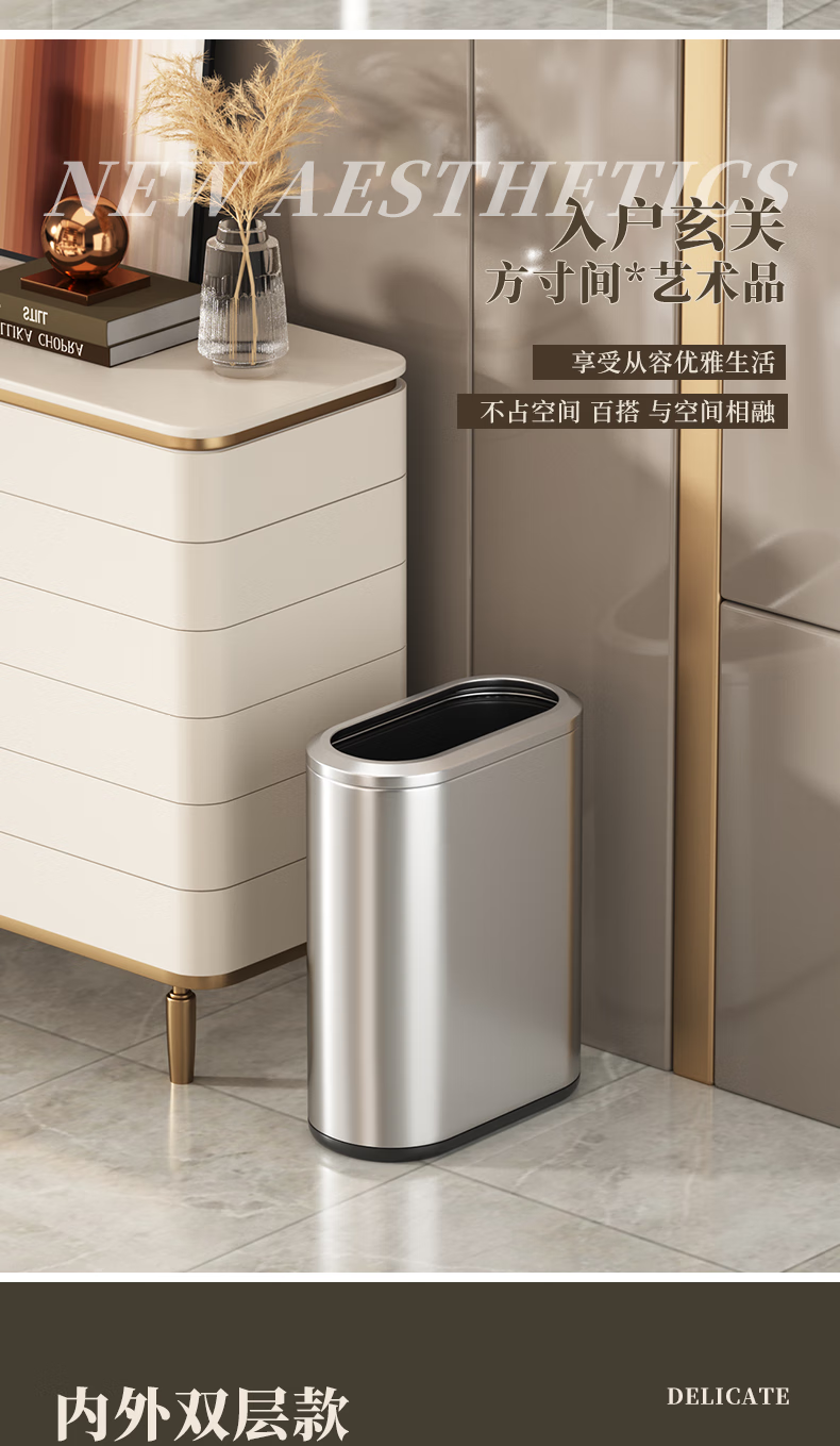 帝梵卫生间垃圾桶家用按压式窄款高颜值小型夹缝不锈钢厕所意式极简风 7L-香槟金【按压款】